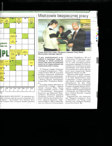 • ••- w»/>»anii •metal, -T .a. 9 mate liabela f T slynnj rola Sylvestra Stallone 16 v~ Mistrzowie bezpiecznej pracy obszar symbol o*wiaty ,T T 13 10 12 ydzieh nasna [PL Mklub krownia par6w rosyjski myshwiec >• wn± dusiclel + 4 4 11 r mtaato i port rtad Renem zt>9dny ci^ai strona tutowta »• T Krasomdwstwo Prezes WUG Piotr Litwa i Okregowy Inspektor Pracy Beata Marynowska wreczaj^ nagrody. ' T czk>n«k komisji 3 ^ T nfizgu kjb na drzewte OtHfd 1 2 T tocznle »• M0> 6 He za ugiem t» 18 listwo stolic* >• w wkwie 11 | 12 13 14 15 16 17 18 18. IE M4 ZIARNA BEZ PLEWY". Za nadeslanie prawych rozwia^zan nagrod? rzeczowq. otrzymuja; Doa Hakuba z Tarnowskich Gor, Krystyna Perec wa i Grzegorz Tatar z Cieszyna. Ksiazki nadeslemy 15 proc. poszkodowanych w wypadkach w kopalniach w^gla kamiennego to mtodzi pracownicy, ktorych staz pracy nie przekracza dwoch lat. Im wi$cej edukacji, tym bezpiecznie] potem w pracy. i Dawidowi Wycislikowi z ZS nr 2 w Katowicach. W pierwszym etapie konkursu bhp uczestniczyli uczniowie 21 szkol ponadgimnazjalnych wojewodzt\va sl^skiego. Do finahi zakwalifikowano dwuosobowe druzyny reprezentuj^ce szesc szkol. KonkurW Wyzszym Urz^dzie Gorniczym sowy pisemny test z zakresu bhp oraz 18 listopada podsumowano I Woje- prawa. pracy przygotowaly Sla_skie wodzki Konkurs BHP dla przyszfych Kuratorium Oswiaty oraz PIP. gornikow eksploatacji podziemnej Ogloszono takze wyniki w konkuri technikow gornictwa podziemnego. sie plastycznym na plakat nawi^zuja,Pierwsze miejsce zdobyli Rafal Kucza cy do hasla ,,Bezpieczenstwo pracy i Mateusz Parzych, reprezentuja_cy w gornictwie". I miejsce zdobyl Dadruzyn^ ZSZ z Wodzislawia Sl^skie- mian Kuznik z Zespohi Szkol Ogolnoksztalca^cych im. Jana Pawla g°\a drugim miejscu uplasowali si^ n w Pawlowicach. Dwa rownorz^dne uczniowie ZS w Libia,zu - Mateusz n miejsca przypadty Jakubowi KrawChwala i Stanislaw Wetaa. Trzecie czykowi i Rafalowi Cieslinskiemu miejsce przypadlo uczniom z ZSP z Zespolu Szkol Ponadgimnazjalnych w Ornontowicach: Krzysztofowi z Ornontowic oraz Lukaszowi Paj^Krymerowi oraz Mariuszowi Wojta- kowi i Pawlowi Szczerbie z Zespolu nowiczowi, Wyroznienia przyznano Szkol w Libi^zu. Gracjanow Grossowi i Robertovii Organizatorami obu konkursow Piesze z ZSO im. Jana Pawla n z Paw- byly Okregowy Inspektorat Pracy lowic, Adamowi Kocurowi i Mate- w Katowicach oraz Wyzszy Urza.d uszowi Kulijowi z ZSP 3 z Rudy Slq- Gorniczy, prz)' wspolpracy Sl^skiego skiei nra? AHamowi Wvhranc7.vkowi Knratoriiim Oswiatv. BE