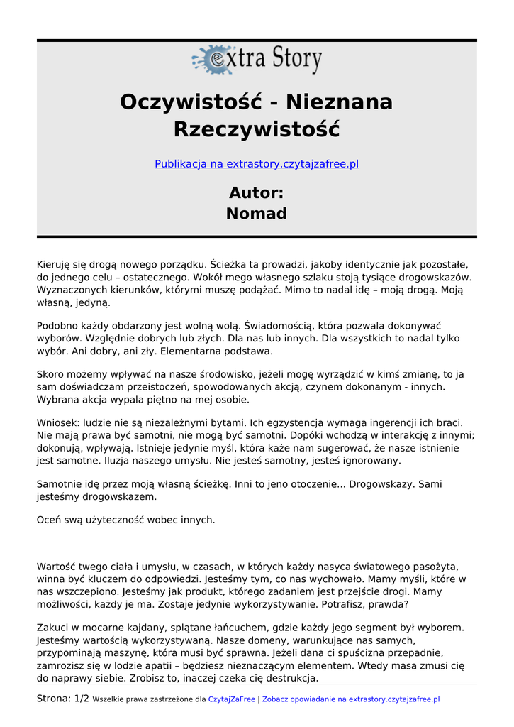 Oczywistość - Nieznana Rzeczywistość Publikacja na extrastory.czytajzafree.pl Autor: Nomad Kieruję się drogą nowego porządku. Ścieżka ta prowadzi, jakoby identycznie jak pozostałe, do jednego celu – ostatecznego. Wokół mego własnego szlaku stoją tysiące drogowskazów. Wyznaczonych kierunków, którymi muszę podążać. Mimo to nadal idę – moją drogą. Moją własną, jedyną. Podobno każdy obdarzony jest wolną wolą. Świadomością, która pozwala dokonywać wyborów. Względnie dobrych lub złych. Dla nas lub innych. Dla wszystkich to nadal tylko wybór. Ani dobry, ani zły. Elementarna podstawa. Skoro możemy wpływać na nasze środowisko, jeżeli mogę wyrządzić w kimś zmianę, to ja sam doświadczam przeistoczeń, spowodowanych akcją, czynem dokonanym - innych. Wybrana akcja wypala piętno na mej osobie. Wniosek: ludzie nie są niezależnymi bytami. Ich egzystencja wymaga ingerencji ich braci. Nie mają prawa być samotni, nie mogą być samotni. Dopóki wchodzą w interakcję z innymi; dokonują, wpływają. Istnieje jedynie myśl, która każe nam sugerować, że nasze istnienie jest samotne. Iluzja naszego umysłu. Nie jesteś samotny, jesteś ignorowany. Samotnie idę przez moją własną ścieżkę. Inni to jeno otoczenie... Drogowskazy. Sami jesteśmy drogowskazem. Oceń swą użyteczność wobec innych. Wartość twego ciała i umysłu, w czasach, w których każdy nasyca światowego pasożyta, winna być kluczem do odpowiedzi. Jesteśmy tym, co nas wychowało. Mamy myśli, które w nas wszczepiono. Jesteśmy jak produkt, którego zadaniem jest przejście drogi. Mamy możliwości, każdy je ma. Zostaje jedynie wykorzystywanie. Potrafisz, prawda? Zakuci w mocarne kajdany, splątane łańcuchem, gdzie każdy jego segment był wyborem. Jesteśmy wartością wykorzystywaną. Nasze domeny, warunkujące nas samych, przypominają maszynę, która musi być sprawna. Jeżeli dana ci spuścizna przepadnie, zamrozisz się w lodzie apatii – będziesz nieznaczącym elementem. Wtedy masa zmusi cię do naprawy siebie. Zrobisz to, inaczej czeka cię destrukcja. Strona: 1/2 Wszelkie prawa zastrzeżone dla CzytajZaFree | Zobacz opowiadanie na extrastory.czytajzafree.pl Musimy być fabryką działającą. Dla innych. Idąc przez trakt tobie nieznany, będącym kopią wszystkich innych, napotkasz różne znaki. Zrozumiesz, że części ich nie pojmiesz. Wtedy zatrzymasz się, ale nieustannie będziesz zmierzać ku ostateczności. Część kontrolowana przez ciebie zastygnie, lecz twe istnienie, twój byt, będzie zbliżać się. Znasz wagę nauczycieli. Sam nim jesteś, sam ich widzisz. Uczysz się od nich. Wskazują ci, jak powinieneś iść, coby świadomie przejść ścieżkę. Uformowali cię, cobyś dał sobie radę w nieskończonej pętli porządku. Zawsze są, nawet teraz. Ale żaden mentor nie pokona drogi za ciebie. Rady są niczym, jeżeli nie użyjesz ich. Zapewne większością twego istnienia rządzi przypadek. Jesteś większością, jak ja. Uważasz, że każdy człowiek jest wyjątkową kroplą? Wszyscy pochodzimy z tej samej wody, dlaczego mielibyśmy się różnić? Replikantami, którzy wyłącznie w swoich oczach widzą to, co dane jest im zobaczyć. A widzimy to, co chcemy ujrzeć. Dla wszystkich jesteśmy masą. Liczy się to w czym jesteś zanieczyszczony. Nie ma takiej samej, identycznej mieszaniny wyborów. Dlatego istnieją drogowskazy. Nie drogowskaz. *** Czemu więc pytam o drogę? Koniec Strona: 2/2 Wszelkie prawa zastrzeżone dla CzytajZaFree | Zobacz opowiadanie na extrastory.czytajzafree.pl