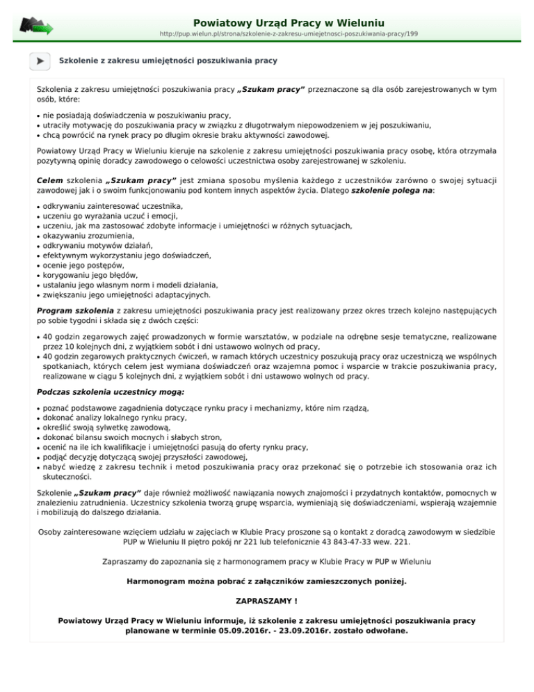 Powiatowy Urząd Pracy w Wieluniu http://pup.wielun.pl/strona/szkolenie-z-zakresu-umiejetnosci-poszukiwania-pracy/199 Szkolenie z zakresu umiejętności poszukiwania pracy Szkolenia z zakresu umiejętności poszukiwania pracy „Szukam pracy” przeznaczone są dla osób zarejestrowanych w tym osób, które: ● ● ● nie posiadają doświadczenia w poszukiwaniu pracy, utraciły motywację do poszukiwania pracy w związku z długotrwałym niepowodzeniem w jej poszukiwaniu, chcą powrócić na rynek pracy po długim okresie braku aktywności zawodowej. Powiatowy Urząd Pracy w Wieluniu kieruje na szkolenie z zakresu umiejętności poszukiwania pracy osobę, która otrzymała pozytywną opinię doradcy zawodowego o celowości uczestnictwa osoby zarejestrowanej w szkoleniu. Celem szkolenia „Szukam pracy” jest zmiana sposobu myślenia każdego z uczestników zarówno o swojej sytuacji zawodowej jak i o swoim funkcjonowaniu pod kontem innych aspektów życia. Dlatego szkolenie polega na: ● ● ● ● ● ● ● ● ● ● odkrywaniu zainteresować uczestnika, uczeniu go wyrażania uczuć i emocji, uczeniu, jak ma zastosować zdobyte informacje i umiejętności w różnych sytuacjach, okazywaniu zrozumienia, odkrywaniu motywów działań, efektywnym wykorzystaniu jego doświadczeń, ocenie jego postępów, korygowaniu jego błędów, ustalaniu jego własnym norm i modeli działania, zwiększaniu jego umiejętności adaptacyjnych. Program szkolenia z zakresu umiejętności poszukiwania pracy jest realizowany przez okres trzech kolejno następujących po sobie tygodni i składa się z dwóch części: ● ● 40 godzin zegarowych zajęć prowadzonych w formie warsztatów, w podziale na odrębne sesje tematyczne, realizowane przez 10 kolejnych dni, z wyjątkiem sobót i dni ustawowo wolnych od pracy, 40 godzin zegarowych praktycznych ćwiczeń, w ramach których uczestnicy poszukują pracy oraz uczestniczą we wspólnych spotkaniach, których celem jest wymiana doświadczeń oraz wzajemna pomoc i wsparcie w trakcie poszukiwania pracy, realizowane w ciągu 5 kolejnych dni, z wyjątkiem sobót i dni ustawowo wolnych od pracy. Podczas szkolenia uczestnicy mogą: ● ● ● ● ● ● ● poznać podstawowe zagadnienia dotyczące rynku pracy i mechanizmy, które nim rządzą, dokonać analizy lokalnego rynku pracy, określić swoją sylwetkę zawodową, dokonać bilansu swoich mocnych i słabych stron, ocenić na ile ich kwalifikacje i umiejętności pasują do oferty rynku pracy, podjąć decyzję dotyczącą swojej przyszłości zawodowej, nabyć wiedzę z zakresu technik i metod poszukiwania pracy oraz przekonać się o potrzebie ich stosowania oraz ich skuteczności. Szkolenie „Szukam pracy” daje również możliwość nawiązania nowych znajomości i przydatnych kontaktów, pomocnych w znalezieniu zatrudnienia. Uczestnicy szkolenia tworzą grupę wsparcia, wymieniają się doświadczeniami, wspierają wzajemnie i mobilizują do dalszego działania. Osoby zainteresowane wzięciem udziału w zajęciach w Klubie Pracy proszone są o kontakt z doradcą zawodowym w siedzibie PUP w Wieluniu II piętro pokój nr 221 lub telefonicznie 43 843-47-33 wew. 221. Zapraszamy do zapoznania się z harmonogramem pracy w Klubie Pracy w PUP w Wieluniu Harmonogram można pobrać z załączników zamieszczonych poniżej. ZAPRASZAMY ! Powiatowy Urząd Pracy w Wieluniu informuje, iż szkolenie z zakresu umiejętności poszukiwania pracy planowane w terminie 05.09.2016r. - 23.09.2016r. zostało odwołane.