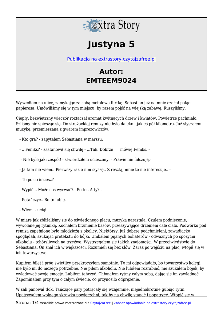 Justyna 5 Publikacja na extrastory.czytajzafree.pl Autor: EMTEEM9024 Wyszedłem na ulicę, zamykając za sobą metalową furtkę. Sebastian już na mnie czekał paląc papierosa. Umówiliśmy się w tym miejscu, by razem pójść na wiejską zabawę. Ruszyliśmy. Ciepły, bezwietrzny wieczór roztaczał aromat kwitnących drzew i kwiatów. Powietrze pachniało. Szliśmy nie spiesząc się. Do strażackiej remizy nie było daleko - jakieś pół kilometra. Już słyszałem muzykę, przemieszaną z gwarem imprezowiczów. - Kto gra? - zapytałem Sebastiana w marszu. - .. Feniks? - zastanowił się chwilę - ...Tak. Dobrze mówię.Feniks. - - Nie byle jaki zespół! - stwierdziłem ucieszony. - Prawie nie fałszują.- Ja tam nie wiem.. Pierwszy raz o nim słyszę.. Z resztą, mnie to nie interesuje.. - To po co idziesz? - Wypić... Może coś wyrwać?.. Po to.. A ty? - Potańczyć.. Bo to lubię. - Wiem. - uciął. W miarę jak zbliżaliśmy się do oświetlonego placu, muzyka narastała. Czułem podniecenie, wywołane jej rytmiką. Kochałem brzmienie basów, przeszywające drżeniem całe ciało. Podwórko pod remizą zapełnione było młodzieżą z okolicy. Niektórzy, już dobrze podchmieleni, zawadiacko spoglądali, szukając pretekstu do bójki. Unikałem pijanych bohaterów - odważnych po spożyciu alkoholu - tchórzliwych na trzeźwo. Wystrzegałem się takich znajomości. W przeciwieństwie do Sebastiana. On znał ich w większości. Rozumieli się bez słów. Zaraz po wejściu na plac, wtopił się w ich towarzystwo. Kupiłem bilet i próg świetlicy przekroczyłem samotnie. To mi odpowiadało, bo towarzystwo kolegi nie było mi do niczego potrzebne. Nie piłem alkoholu. Nie lubiłem rozrabiać, nie szukałem bójek, by wyładować swoje emocje. Lubiłem tańczyć. Chłonąłem rytmy całym sobą, dając się im zawładnąć. Zapominałem przy tym o całym świecie, co przynosiło odprężenie. W sali panował tłok. Tańczące pary potrącały się wzajemnie, niejednokrotnie gubiąc rytm. Upatrywałem wolnego skrawka powierzchni, tak by na chwilę stanąć i popatrzeć. Wtopić się w Strona: 1/4 Wszelkie prawa zastrzeżone dla CzytajZaFree | Zobacz opowiadanie na extrastory.czytajzafree.pl klimat. Przeciskając się pomiędzy tańczącymi, przeszedłem na drugą stronę sali. Tam było trochę luzu. Patrzyłem po twarzach, gestami pozdrawiając znajomych odnalezionych w tłumie. Wypatrywałem Justyny. Miałem pewność, że tu jest. Błyskające kolorofony i światło stroboskopu utrudniały obserwację. Dopiero kiedy muzyka ucichła widok uległ zmianie. Rozluźniło się. Część osób skorzystała z ławek, rozmieszczonych wzdłuż ścian. Inni wyszli na powietrze by ochłonąć. Justyna usiadła na ławce. Dostrzegłem ją. Ucieszony, czekałem na muzykę - pretekst do nawiązania znajomości. Kiedy zabrzmiał pierwszy akord, ruszyłem z miejsca, by nikt inny mnie nie ubiegł. - Zatańczysz? - pochyliłem się grzecznie, wyciągając rękę. - Chętnie.. - uśmiechnęła się. Podała dłoń. Uchwyciłem ją, niczym cenny klejnot. Tańczyliśmy.Trzymałem ją delikatnie w pasie i byłem blisko. Czułem jej zapach i ciepło ciała. Wpatrzony w nią, jak w najpiękniejszy obraz, odbijający kolorowe błyski iluminacji - byłem szczęśliwy. Justyna co chwilę spoglądała w moją twarz, uśmiechając się, potem uciekała spojrzeniem. Odwzajemniałem uśmiech. Wyglądała ślicznie. Uczesane, rude włosy, spływały na ramiona dotykając białej bluzki. Obsypane delikatnie brylantyną, mieniły się kolorowo w błyskach świateł. Ta chwila mogła by trwać wiecznie. Tym czasem, utwór zmierzał do zakończenia. Rozgrzane żelazo tkwiło w moich dłoniach, musiałem je szybko kuć, by nie wystygło. Dźwięki umilkły. Nie puściłem dłoni Justyny. - Chcę z tobą pogadać. - wyznałem w prost. - Tutaj? - zapytała nieco zdziwiona. - Wyjdziemy... - gestem głowy wskazałem drzwi. Wahała się chwilę, ale ruszyła w tę stronę, ciągnąc mnie za sobą. - Mów... - odezwała się już na placu przed budynkiem. - Przejdźmy się.. - proponowałem. Znowu się wahała. - Właściwie... To dobry pomysł... Trochę ochłonę - gorąco na sali... Dokąd? - Może na tamę? - nieśmiało wyznaczyłem cel. Zgodziła się. Szliśmy powoli, obok siebie, ulicą w tym kierunku. Poświata księżyca rozświetlała drogę. Nadal trzymałem jej dłoń i nie zamierzałem puścić. Nie protestowała. Zastanawiałem się jak zacząć rozmowę. - O czym chciałeś porozmawiać? - pierwsza przerwała milczenie. - To trudne... - zacząłem - ... Mam na imię Mirek.. - Wiem jak masz na imię... - wtrąciła - Ja nazywam się Justyna...Miło mi. - Mi również... - I co dalej? - zaśmiała się - Nie było odpowiedniej okazji, żeby z tobą porozmawiać... - mówiłem - ...Bardzo mi się podobasz...Chciałbym się z tobą spotykać... Strona: 2/4 Wszelkie prawa zastrzeżone dla CzytajZaFree | Zobacz opowiadanie na extrastory.czytajzafree.pl - Nie nabijasz się? - zapytała podejrzliwie. - Nie ... - To dlaczego nie powiedziałeś mi tego wcześniej? - Kiedy?... Na przystanku?... - Chociażby? - Dla mnie to trudne... Wstydziłem się... Poważnie.. Zeszliśmy z ulicy, wstępując na wydeptaną, ale słabo widoczną ścieżkę prowadzącą wprost do zapory. Zroszona trawa łąki, ocierała się o nasze buty i nogawki spodni, mocząc je. - Idź przodem. - przytrzymałem się, by puścić ją przodem. W powietrzu wyczuwałem zapach rzeki. Wilgoć powodowała odczucie lekkiego chłodu. Narastał szum w uszach - zapora była blisko. Justyna pierwsza wskoczyła na stopień schodków, prowadzących w dół do koryta. Patrzyła chwilę. - Zejdźmy niżej? - zaproponowała. Nie czekając na moja zgodę, zbiegała po schodkach. Trzymałem się jej ręki. Po chwili byliśmy już na dole. Patrzyliśmy na szeroki, spłaszczony strumień przelewającej się wody. Opadała w dół, gdzie spieniona, uderzała z imp