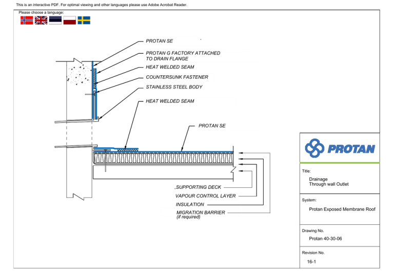 This is an interactive PDF. For optimal viewing and other languages please use Adobe Acrobat Reader. Please choose a language: MEMBRANA PROTAN SE PROTAN SE MEMBRANA PROTAN G PROTAN G FACTORY FABRIKKMONTERT FABRIKSMONTERAD ATTACHED KINNITATUD PROTAN G FABRYCZNIE PRZYMOCOWANA DO WPUSTU TIL TILL TO DRAIN FLENS KRAGE FLANGE KEEVIS SVEIS SVETS HEAT WELDED SEAM KINNITI FESTEMIDDEL FASTENER COUNTERSUNK KORPUS ZESTEEL ROOSTEVABAST STALITERASEST NIERDZEWNEJ KORPUS STAINLESS FLENS KRAGE BODY KEEVIS SVEIS SVETS HEAT WELDED SEAM MEMBRANA PROTAN SE PROTAN SE Titel: Joonis: Tittel: Title: SUPPORTING DECK KANDEKONSTRUKTSIOON VAPOUR CONTROL LAYER PAROIZOLACJA DAMPSPERRE Drainage Wpust poziomy attykowy Utlopp wall Gjennom Through vegg Outlet System: ISOLASJON SOOJUSTUS ISOLERING IZOLACJA TERMICZNA INSULATION MIGRATION BARRIER ALT. MIGRERINGSSPERRE (if required) Kaitsmata Protan Exponerade Membrana Eksponert Exposed ProtanMembrane kattega Takbelegg Eksponowana Tak katus Roof Ritning Nr Joonise Tegning Drawing rysunku: Nr. nr. Nr. No. Protan 40-30-06 Senaste Nr Versioon: Siste Revision rewizji: Rev. Rev. No. Nr. Nr. 16-1