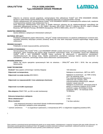 ORALITE®5700 FOLIA ODBLASKOWA Typu ENGINEER GRADE PREMIUM OPIS: ® Odporna na zmienne warunki pogodowe, samoprzylepna folia odblaskowa Oralite serii 5700 ENGINEER GRADE, łącząca w sobie bardzo wysoką elastyczność i znakomitą odporność na rozpuszczalniki i korozję. ® System odblaskowości folii samoprzylepnej Oralite 5700 ENGINEER GRADE to katadioptryczne szklane kulki, osadzone w transparentnej warstwie masy plastycznej (Typ I). Dane dotyczące odblaskowości oraz koloru w świetle dziennym odnoszą się do międzynarodowych specyfikacji dla materiałów odblaskowych tej klasy, tj. EN 12899-1 (Europa), DIN 67520 i DIN 6171 (Niemcy), BS 873: część 6 (Wielka Brytania), NFP 98-520 (Francja), SN 640878 (Szwajcaria), ASTM D 4956 (USA), JIS Z 9117 (Japonia). WARSTWA WIERZCHNIA: śywica alkidowa z zatopionymi mikrokulkami szklanymi. MATERIAŁ KRYJĄCY: 2 Powlekany polietylenem papier silikonowany, 145 g/m . Dzięki nadrukowanemu na papierze podkładowym numerowi serii, wszystkie parametry dotyczące procesu produkcji danej roli oraz dane dotyczące surowca wyjściowego mogą zostać odtworzone. ŚRODEK KLEJĄCY: Poliakrylan na bazie rozpuszczalnika, permanentny. ZAKRES STOSOWANIA: ® Samoprzylepna folia Oralite 5700 z serii ENGINEER GRADE została stworzona do produkcji wszelkiego rodzaju znaków drogowych, gdzie niezbędna jest bardzo długa Ŝywotność wykonanego znaku. W przypadku uŜycia folii odblaskowej ® Oralite 5700 z serii ENGINEER GRADE naleŜy porównać jej właściwości z odpowiednimi standardami, charakterystycznymi dla danego kraju. Gładka powierzchnia zewnętrzna wykazuje bardzo wysoką odporność na zadrapania i uderzenia, zachowując bardzo dobre właściwości zadrukowywania. SPOSÓB ZADRUKU: ® Zaleca się uŜycie specjalnie opracowanych farb do sitodruku – ORALITE seria 5010 i 5018. Nie ma potrzeby lakierowania. DANE TECHNICZNE: Grubość* (bez papieru ochronnego i warstwy klejącej) 130 mikronów Odporność na temperaturę Naklejona na aluminium, -56ºC do +82ºC Odporność na wodę morską (DIN 50021) Siła sklejania (FINAT-TM1, po 24h na stali nierdzewnej) Naklejona na aluminium – po 100h w temp. 23ºC nie wykazuje zmian Przy właściwej aplikacji odporna na większość olei, smarów, paliw, rozpuszczalników alifatycznych, słabych kwasów i zasad oraz soli. Naklejona na aluminium, zanurzona przez 8 godzin w roztworze myjącym (0,5% środki czystości z gosp. domowego) w temp. pokojowej i 65ºC - nie wykazuje zmian. 15 N/25mm Zalecana temperatura naklejania >10ºC Okres składowania** 2 lata Okres trwałości 7 lat (bez zadruku) Odporność na rozpuszczalniki i inne substancje chemiczne Odporność na środki czyszczące przy ekspozycji pionowej w warunkach klimatu środkowoeuropejskiego (przy właściwym naklejaniu przez specjalistę) * -wartość uśredniona ** -w oryginalnym opakowaniu, w temperaturze 20ºC i w wilgotności względnej powietrza 50%. \ Dane zawarte w powyŜszej karcie technologicznej oparte są na naszej wiedzy i doświadczeniu i mogą być uŜywane tylko jako źródło informacji, nie stanowiące prawnej gwarancji określonych cech. Ze względu na bardzo duŜą ilość moŜliwych zastosowań, uŜytkownik powinien we własnym zakresie przetestować dany materiał dla swoich potrzeb, przed ostatecznym uŜyciem. ORALITE®5700 FOLIA ODBLASKOWA Typu ENGINEER GRADE PREMIUM MINIMALNE WARTOŚCI WSPÓŁCZYNNIKA ODBLASKOWOŚCI (DIN 67520 część 1 i 2) Jednostkowy współczynnik odbicia światła R’ mierzony w Cd/lx na m Kąt obserwacji (º) 0.33 0.2 Kąt padania światła (º) 2 2 5 30 40 5 30 40 5 30 40 5700 - 010 – biały 100 40 10 80 35 9 5 2.5 1.5 5700 – 020 - Ŝółty 60 26 7 45 20 6 3 1.5 1 5700 – 035 - pomarańczowy 30 12 2.2 25 10 2.2 1.2 0.5 5700 – 030 - czerwony 22 9 2 17 6.5 1.8 1 0.5 0.5 5700 – 060 – zielony 13 5 1.5 11 5 1.2 0.5 0.3 0.2 5700 – 050 – niebieski 6 2.4 0.5 4 1.3 5700 – 080 - brązowy 5 2 3 1 5700 – 070 - czarny 25 10 20 8 DANE TECHNICZNE DOTYCZĄCE KOLORÓW (DIN 5033 część 3, DIN 5036 część 1, DIN 6171) y 0.315 x 0.335 y 0.345 Osie kolorowości 3 x y 0.325 0.355 1 2 x 0.295 4 y 0.325 Współczynnik luminacji ß >=0.35 Biała 010 x 0.305 śółta 020 0.494 0.505 0.47 0.48 0.513 0.437 0.545 0.454 >=0.27 Pomarańczowa 035 0.61 0.39 0.535 0.375 0.506 0.404 0.57 0.429 >=0.17 Czerwona 030 0.735 0.265 0.7 0.25 0.61 0.34 0.66 0.34 >=0.05 Zielona 060 0.11 0.415 0.17 0.415 0.17 0.5 0.11 0.5 >=0.04 Niebieska 050 0.13 0.09 0.16 0.09 0.16 0.14 0.13 0.14 >=0.01 0.394 0.03>=ß>=0.09 Brązowa 080 0.455 0.397 0.523 0.429 0.479 0.373 0.558 Uwaga: Powierzchnia, na którą naklejana jest folia musi być oczyszczona z kurzu, smarów oraz innych zanieczyszczeń, które mogłyby wpłynąć niekorzystnie na przyklejenie się tego produktu. ŚwieŜo lakierowane lub malowane powierzchnie powinny być pozostawione do wyschnięcia przez minimum 3 tygodnie. MoŜliwości zastosowania wybranych lakierów lub farb z folią samoprzylepną powinny zostać sprawdzone przed ostatecznym naklejeniem folii. Samoprzylepna folia odblaskowa nadaje się tylko do aplikacji „na sucho”. Przed naklejeniem folii naleŜy sprawdzić, czy pomiędzy folią, a podłoŜem nie zachodzą reakcje chemiczne. Ponadto powinny być wzięte pod uwagę wszelkie informacje dotyczące aplikacji folii, opublikowane przez Orafol Europe GmbH (http://www.orafol.com). Dane zawarte w powyŜszej karcie technologicznej oparte są na naszej wiedzy i doświadczeniu i mogą być uŜywane tylko jako źródło informacji, nie stanowiące prawnej gwarancji określonych cech. Ze względu na bardzo duŜą ilość moŜliwych zastosowań, uŜytkownik powinien we własnym zakresie przetestować dany materiał dla swoich potrzeb, przed ostatecznym uŜyciem.