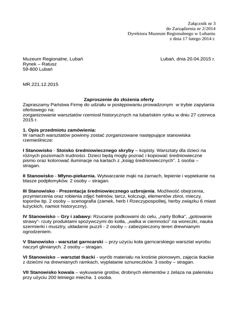 Załącznik nr 3 do Zarządzenia nr 2/2014 Dyrektora Muzeum Regionalnego w Lubaniu z dnia 17 lutego 2014 r. Muzeum Regionalne, Lubań Rynek – Ratusz 59-800 Lubań Lubań, dnia 20.04.2015 r. MR.221.12.2015 Zaproszenie do złożenia oferty Zapraszamy Państwa Firmę do udziału w postępowaniu prowadzonym w trybie zapytania ofertowego na: zorganizowanie warsztatów rzemiosł historycznych na lubańskim rynku w dniu 27 czerwca 2015 r. 1. Opis przedmiotu zamówienia: W ramach warsztatów powinny zostać zorganizowane następujące stanowiska rzemieślnicze: I Stanowisko - Stoisko średniowiecznego skryby – kopisty. Warsztaty dla dzieci na różnych poziomach trudności. Dzieci będą mogły poznać i kopiować średniowieczne pismo oraz kolorować iluminacje na kartach z „ksiąg średniowiecznych”. 1 osoba – stragan. II Stanowisko - Młyno-piekarnia. Wytwarzanie mąki na żarnach, lepienie i wypiekanie na blasze podpłomyków. 2 osoby – stragan. III Stanowisko - Prezentacja średniowiecznego uzbrojenia. Możliwość obejrzenia, przymierzenia oraz robienia zdjęć hełmów, tarcz, kolczugi, elementów zbroi, mieczy, toporów itp. 2 osoby – scenografia (zamek, herb I Rzeczypospolitej, herby związku 6 miast łużyckich, namiot historyczny). IV Stanowisko – Gry i zabawy: Rzucanie podkowami do celu, „narty Bolka”, „gotowanie strawy”- rzuty produktami spożywczymi do kotła, „walka w ciemności” na woreczki, nauka szermierki i musztry, układanie puzzli - 2 osoby – zabezpieczony teren drewnianym ogrodzeniem. V Stanowisko - warsztat garncarski – przy użyciu koła garncarskiego warsztat wyrobu naczyń glinianych. 2 osoby – stragan. VI Stanowisko – warsztat tkacki - wyrób materiału na krośnie pionowym, zajęcia tkackie z dziećmi na drewnianych ramkach, wyplatanie sznureczków. 3 osoby – stragan. VII Stanowisko kowala – wykuwanie grotów, drobnych elementów z żelaza na palenisku przy użyciu 200 letniego miecha. 1 osoba. VIII Stanowisko – mennica średniowieczna – wybijanie kopii monet (floren legnicki, grosz praski, denar wczesnośredniowieczny). 1 osoba – stragan. IX Stanowisko – szewc – wyrób butów i przedmiotów skórzanych. 1 osoba – stragan. X Stanowisko - warsztat czerpania papieru - zajęcia w trakcie których uczestnicy imprezy nauczą się techniki wykonania papieru czerpanego, na pamiątkę każdy może zabrać własnoręcznie zrobioną kartkę. 1 osoba - stragan. XI Stanowisko – Kat - zdjęcia w dybach i innymi narzędziami tortur. 1 osoba. XII Stanowisko – Stolarz – można zobaczyć jak wyglądał warsztat stolarski, na kopii średniowiecznej tokarki rzemieślnik wykonuje przedmioty toczone z drewna. 1 osoba – stragan. XIII Stanowisko - rogowniczo-rymarskie – wyrób i nauka ozdób z rogu, skóry metalu, goście własnoręcznie mogą wykonać ozdobę. 1 osoba – stragan. 2. Termin realizacji zamówienia: Warsztaty odbędą się 27 czerwca (sobota) 2015 r. na lubańskim rynku w godz. 12:00 – 19:00. Wykonawca powinien zjawić w Lubaniu co najmniej o godz. 8:00, tak aby był w stanie przygotować wszystkie stoiska do chwili rozpoczęcia warsztatów. 3. Miejsce i termin złożenia oferty: Oferty sporządzone na „Formularzu Ofertowym Wykonawcy” (Załącznik nr 1) należy przesyłać w formie pisemnej do 04.05.2015 r., do godz. 15:00 na następujący adres: Muzeum Regionalne w Lubaniu, Rynek – Ratusz, 59-800 Lubań. 4. Sposób oceny i dokonania wyboru najkorzystniejszej oferty: Realizacja zamówienia zostanie przyznana temu oferentowi, który złoży ofertę najkorzystniejszą pod względem cenowym i wykaże się odpowiednim doświadczeniem, tzn. organizacją w przeszłości min. 2 podobnych warsztatów (Załącznik nr 2). W przypadku, niewpłynięcia wymaganej ilości ofert- 2 oferty- (w tym żadnej oferty) w postępowaniu Zamawiający dokona wyboru dowolnego wykonawcy, który spełnia wszystkie kryteria i warunki określone w zaproszeniu będącym podstawą do wyłonienia wykonawcy. 5. Dokumenty i oświadczenia, które oferent winien załączyć do składanej oferty: - Wykaz usług w zakresie wykazania spełnienia warunku wiedzy i doświadczenia (Załącznik nr 2). 6. Osoba upoważniona do kontaktu z oferentami: Osobą uprawnioną do porozumiewania się z wykonawcami jest Łukasz Tekiela nr tel. 602 751 995; e-mail: [email protected] w terminach: od poniedziałku do piątku w godzinach pomiędzy 9:00 – 15:00. Załącznik nr.1 FORMULARZ OFERTOWY WYKONAWCY 1.Dane dotyczące wykonawcy Nazwa: ................................................ Siedziba: ................................................ Adres poczty elektronicznej: ................................................ Strona internetowa: ................................................ Numer telefonu: ……........................................ Numer faksu: ……. ...................................... Numer REGON: ................................................ Numer NIP: ................................................ 2.Dane dotyczące Zamawiającego Muzeum Regionalne w Lubaniu Rynek-Ratusz, 59-800 Lubań Zobowiązania Wykonawcy: Nawiązując do zaproszenia na zorganizowanie 13 stoisk historycznych w Lubaniu w dniu 27 czerwca 2015, oferujemy wykonanie zamówienia, zgodnie z wymogami Zaproszenia za cenę: 3.Cena oferty cena netto...........................................................................................................zł (słownie: ..............................................................................................................) podatek VAT.......................................................................................................zł cena brutto..........................................................................................................zł (słownie: ...............................................................................................................) 4. Oświadczenia Wykonawcy; Podana wy