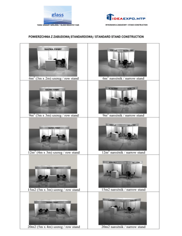TARGI BRANŻY SZKLANEJ • GLASS INDUSTRY FAIR WYKONAWCA ZABUDOWY / STAND CONSTRUCTION POWIERZCHNIA Z ZABUDOWĄ STANDARDOWĄ / STANDARD STAND CONSTRUCTION 6m2 (3m x 2m) szereg / row stand 6m2 narożnik / narrow stand 9m2 (3m x 3m) szereg / row stand 9m2 narożnik / narrow stand 12m2 (4m x 3m) szereg / row stand 12m2 narożnik / narrow stand 15m2 (5m x 3m) szereg / row stand 15m2 narożnik / narrow stand 20m2 (5m x 4m) szereg / row stand 20m2 narożnik / narrow stand 25m2 (5m x 5m) szereg / row stand 25m2 (5m x 5m) narożnik / narrow stand Ściany stoiska – kolor biały, kolor wykładziny – popielaty, kolor napisu – czarny, instalacja elektryczna – oświetlenie (60W/3m2), gniazdko 230V (1szt.). Wyposażenie standardowe: krzesło tapicerowane (4szt.), stół okrągły (1szt.), wieszak wiszący (1szt.), kosz na śmieci (1szt.), lada informacyjna (1szt.), zaplecze zamykane na klucz (wielkość uzależniona od metrażu całego stoiska). Stand walls – white, carpet color – gray, inscription color – black, electric installation – 1 spotlight 60W per 3m2, 230V socket (1 pc.) Uwaga: W celu zamówienia dodatkowych usług uzupełniających ofertę powierzchni zabudowanej, prosimy wypełnić i przesłać formularz B1. Warning: Please fill B1 form to order of the additional services for built up space. Osoby kontaktowe: Karol Biegoń Tel: +48 603 590 867 e-mail: [email protected] Contact persons: Karol Biegoń Tel: +48 603 590 867 e-mail: [email protected] Standard equipment: upholstered chair (4 pc.), round table (1 pc.), coat hanger (1 pc.), dustbin (1 pc.), info counter (1 pc.), storage room (size of storage room depends on stand’s size).
