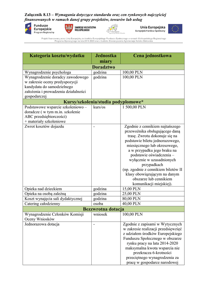 Załącznik 8.13 – Wymagania dotyczące standardu oraz cen rynkowych najczęściej finansowanych w ramach danej grupy projektów, towarów lub usług Kategoria kosztu/wydatku Wynagrodzenie psychologa Wynagrodzenie doradcy zawodowego w zakresie oceny predyspozycji kandydata do samodzielnego założenia i prowadzenia działalności gospodarczej Jednostka miary Doradztwo godzina godzina Cena jednostkowa 100,00 PLN 100,00 PLN Kursy/szkolenia/studia podyplomowe* Podstawowe wsparcie szkoleniowo – doradcze ( w tym m.in. szkolenie ABC przedsiębiorczości) + materiały szkoleniowe Zwrot kosztów dojazdu kurs/os 1 500,00 PLN - Opieka nad dzieckiem Opieka na osobą zależną Koszt wynajęcia sali dydaktycznej Catering całodzienny godzina godzina godzina osoba Zgodnie z cennikiem najtańszego przewoźnika obsługującego daną trasę. Zwrotu dokonuje się na podstawie biletu jednorazowego, miesięcznego lub okresowego, a w przypadku jego braku na podstawie oświadczenia – wyłącznie w uzasadnionych przypadkach (np. zgodnie z cennikiem biletów II klasy obowiązującym na danym obszarze lub cennikiem komunikacji miejskiej). 15,00 PLN 25,00 PLN 80,00 PLN 40,00 PLN Bezzwrotna dotacja Wynagrodzenie Członków Komisji Oceny Wniosków Jednorazowa dotacja wniosek 100,00 PLN - Zgodnie z zapisami w Wytycznych w zakresie realizacji przedsięwzięć z udziałem środków Europejskiego Funduszu Społecznego w obszarze rynku pracy na lata 2014-2020 maksymalna kwota wsparcia nie przekracza 6-krotności przeciętnego wynagrodzenia za pracę w gospodarce narodowej Zwrot kosztów dojazdu na monitoring i kontrole założonych działalności gospodarczych - obowiązującego w dniu przyznania wsparcia. Zgodnie z Rozporządzeniem Ministra Pracy i Polityki Społecznej z dnia 29 stycznia 2013 r. w sprawie należności przysługujących pracownikowi zatrudnionemu w państwowej lub samorządowej jednostce sfery budżetowej z tytułu podróży służbowej (Dz.U.2013.167) Wsparcie pomostowe Szkolenie specjalistyczne pojedyncza Do wysokości 5 000,00 PLN usługa w zależności od rodzaju specjalistyczna i zaawansowania szkolenia, branży. Kwalifikowalność wydatków oceniana będzie indywidualnie, w szczególności pod kątem niezbędności, zasadności oraz racjonalności. * z wyłączeniem osób, które skorzystały ze szkoleń przygotowujących do prowadzenia działalności gospodarczej w ramach projektów realizowanych w PO KL w perspektywie finansowej 2007-2013 oraz osób, u których potwierdzono, że ich wiedza i kwalifikacje umożliwiają rozpoczęcie działalności bez konieczności szkolenia. Osoby te nie mają obowiązku korzystania ze szkoleń przed przyznaniem dotacji, o ile nabyte wcześniej umiejętności pozwalają na założenie i prowadzenie działalności gospodarczej. Cena jednostkowa kosztu/wydatku przedstawiona w załączniku do regulaminu konkursu „Wymagania dotyczące standardu oraz cen rynkowych najczęściej finansowanych w ramach danej grupy projektów, towarów lub usług” nie oznacza stawki jednostkowej, lecz szacunkową cenę rynkową towarów i usług najczęściej finansowanych w ramach danego Działania/Poddziałania – stosując zatem stawki wynikające z taryfikatora Instytucji Zarządzającej, nie należy ich oznaczać jako stawki jednostkowe w budżecie projektu. Każdorazowo kwalifikowalność wydatków oceniana jest indywidualnie, w szczególności pod kątem niezbędności, zasadności oraz racjonalności w kontekście przedstawionych zadań. Przyjęcie dopuszczalnej stawki nie oznacza również, że będzie akceptowana w każdym budżecie – przy ocenie będą brane pod uwagę takie czynniki jak: specyfika projektu, stopień złożoności projektu, wielkość grupy docelowej, miejsce realizacji.