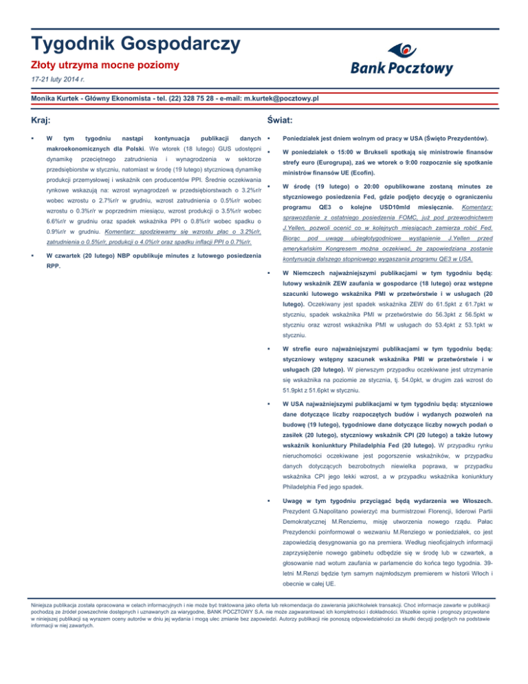 Tygodnik Gospodarczy Złoty utrzyma mocne poziomy 17-21 luty 2014 r. Monika Kurtek - Główny Ekonomista - tel. (22) 328 75 28 - e-mail: [email protected] Świat: Kraj: W tym tygodniu nastąpi kontynuacja publikacji danych makroekonomicznych dla Polski. We wtorek (18 lutego) GUS udostępni dynamikę przeciętnego zatrudnienia i wynagrodzenia w Poniedziałek jest dniem wolnym od pracy w USA (Święto Prezydentów). W poniedziałek o 15:00 w Brukseli spotkają się ministrowie finansów sektorze strefy euro (Eurogrupa), zaś we wtorek o 9:00 rozpocznie się spotkanie przedsiębiorstw w styczniu, natomiast w środę (19 lutego) styczniową dynamikę ministrów finansów UE (Ecofin). produkcji przemysłowej i wskaźnik cen producentów PPI. Średnie oczekiwania rynkowe wskazują na: wzrost wynagrodzeń w przedsiębiorstwach o 3.2%r/r W środę (19 lutego) o 20:00 opublikowane zostaną minutes ze styczniowego posiedzenia Fed, gdzie podjęto decyzję o ograniczeniu wobec wzrostu o 2.7%r/r w grudniu, wzrost zatrudnienia o 0.5%r/r wobec programu wzrostu o 0.3%r/r w poprzednim miesiącu, wzrost produkcji o 3.5%r/r wobec QE3 o kolejne USD10mld miesięcznie. Komentarz: sprawozdanie z ostatniego posiedzenia FOMC, już pod przewodnictwem 6.6%r/r w grudniu oraz spadek wskaźnika PPI o 0.8%r/r wobec spadku o J.Yellen, pozwoli ocenić co w kolejnych miesiącach zamierza robić Fed. 0.9%r/r w grudniu. Komentarz: spodziewamy się wzrostu płac o 3.2%r/r, Biorąc zatrudnienia o 0.5%r/r, produkcji o 4.0%r/r oraz spadku inflacji PPI o 0.7%r/r. pod uwagę ubiegłotygodniowe wystąpienie J.Yellen przed amerykańskim Kongresem można oczekiwać, że zapowiedziana zostanie W czwartek (20 lutego) NBP opublikuje minutes z lutowego posiedzenia kontynuacja dalszego stopniowego wygaszania programu QE3 w USA. RPP. W Niemczech najważniejszymi publikacjami w tym tygodniu będą: lutowy wskaźnik ZEW zaufania w gospodarce (18 lutego) oraz wstępne szacunki lutowego wskaźnika PMI w przetwórstwie i w usługach (20 lutego). Oczekiwany jest spadek wskaźnika ZEW do 61.5pkt z 61.7pkt w styczniu, spadek wskaźnika PMI w przetwórstwie do 56.3pkt z 56.5pkt w styczniu oraz wzrost wskaźnika PMI w usługach do 53.4pkt z 53.1pkt w styczniu. W strefie euro najważniejszymi publikacjami w tym tygodniu będą: styczniowy wstępny szacunek wskaźnika PMI w przetwórstwie i w usługach (20 lutego). W pierwszym przypadku oczekiwane jest utrzymanie się wskaźnika na poziomie ze stycznia, tj. 54.0pkt, w drugim zaś wzrost do 51.9pkt z 51.6pkt w styczniu. W USA najważniejszymi publikacjami w tym tygodniu będą: styczniowe dane dotyczące liczby rozpoczętych budów i wydanych pozwoleń na budowę (19 lutego), tygodniowe dane dotyczące liczby nowych podań o zasiłek (20 lutego), styczniowy wskaźnik CPI (20 lutego) a także lutowy wskaźnik koniunktury Philadelphia Fed (20 lutego). W przypadku rynku nieruchomości oczekiwane jest pogorszenie wskaźników, w przypadku danych dotyczących bezrobotnych niewielka poprawa, w przypadku wskaźnika CPI jego lekki wzrost, a w przypadku wskaźnika koniunktury Philadelphia Fed jego spadek. Uwagę w tym tygodniu przyciągać będą wydarzenia we Włoszech. Prezydent G.Napolitano powierzyć ma burmistrzowi Florencji, liderowi Partii Demokratycznej M.Renziemu, misję utworzenia nowego rządu. Pałac Prezydencki poinformował o wezwaniu M.Renziego w poniedziałek, co jest zapowiedzią desygnowania go na premiera. Według nieoficjalnych informacji zaprzysiężenie nowego gabinetu odbędzie się w środę lub w czwartek, a głosowanie nad wotum zaufania w parlamencie do końca tego tygodnia. 39letni M.Renzi będzie tym samym najmłodszym premierem w historii Włoch i obecnie w całej UE. Niniejsza publikacja została opracowana w celach informacyjnych i nie może być traktowana jako oferta lub rekomendacja do zawierania jakichkolwiek transakcji. Choć informacje zawarte w publikacji pochodzą ze źródeł powszechnie dostępnych i uznawanych za wiarygodne, BANK POCZTOWY S.A. nie może zagwarantować ich kompletności i dokładności. Wszelkie opinie i prognozy przywołane w niniejszej publikacji są wyrazem oceny autorów w dniu jej wydania i mogą ulec zmianie bez zapowiedzi. Autorzy publikacji nie ponoszą odpowiedzialności za skutki decyzji podjętych na podstawie informacji w niej zawartych. RYNEK FX/FI Rynek walutowy (FX) Dane Rynkowe Poprzedni tydzień przyniósł umocnienie złotego z okolic 4.1755/EUR na jego otwarciu do 4.1435/EUR na jego Rynek FX zakończeniu. Polskiej walucie sprzyjało uspokojenie nastrojów na globalnych rynkach finansowych, związane EUR-PLN ze spadkiem obaw o tzw. rynki wschodzące. Pomogły także dane z polskiej gospodarki, m.in. dotyczące tempa USD-PLN CHF-PLN EUR-USD wzrostu PKB w ostatnim kwartale 2013 r. (2.7%r/r), ale istotne było również to co działo się na parze EURUSD. Główna para walutowa znajdowała się w ostatnich dniach w wyraźnym trendzie wzrostowym. W swoim wtorkowym wystąpieniu przed amerykańskim Kongresem niczym nie zaskoczyła szefowa Fed J.Yellen, która zamierza kontynuować rozpoczętą pod koniec ub.r. przez B.Bernanke politykę wygaszania programu QE3. Zapowiedź braku zmian w polityce pieniężnej w USA została dobrze odebrana przez inwestorów. Korektę na Kurs zamkn. poprz. tydz. 4,1435 1W zm 1M zm YTD -0,03 0,00 -0,01 3,0262 3,3903 -0,04 -0,02 0,00 0,04 0,01 0,00 1,3693 0,01 1,37 -0,01 2Y 3,08 -0,02 0,13 0,03 5Y 3,81 0,06 0,21 0,17 10Y 4,50 0,08 0,11 0,15 Rynek FI głównej parze walutowej spowodowały w środę wypowiedzi członka Rady EBC B.Coeure, który wskazał na Rynek Akcji możliwość obniżki do ujemnych poziomów stopy depozytowej w strefie euro, była ona jednak krótkotrwała i WIG20 2483 2,6% 4,4% 2,1% niewielka. Ostatecznie kurs EUR-USD zamknął tydzień na poziomie 1.3693 wobec otwarcia na poziomie DJIA 16028 2,6% -2,5% -2,5% 1.3627, przy czym w trakcie tygodnia znajdował się chwilowo powyżej 1.37. We wzro
