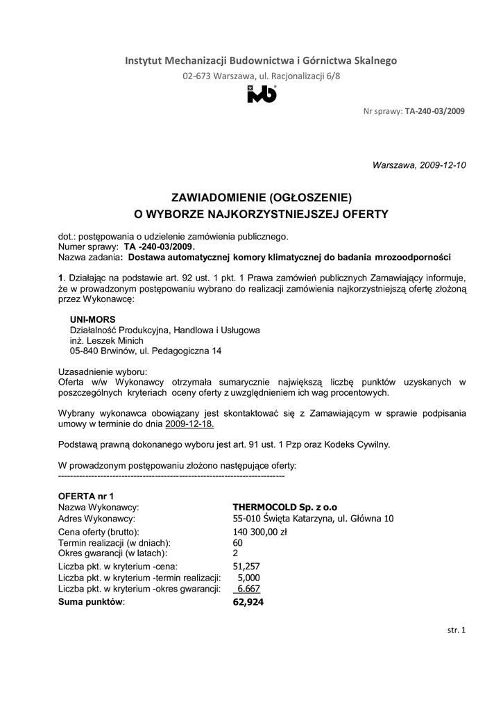 Instytut Mechanizacji Budownictwa i Górnictwa Skalnego 02-673 Warszawa, ul. Racjonalizacji 6/8 Nr sprawy: TA-240-03/2009 Warszawa, 2009-12-10 ZAWIADOMIENIE (OGŁOSZENIE) O WYBORZE NAJKORZYSTNIEJSZEJ OFERTY dot.: postępowania o udzielenie zamówienia publicznego. Numer sprawy: TA -240-03/2009. Nazwa zadania: Dostawa automatycznej komory klimatycznej do badania mrozoodporności 1. Działając na podstawie art. 92 ust. 1 pkt. 1 Prawa zamówień publicznych Zamawiający informuje, że w prowadzonym postępowaniu wybrano do realizacji zamówienia najkorzystniejszą ofertę złożoną przez Wykonawcę: UNI-MORS Działalność Produkcyjna, Handlowa i Usługowa inż. Leszek Minich 05-840 Brwinów, ul. Pedagogiczna 14 Uzasadnienie wyboru: Oferta w/w Wykonawcy otrzymała sumarycznie największą liczbę punktów uzyskanych w poszczególnych kryteriach oceny oferty z uwzględnieniem ich wag procentowych. Wybrany wykonawca obowiązany jest skontaktować się z Zamawiającym w sprawie podpisania umowy w terminie do dnia 2009-12-18. Podstawą prawną dokonanego wyboru jest art. 91 ust. 1 Pzp oraz Kodeks Cywilny. W prowadzonym postępowaniu złożono następujące oferty: --------------------------------------------------------------------------OFERTA nr 1 Nazwa Wykonawcy: Adres Wykonawcy: Cena oferty (brutto): Termin realizacji (w dniach): Okres gwarancji (w latach): Liczba pkt. w kryterium -cena: Liczba pkt. w kryterium -termin realizacji: Liczba pkt. w kryterium -okres gwarancji: Suma punktów: THERMOCOLD Sp. z o.o 55-010 Święta Katarzyna, ul. Główna 10 140 300,00 zł 60 2 51,257 5,000 6.667 62,924 str. 1 Instytut Mechanizacji Budownictwa i Górnictwa Skalnego 02-673 Warszawa, ul. Racjonalizacji 6/8 Nr sprawy: TA-240-03/2009 OFERTA nr 2 Nazwa Wykonawcy: Adres Wykonawcy: Cena oferty (brutto): Termin realizacji (w dniach): Okres gwarancji (w latach): Liczba pkt. w kryterium -cena: Liczba pkt. w kryterium -termin realizacji: Liczba pkt. w kryterium -okres gwarancji: Suma punktów: OFERTA nr 3 Nazwa Wykonawcy: Adres Wykonawcy: Cena oferty (brutto): Termin realizacji (w dniach): Okres gwarancji (w latach): Liczba pkt. w kryterium -cena: Liczba pkt. w kryterium -termin realizacji: Liczba pkt. w kryterium -okres gwarancji: Suma punktów: TOROPOL Sp. z o. o. 03-620 Warszawa, ul. Czarna Droga 29 103 578,00 zł 30 dni 2 69,430 10,000 6,667 86,097 UNI-MORS 05-840 Brwinów, ul. Pedagogiczna 14 89 893,79 zł 59 3 80,000 5,084 10,000 95,084 2. Działając na podstawie art. 92 ust. 1 pkt. 2 Prawa zamówień publicznych Zamawiający informuje, że w prowadzonym postępowaniu nie zostały odrzucone żadne oferty. 3. Działając na podstawie art. 92 ust. 1 pkt. 3 Prawa zamówień publicznych Zamawiający informuje, że w prowadzonym postępowaniu nie zostali wykluczeni żadni wykonawcy. Środki ochrony prawnej Od niniejszej decyzji przysługują środki ochrony prawnej określone w ustawie z dnia 29 stycznia 2004 roku Prawo zamówień publicznych (t. j. Dz. U. z 2007 r. Nr 223, poz. 1655) - dział VI "Środki ochrony prawnej". Wobec czynności podjętych przez zamawiającego w toku postępowania oraz w przypadku zaniechania przez zamawiającego czynności, do której jest obowiązany na podstawie ustawy, można wnieść protest do zamawiającego Protest wnosi się w terminie 7 dni od dnia, w którym powzięto lub można było powziąć wiadomość o okolicznościach stanowiących podstawę jego wniesienia. Przewodniczący Komisji Przetargowej mgr inż. Marek Gajewski str. 2