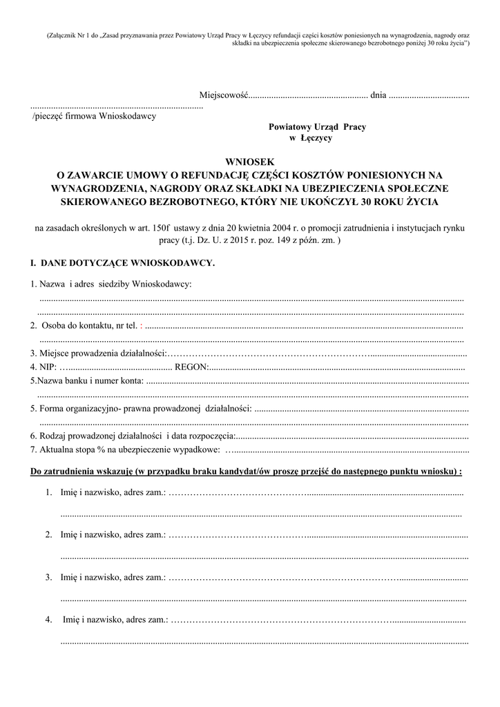 (Załącznik Nr 1 do „Zasad przyznawania przez Powiatowy Urząd Pracy w Łęczycy refundacji części kosztów poniesionych na wynagrodzenia, nagrody oraz składki na ubezpieczenia społeczne skierowanego bezrobotnego poniżej 30 roku życia”) Miejscowość.................................................... dnia ................................... ........................................................................... /pieczęć firmowa Wnioskodawcy Powiatowy Urząd Pracy w Łęczycy WNIOSEK O ZAWARCIE UMOWY O REFUNDACJĘ CZĘŚCI KOSZTÓW PONIESIONYCH NA WYNAGRODZENIA, NAGRODY ORAZ SKŁADKI NA UBEZPIECZENIA SPOŁECZNE SKIEROWANEGO BEZROBOTNEGO, KTÓRY NIE UKOŃCZYŁ 30 ROKU ŻYCIA na zasadach określonych w art. 150f ustawy z dnia 20 kwietnia 2004 r. o promocji zatrudnienia i instytucjach rynku pracy (t.j. Dz. U. z 2015 r. poz. 149 z późn. zm. ) I. DANE DOTYCZĄCE WNIOSKODAWCY. 1. Nazwa i adres siedziby Wnioskodawcy: ........................................................................................................................................................................................ ......................................................................................................................................................................................... 2. Osoba do kontaktu, nr tel. : .......................................................................................................................................... ........................................................................................................................................................................................ 3. Miejsce prowadzenia działalności:………………………………………………………….......................................... 4. NIP: …............................................. REGON:............................................................................................................... 5.Nazwa banku i numer konta: ............................................................................................................................................ ........................................................................................................................................................................................... 5. Forma organizacyjno- prawna prowadzonej działalności: ............................................................................................. .......................................................................................................................................................................................... 6. Rodzaj prowadzonej działalności i data rozpoczęcia:..................................................................................................... 7. Aktualna stopa % na ubezpieczenie wypadkowe: …...................................................................................................... Do zatrudnienia wskazuję (w przypadku braku kandydat/ów proszę przejść do następnego punktu wniosku) : 1. Imię i nazwisko, adres zam.: ……………………………………….................................................................... .............................................................................................................................................................................. 2. Imię i nazwisko, adres zam.: ………………………………………...................................................................... ................................................................................................................................................................................. 3. Imię i nazwisko, adres zam.: ………………………………………………………………….............................. ................................................................................................................................................................................ 4. Imię i nazwisko, adres zam.: ………………………………………………………………................................ ................................................................................................................................................................................. -28.. W okresie ostatnich 6 miesięcy przed złożeniem wniosku zatrudnienie w zakładzie pracy przedstawiało się następująco : Forma W dniu 6 miesięcy poprzedzające złożenie wniosku zatrudnienia złożenia (proszę dokładnie oznaczyć miesiąc i rok w oddzielnych rubrykach!) wniosku Umowa o pracę* Umowa cywilnoprawna *Do deklarowanego realnego poziomu zatrudnienia nie wlicza się osób na urlopach macierzyńskich, wychowawczych a także bezpłatnych powyżej 2 miesięcy, odbywających służbę wojskową lub zastępczą, młodocianych, osób zatrudnionych na umowę o dzieło, umowę zlecenie oraz w ramach innych umów cywilno-prawnych, osób nieświadczących pracy w związku z uzyskaniem świadczenia rehabilitacyjnego (Rozporządzenie Komisji WE Nr 364/2004). W okresie 6 m-cy poprzedzających złożenie wniosku zwolniono ……… osób. W przypadku zwolnienia pracowników, proszę podać przyczynę: ……………………………………………………………………………………………………............................………………… …………………………………………………………………………………............................…………………………………… ………………………………………………………………......................................................................................................... II. Dotychczasowa współpraca z Powiatowym Urzędem Pracy w Łęczycy : 1.Czy wnioskodawca korzystał ze środków Funduszu Pracy? Jeżeli tak proszę wypełnić tabelę poda