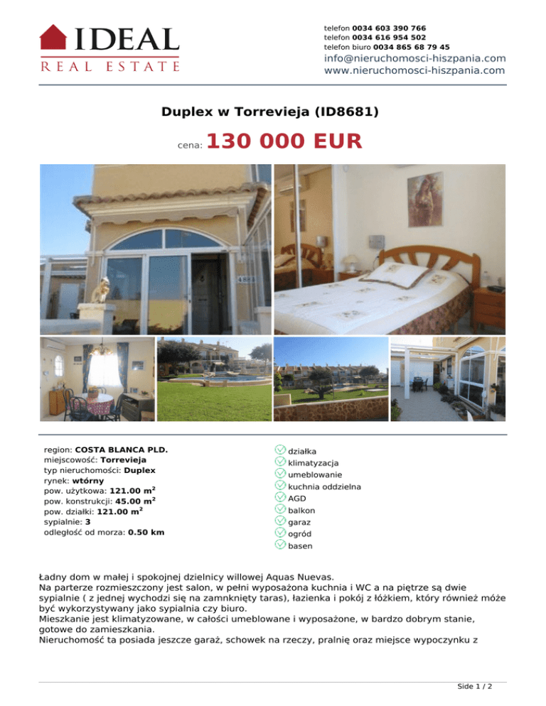 telefon 0034 603 390 766 telefon 0034 616 954 502 telefon biuro 0034 865 68 79 45 [email protected] www.nieruchomosci-hiszpania.com Duplex w Torrevieja (ID8681) cena: region: COSTA BLANCA PLD. miejscowość: Torrevieja typ nieruchomości: Duplex rynek: wtórny pow. użytkowa: 121.00 m2 pow. konstrukcji: 45.00 m2 pow. działki: 121.00 m2 sypialnie: 3 odległość od morza: 0.50 km 130 000 EUR działka klimatyzacja umeblowanie kuchnia oddzielna AGD balkon garaz ogród basen Ładny dom w małej i spokojnej dzielnicy willowej Aquas Nuevas. Na parterze rozmieszczony jest salon, w pełni wyposażona kuchnia i WC a na piętrze są dwie sypialnie ( z jednej wychodzi się na zamnknięty taras), łazienka i pokój z łóżkiem, który również móże być wykorzystywany jako sypialnia czy biuro. Mieszkanie jest klimatyzowane, w całości umeblowane i wyposażone, w bardzo dobrym stanie, gotowe do zamieszkania. Nieruchomość ta posiada jeszcze garaż, schowek na rzeczy, pralnię oraz miejsce wypoczynku z Side 1 / 2 grillem a wspólny basen dodaje jeszcze atrakcyjności tej nieruchomości. Cały kompleks leży zaledwie 0,5 km od morza i blisko wszystkich usług. Biały piasek plaż i ciepła woda Morza Śródziemnego nadają się świetnie do zabaw dla dzieci a mikroklimat panujący na tym obszarze czyni go jednym z najzdrowszych miejsc na ziemi, co stało się jednym z powodów coraz liczniejszych nabywców nieruchomości w tym regionie. Torrevieja posiada międzynarodowy charakter, co można zauważyć po tutejszych sklepach, butikach i restauracjach. www.nieruchomosci-hiszpania.com Side 2 / 2 Powered by TCPDF (www.tcpdf.org)
