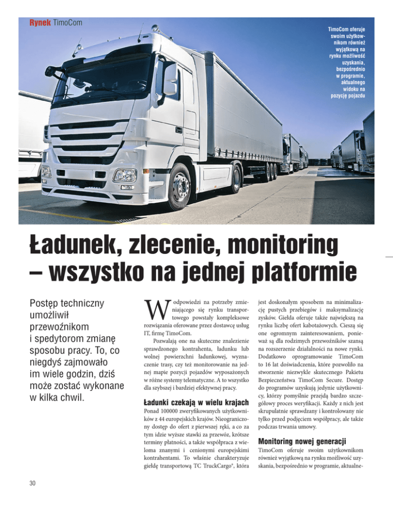 Rynek TimoCom TimoCom oferuje swoim użytkownikom również wyjątkową na rynku możliwość uzyskania, bezpośrednio w programie, aktualnego widoku na pozycję pojazdu Ładunek, zlecenie, monitoring – wszystko na jednej platformie Postęp techniczny umożliwił przewoźnikom i spedytorom zmianę sposobu pracy. To, co niegdyś zajmowało im wiele godzin, dziś może zostać wykonane w kilka chwil. W odpowiedzi na potrzeby zmieniającego się rynku transportowego powstały kompleksowe rozwiązania oferowane przez dostawcę usług IT, firmę TimoCom. Pozwalają one na skuteczne znalezienie sprawdzonego kontrahenta, ładunku lub wolnej powierzchni ładunkowej, wyznaczenie trasy, czy też monitorowanie na jednej mapie pozycji pojazdów wyposażonych w różne systemy telematyczne. A to wszystko dla szybszej i bardziej efektywnej pracy. Ładunki czekają w wielu krajach Ponad 100000 zweryfikowanych użytkowników z 44 europejskich krajów. Nieograniczony dostęp do ofert z pierwszej ręki, a co za tym idzie wyższe stawki za przewóz, krótsze terminy płatności, a także współpraca z wieloma znanymi i cenionymi europejskimi kontrahentami. To właśnie charakteryzuje giełdę transportową TC TruckCargo®, która 30 jest doskonałym sposobem na minimalizację pustych przebiegów i maksymalizację zysków. Giełda oferuje także największą na rynku liczbę ofert kabotażowych. Cieszą się one ogromnym zainteresowaniem, ponieważ są dla rodzimych przewoźników szansą na rozszerzenie działalności na nowe rynki. Dodatkowo oprogramowanie TimoCom to 16 lat doświadczenia, które pozwoliło na stworzenie niezwykle skutecznego Pakietu Bezpieczeństwa TimoCom Secure. Dostęp do programów uzyskują jedynie użytkownicy, którzy pomyślnie przejdą bardzo szczegółowy proces weryfikacji. Każdy z nich jest skrupulatnie sprawdzany i kontrolowany nie tylko przed podjęciem współpracy, ale także podczas trwania umowy. Monitoring nowej generacji TimoCom oferuje swoim użytkownikom również wyjątkową na rynku możliwość uzyskania, bezpośrednio w programie, aktualne- go widoku na pozycję pojazdu. Firma posiada bowiem w portfolio swoich produktów TC eMap®, czyli moduł kalkulacyjny tras z funkcją trackingu. Program pozwala przejść, za pomocą jednego kliknięcia, od oferty z giełdy transportowej TC Truck&Cargo® do mapy, która wyznaczy trasę, obliczy jej koszty, wyświetli występujące na niej w danym momencie natężenie ruchu, a później pokaże także aktualną pozycję danego pojazdu. Pojazd musi być jedynie wyposażony w jeden z ponad 70 zintegrowanych z mapą systemów GPS. Jest jeszcze jedna zaleta. Przewoźnik udostępniając swój pojazd do trackingu sygnalizuje swojemu kontrahentowi, że jest godny zaufania. Jest to obecnie szczególnie ważne, ponieważ bardzo szybko rośnie liczba nadawców ładunków, którzy oczekują możliwości monitorowania położenia pojazdu podczas zlecanego przez nich transportu. Dzięki firmom transportowym, które korzystają z TC eMap® mają oni szansę w kilka sekund uzyskać, na jednej mapie, widok na pozycje pojazdów, które przewożą ich towary. Z programem zostało już zintegrowanych ponad 70 systemów różnych dostawców te- lematycznych. To znacznie oszczędza czas obu stronom, ponieważ zbędne staje się wykonywanie (i odbieranie) czasochłonnych połączeń telefonicznych w celu wymiany informacji. Dodatkowo zwiększa się transparentność przewozów. Stałe zlecenia Kolejnym produktem sygnowanym marką TimoCom, jest TC eBid®. To interaktywna platforma przetargowa pozwalająca na zawieranie długoterminowych kontraktów na przewóz towarów. Co ważne, program charakteryzuje się niespotykaną na rynku transparentnością: podczas trwania całego przetargu żadna ze stron nie widzi wpływających ofert, dzięki czemu nie dochodzi do wojny cenowej i stosowania cen dumpingowych. Strona ogłaszająca przetarg otrzymuje kompletny spis ofert dopiero po zakończeniu przetargu. Przewoźnicy korzystający z TC eBid®, a których profil działalności odpowiada potrzebom firmy poszukującej usługodawcy, są e-mailowo informowani o każdym nowym przetargu. TC eBid® wyeliminował wady tradycyjnego sposobu ogłaszania przetargów. Szybki, prosty, zautomatyzowany proces pozwala bowiem zapomnieć o niezweryfikowanych partnerach, pustych przebiegach, słabym przepływie informacji, kosztownych pośrednikach, czy też czasochłonnym informowaniu usługodawców o przetargu i zapraszaniu ich do wzięcia w nim udziału. Wszystko na jednej platformie Dzięki platformom TimoCom użytkownicy: wyszukują frachty i wolne przestrzenie ładunkowe, wpisują swoje oferty, znajdują sprawdzonych kontrahentów, wolne przestrzenie magazynowe i długoterminowe kontrakty, planują trasy i kalkulują jej koszty, a także w jednym miejscu monitorują położenie pojazdów wyposażonych w różne systemy telematyczne. A to wszystko powstalo w oparciu o wieloletnie doświadczenia, jakie firma posiada w kwestiach bezpieczeństwa. Każde przedsiębiorstwo, które chciałoby mieć możliwość przekonania się o skuteczności oprogramowania, może zgłosić się po bezpłatny, czterotygodniowy test jego pełnej wersji. Opr. Redakcja 31