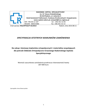 RADOMSKI SZPITAL SPECJALISTYCZNY im. Dr Tytusa Chałubińskiego 26-610 Radom, ul. Lekarska 4 Dział Zamówień Publicznych, Funduszy Strukturalnych i Zaopatrzenia www.szpital.radom.pl; [email protected] NIP: 796-00-12-187 tel.: (48) 361-52-85 REGON: 000315086 fax.: (48) 361-52-13 Znak sprawy: RSS/ZPFSiZ/P-35/2014 Radom, dnia 2014.08.11 SPECYFIKACJA ISTOTNYCH WARUNKÓW ZAMÓWIENIA Na zakup i dostawę implantów ortopedycznych i materiałów zespalających dla potrzeb Oddziału Ortopedyczno-Urazowego Radomskiego Szpitala Specjalistycznego Wartość szacunkowa zamówienia przekracza równowartość kwoty 207 000 Euro Sporządziła: Anna Skwarczyńska 1 KARTA UZGODNIEŃ do postępowania nr RSS/ZPFSiZ/P-35/2014 na zakup i dostawę implantów ortopedycznych i materiałów zespalających dla potrzeb Oddziału Ortopedyczno-Urazowego Radomskiego Szpitala Specjalistycznego ______________________________________________________________________ Radom, dn. 2014-08-11 -------------------------------………………..……………………… Sporządzający SIWZ: (podpis) Uzgadniam pod względem wymaganego zakresu zamówienia i warunków jego realizacji Andrzej Gajda …….……………………………………… (Z-ca Dyrektora ds. Lecznictwa) Uzgadniam i potwierdzam zabezpieczenie środków finansowych w/z Mirosława Wróbel …………………………………………… (Główny Księgowy) Potwierdzam, że warunki postępowania zostały uzgodnione i zaakceptowane przez Komisję Przetargową i są zgodne z ustawą Prawo zamówień publicznych Marzena Barwicka ……………………………………………. (Przewodniczący Komisji Przetargowej) Radom, dn. 2014.08.11 Zatwierdzam przedłożone dokumenty i wyrażam zgodę na rozpoczęcia postępowania Andrzej Pawluczyk …………………………………………………… Dyrektor Radomskiego Szpitala Specjalistycznego 2 ROZDZIAŁ I. INSTRUKCJA DLA WYKONAWCÓW ROZDZIAŁ II. OPI S PRZEDMIOTU ZAMÓWIENIA ROZDZIAŁ III. FORMULARZ OFERTY I FORMULARZE ZAŁĄCZNIKÓW DO OFERTY Załącznik nr 1 do oferty Oświadczenie wykonawcy zgodnie z art. 24 ust. 1 ustawy Pzp. Załącznik nr 2 do oferty Oświadczenie wykonawcy o spełnianiu warunków udziału w postępowaniu Załącznik nr 3,5 do oferty Specyfikacje techniczne dla części nr 1,2,3 Załącznik nr 4,6 do oferty Formularze cenowe dla części nr 1,2,3 ROZDZIAŁ IV. UMOWY – WZORY 3 ROZDZIAŁ I. INSTRUKCJA DLA WYKONAWCÓW 4 1. ZAMAWIAJĄCY Zamawiającym jest: Adres: Tel: Fax: E-mail: Adres strony internetowej: NIP: Nazwa banku i nr konta, na które Wykonawcy mogą wpłacać wadium: Radomski Szpital Specjalistyczny ul. Lekarska 4, 26-610 Radom +48 48 361-52-85 +48 48 361-52-13 [email protected] http://www.szpital.radom.pl 796-00-12-187 PEKAO SA I/O Radom 30124017891111000007770652 2. OPIS SPOSOBU POROZUMIEWANIA SIĘ ZAMAWIAJĄCEGO Z WYKONAWCAMI WRAZ ZE WSKAZANIEM PRZEZ ZAMAWIAJĄCEGO OSÓB UPRAWNIONYCH DO KONTAKTÓW 2.1. Wszelkiego rodzaju oświadczenia, wnioski, zawiadomienia oraz informacje itp. Zamawiający i Wykonawcy przekazują pisemnie, faksem lub drogą elektroniczną. 2.2. Jeżeli Zamawiający i Wykonawca przekazują oświadczenia, wnioski, zawiadomienia oraz informacje przekazane za pomocą faksu lub drogą elektroniczną, każda ze stron na żądanie drugiej niezwłocznie potwierdza fakt ich otrzymania. 2.3. Osobami uprawnionymi do kontaktów z Wykonawcami są: Pani Marzena Barwicka – Kierownik Działu Zamówień Publicznych Funduszy Strukturalnych i Zaopatrzenia tel. 48 361-52-85 3. TRYB POSTĘPOWANIA 3.1. Postępowanie o udzielenie zamówienia prowadzone jest w trybie przetargu nieograniczonego powyżej 207.000 Euro. 3.2. Na podstawie art. 39 ustawy z dnia 29 stycznia 2004 roku Prawo zamówień publicznych (tekst jedn. Dz. U. z 2013. Poz. 907 ze zm.). 3.3. Ilekroć w niniejszej Instrukcji Dla Wykonawców użyte jest pojęcie „Ustawa Pzp”, należy przez to rozumieć ustawę Prawo zamówień publicznych, o której mowa w pkt. 3.2. 4. OPIS PRZEDMIOTU ZAMÓWIENIA 4.1. Przedmiotem zamówienia jest zakup i dostawa implantów ortopedycznych i materiałów zespalających dla potrzeb Oddziału Ortopedyczno-Urazowego Radomskiego Szpitala Specjalistycznego 4.2. Przedmiot zamówienia nazywany jest w dalszej treści niniejszej Instrukcji dla Wykonawców „przedmiotem zamówienia”. 4.3.Główny przedmiot zamówienia wg Wspólnego Słownika Zamówień Publicznych: Nazwa części Część 1 artroskopia kolana CPV 33183100-7 implanty ortopedyczne Część 2 płytki, gwoździe, wkręty, śruby 33141770-8 wyroby używane w przypadku złamań, śruby, płyty 33141770-8 wyroby używane w przypadku złamań, śruby, płyty Część 3 wkręty stalowe, mikrowkręty, płytki rurowe i druty Kirschnera 5. TERMIN REALIZACJI PRZEDMIOTU ZAMÓWIENIA Termin realizacji zamówienia: 2 lata od daty zawarcia umowy. 5 6. WARUNKI UDZIAŁU W POSTĘPOWANIU WARUNKI UDZIAŁU W POSTĘPOWANIU ORAZ OPIS SPOSOBU DOKONYWANIA OCENY SPEŁNIANIA TYCH WARUNKÓW: O udzielenie zamówienia mogą ubiegać się wykonawcy, którzy spełniają warunki, dotyczące: 6.1) warunki podmiotowe: 6.1.1) Wykonawca spełnia warunki udziału w postępowaniu, o których mowa w art. 22, ust. 1 ustawy prawo zamówień publicznych 6.1.2) Wykonawca nie podlega wykluczeniu z postępowania o udzielenie zamówienia w związku z brakiem podstaw do wykluczenia z powodu niespełniania warunków, o których mowa w art. 24 ust. 1 ustawy prawo zamówień publicznych. 6.2) warunki przedmiotowe: 6.2.1) Oferowane wyroby medyczne muszą: a) być oznakowane znakiem CE, b) posiadać oznakowania i instrukcje używania w języku polskim, c) spełniać odnoszące się do nich wymagania zasadnicze. d) być dopuszczone do obrotu i używania na terenie RP 6.2.2) Oferowane wyroby medyczne muszą spełniać wymagania określone w opisie przedmiotu zamówienia 6.3 W celu potwierdzenia spełniania warunków udziału w postępowaniu Zamawiający żąda zło