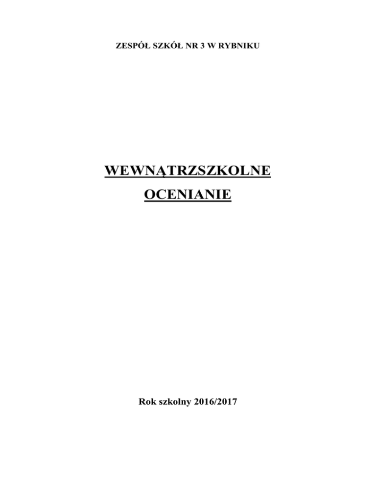 ZESPÓŁ SZKÓŁ NR 3 W RYBNIKU WEWNĄTRZSZKOLNE OCENIANIE Rok szkolny 2016/2017 SPIS TREŚCI I. ZAŁOŻENIA OGÓLNE II. CELE OCENIANIA 3 III. SZKOLNA SKALA OCEN: BIEŻĄCYCH, ŚRÓDROCZNYCH I KOŃCOWOROCZNYCH 3 3 IV. TERMINY KLASYFIKACJI ŚRÓDROCZNEJ I KOŃCOWOROCZNEJ V. WARUNKI OTRZYMANIA PROMOCJI 4 VI. WYMAGANIA EDUKACYJNE Z ZAKRESU KAŻDEGO PRZEDMIOTU 4 VII. SPOSOBY SPRAWDZANIA OSIĄGNIĘĆ EDUKACYJNYCH, EWALUACJA 4 6 VIII. SPOSOBY SPRAWDZANIA OSIĄGNIĘĆ EDUKACYJNYCH UCZNIA ZE SPECYFICZNYMI TRUDNOŚCIAMI W NAUCE. IX. 10 WARUNKI I TRYB UZYSKANIA WYŻSZEJ NIŻ PRZEWIDYWANA ROCZNEJ (SRÓDROCZNEJ) OCENY KLASYFIKACYJNEJ Z ZAJĘĆ EDUKACYJNYCH I Z ZACHOWANIA. 10 X. EGZAMINY POPRAWKOWE 11 XI. EGZAMIN KLASYFIKACYJNY 12 XII. ZASADY OCENIANIA ZACHOWANIA 14 XII.I. KRYTERIA OCENIANIA ZACHOWANIA UCZNIÓW V LICEUM 15 XII.II. KRYTERIA OCENIANIA ZACHOWANIA UCZNIÓW GIMNAZJUM NR 6 17 XIII. SYSTEM ODWOŁAWCZY OD OCENY ŚRÓDROCZNEJ I KOŃCOWOROCZNEJ 18 XIV. KORYGOWANIE NIEPOWODZEŃ I BRAKÓW EDUKACYJNYCH UCZNIÓW 20 XV. SPOSOBY INFORMOWANIA RODZICÓW/OPIEKUNÓW PRAWNYCH O OSIĄGNIĘCIACH, UZDOLNIENIACH I TRUDNOŚCIACH UCZNIÓW XVI. ZASADY OTRZYMYWANIA DO WGLĄDU PRZEZ UCZNIÓW I RODZICÓW/OPIEKUNÓW PRAWNYCH PRAC KONTROLNYCH 2 21 20 ZAŁOŻENIA OGÓLNE Wewnątrzszkolne ocenianie opracowano na podstawie Rozporządzenia Ministra Edukacji Narodowej z dnia 30 kwietnia 2007 r. z późniejszymi zmianami w sprawie warunków i sposobu oceniania, klasyfikowania i promowania uczniów i słuchaczy oraz przeprowadzania egzaminów i sprawdzianów w szkołach publicznych. Na podstawie art. 22 ust. 2 pkt 4 ustawy z dnia 7 września 1991 r. o systemie oświaty (Dz. U. z 2004 r. Nr 256, poz. 2572 z późn. zm.) Ocenianie jest procesem ustalania i przekazywania informacji o wynikach kształcenia uczniom i rodzicom wraz z ich uzasadnieniem. Ocenianie odbywa się zgodnie z poszanowaniem godności i praw obu stron – ocenianego i oceniającego. I.CELE OCENIANIA 1. 2. 3. 4. 5. 6. Wspieranie rozwoju intelektualnego i osobowości ucznia. Przygotowanie do samodzielnej pracy. Wdrażanie do systematycznej samokontroli i samooceny swojej pracy. Kształtowanie zachowań pożądanych społecznie. Rozróżnianie zachowań pozytywnych i negatywnych oraz stosowne reagowanie na nie. Określanie postępów i możliwości w osiągnięciach uczniów. II. SZKOLNA SKALA OCEN: BIEŻĄCYCH, ŚRÓDROCZNYCH I KOŃCOWOROCZNYCH 1. Dziennik jest prowadzony w formie elektronicznej. 2. Oceny są jawne zarówno dla ucznia jak i jego rodziców. 3. Skala ocen obowiązująca w szkole: celujący bardzo dobry dobry dostateczny dopuszczający niedostateczny 6 5 4 3 2 1 4. Oceny śródroczne i końcoworoczne wpisywane są słownie. 5. Dopuszcza się stosowanie innych oznaczeń jak np.: np – nieprzygotowany bz – bez zadania bk – brak książki % – procentowy wynik badania wiadomości i umiejętności ucznia nb – nieobecność ucznia na sprawdzianie/kartkówce itp. symbol „+” lub „-„ jako element zaznaczania aktywności na lekcji. X - jeśli uczeń nie pisał sprawdzianu/pracy klasowej bądź kartkówki z powodów innych niż nieobecność 6. Stosuje się dodatkowo oznaczenia dotyczące frekwencji: . (kropka) – obecność - (minus) – nieobecność u – nieobecność usprawiedliwiona 3 s – spóźnienie su – spóźnienie usprawiedliwione ns – nieobecność usprawiedliwiona potrzebami szkoły z – zwolnienie W – wagary 7. W dzienniku stosujemy kolory: niebieski, czarny, czerwony i zielony. Kolorem czerwonym wpisywane są oceny ze sprawdzianów/prac klasowych i ich popraw. III. TERMINY KLASYFIKACJI ŚRÓDROCZNEJ I KOŃCOWOROCZNEJ W szkole przeprowadza się jedną klasyfikację śródroczną w ostatnim tygodniu przed zimową przerwą świąteczną oraz klasyfikację końcoworoczną w ostatnim tygodniu zajęć szkolnych. Ocena śródroczna jest udokumentowana tylko w elektronicznym dzienniku lekcyjnym, zaś ocena końcoworoczna w elektronicznym dzienniku lekcyjnym i w arkuszach ocen ucznia. IV. WARUNKI OTRZYMANIA PROMOCJI I UKOŃCZENIA SZKOŁY 1. Uczeń otrzymuje promocję do klasy programowo wyższej, jeżeli ze wszystkich obowiązkowych zajęć edukacyjnych, określonych w szkolnym planie nauczania, uzyskał roczne oceny klasyfikacyjne wyższe od oceny niedostatecznej. 2. Uczeń kończy gimnazjum lub liceum, jeżeli na zakończenie klasy programowo najwyższej uzyskał oceny klasyfikacyjne z wszystkich obowiązkowych zajęć edukacyjnych wyższe od oceny niedostatecznej, a w przypadku gimnazjum jeżeli ponadto przystąpił do egzaminu gimnazjalnego. 3. Ocena klasyfikacyjna z zachowania nie ma wpływu na promocję do klasy programowo wyższej lub ukończenie szkoły. V. WYMAGANIA EDUKACYJNE Z ZAKRESU KAŻDEGO PRZEDMIOTU 1. Nauczyciele na początku każdego roku szkolnego informują uczniów, a na pierwszym zebraniu rodziców (prawnych opiekunów) o: a) wymaganiach edukacyjnych niezbędnych do uzyskania poszczególnych śródrocznych i rocznych ocen klasyfikacyjnych z obowiązkowych, uzupełniających i dodatkowych zajęć edukacyjnych, wynikających z realizowanego przez siebie programu nauczania, b) sposobach sprawdzania osiągnięć edukacyjnych uczniów, c) warunkach i trybie uzyskania wyższej niż przewidywana śródrocznej i końcoworocznej oceny klasyfikacyjnej z obowiązkowych, uzupełniających i dodatkowych zajęć edukacyjnych. 2. Wymagania edukacyjne w zakresie każdego przedmiotu ustalają nauczyciele w zespołach przedmiotowych, uwzględniając specyficzne potrzeby edukacyjne uczniów posiadających orzeczenia i opinie poradni psychologiczno-pedagogicznej. Każdy nauczyciel zapoznaje uczniów z wymaganiami na odpowiedni stopień na pierwszych zajęciach. 3. Nauczyciel formułuje wymagania edukacyjne stosując ogólne kryteria odpowiadające poszczególnym poziomom wymagań: 4 a) Wymagania wykraczające na stopień celujący obejmują treści: stanowiące efekt samodzielnej pracy (uczeń samodzielnie i twórczo roz