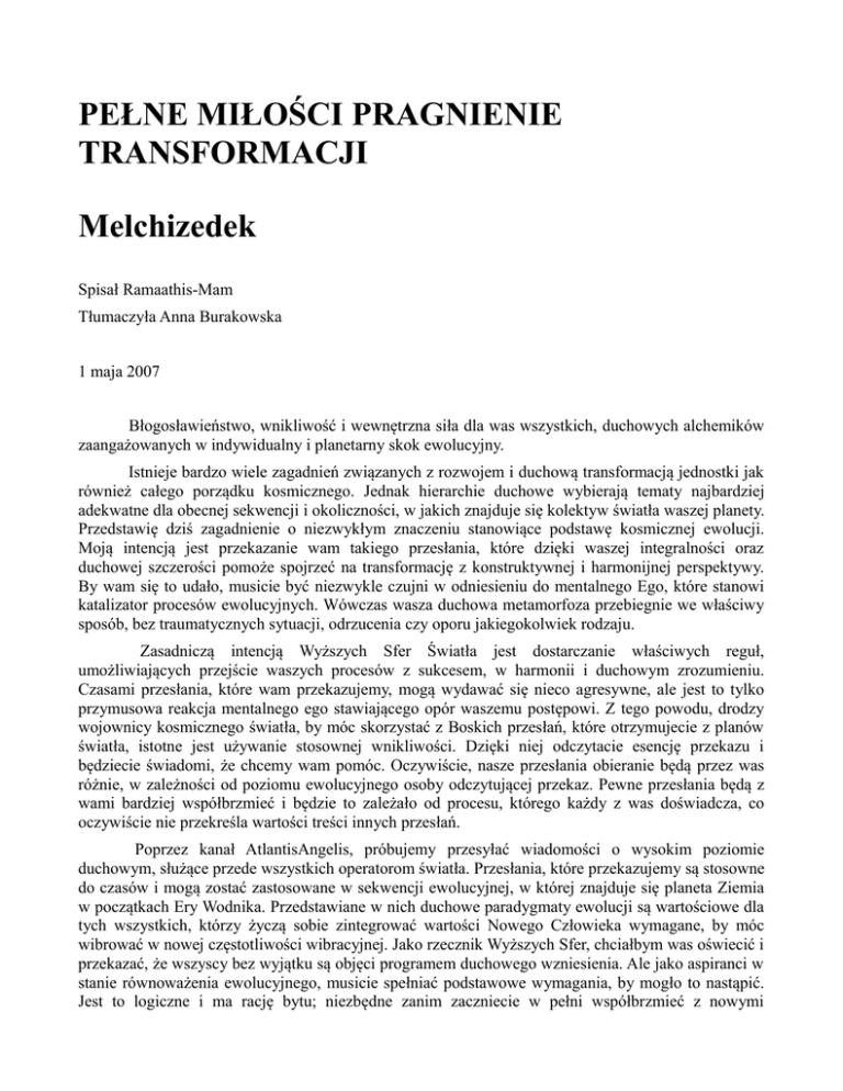 PEŁNE MIŁOŚCI PRAGNIENIE TRANSFORMACJI Melchizedek Spisał Ramaathis-Mam Tłumaczyła Anna Burakowska 1 maja 2007 Błogosławieństwo, wnikliwość i wewnętrzna siła dla was wszystkich, duchowych alchemików zaangażowanych w indywidualny i planetarny skok ewolucyjny. Istnieje bardzo wiele zagadnień związanych z rozwojem i duchową transformacją jednostki jak również całego porządku kosmicznego. Jednak hierarchie duchowe wybierają tematy najbardziej adekwatne dla obecnej sekwencji i okoliczności, w jakich znajduje się kolektyw światła waszej planety. Przedstawię dziś zagadnienie o niezwykłym znaczeniu stanowiące podstawę kosmicznej ewolucji. Moją intencją jest przekazanie wam takiego przesłania, które dzięki waszej integralności oraz duchowej szczerości pomoże spojrzeć na transformację z konstruktywnej i harmonijnej perspektywy. By wam się to udało, musicie być niezwykle czujni w odniesieniu do mentalnego Ego, które stanowi katalizator procesów ewolucyjnych. Wówczas wasza duchowa metamorfoza przebiegnie we właściwy sposób, bez traumatycznych sytuacji, odrzucenia czy oporu jakiegokolwiek rodzaju. Zasadniczą intencją Wyższych Sfer Światła jest dostarczanie właściwych reguł, umożliwiających przejście waszych procesów z sukcesem, w harmonii i duchowym zrozumieniu. Czasami przesłania, które wam przekazujemy, mogą wydawać się nieco agresywne, ale jest to tylko przymusowa reakcja mentalnego ego stawiającego opór waszemu postępowi. Z tego powodu, drodzy wojownicy kosmicznego światła, by móc skorzystać z Boskich przesłań, które otrzymujecie z planów światła, istotne jest używanie stosownej wnikliwości. Dzięki niej odczytacie esencję przekazu i będziecie świadomi, że chcemy wam pomóc. Oczywiście, nasze przesłania obieranie będą przez was różnie, w zależności od poziomu ewolucyjnego osoby odczytującej przekaz. Pewne przesłania będą z wami bardziej współbrzmieć i będzie to zależało od procesu, którego każdy z was doświadcza, co oczywiście nie przekreśla wartości treści innych przesłań. Poprzez kanał AtlantisAngelis, próbujemy przesyłać wiadomości o wysokim poziomie duchowym, służące przede wszystkich operatorom światła. Przesłania, które przekazujemy są stosowne do czasów i mogą zostać zastosowane w sekwencji ewolucyjnej, w której znajduje się planeta Ziemia w początkach Ery Wodnika. Przedstawiane w nich duchowe paradygmaty ewolucji są wartościowe dla tych wszystkich, którzy życzą sobie zintegrować wartości Nowego Człowieka wymagane, by móc wibrować w nowej częstotliwości wibracyjnej. Jako rzecznik Wyższych Sfer, chciałbym was oświecić i przekazać, że wszyscy bez wyjątku są objęci programem duchowego wzniesienia. Ale jako aspiranci w stanie równoważenia ewolucyjnego, musicie spełniać podstawowe wymagania, by mogło to nastąpić. Jest to logiczne i ma rację bytu; niezbędne zanim zaczniecie w pełni współbrzmieć z nowymi koncepcjami, wartościami, postawami i zwyczajami właśnie rozpoczynającego się cyklu Wodnika. Kiedy mówimy o transformacji, najczęściej sam termin już wywołuje w was napięcie i panikę, co stanowi przymusową i pełną niezgody reakcję właściwą waszemu mentalnemu ego. Ale dla wszystkich z was, którzy poznali i zbadali głębię planu mentalnego jest to coś, co powinniście zaakceptować jako codzienność aż do osiągnięcia punktu, w którym nie będą występowały w was tego rodzaju nieharmonijne mobilizacje emocjonalne. Wówczas pojawi się wystarczające zrozumienie duchowe i intensywne pragnienie, by wykorzystać wielką okazję do rozpuszczenia ograniczeń mentalnego ego izolującego was od procesu kosmicznej ewolucji. Negatywne reakcje na propozycje wewnętrznej transformacji stanowią typowe uprzedzenia ego, które jako cień waszej Ekspresji Świetlistej - Istoty Wyższej - dąży do trzymania was w izolacji od Wielkiego Prądu Miłości ograniczając do żałosnego więzienia oddzielenia, nieświadomości i zamieszania. Zatytułowałem ten przekaz „Pełne Miłości Pragnienie Transformacji”, ponieważ taka jest wewnętrzna natura waszej Ekspresji Świetlistej: Kochać oraz być pełnym życzliwości i współczucia w stosunku do siebie samych i procesów ewolucyjnych waszych współbraci. Oczywiście istnieje bardzo zakotwiczony w waszym ciele mentalnym, związany z transformacją schemat cierpienia, przyłączony w przeszłości w określonych warunkach kulturowych, społecznych i religijnych różnych inkarnacji. Ale teraz czasy się zmieniły i macie wielką sposobność zanurzenia się w nurcie wewnętrznej transformacji, ponieważ stanowi ona pierwotną przyczynę, dla której stworzona została manifestacja kosmiczna i nieskończoność jej wszechświatów. Jesteście elementem odnowy i duchowego wzniesienia, który Nieskończony Stwórca począł dla was wszystkich, bez wykluczeń żadnego typu. W miarę jak wasz System Słoneczny przechodzi przez pas antymagnetyczny Galaktyki, zbliżacie się coraz bardziej do ważnego punktu zagięcia ewolucyjnego, powodu, dla którego przygotowujemy was poprzez nasze przesłania i przekazywane reguły działania. Korzystając z duchowej percepcji, którą ofiaruje wam wasza Ekspresja Świetlista, kiedy wibrujecie w pełni obecności w momencie uniwersalnego teraz, będziecie mogli odkryć to, że prąd życia przepełniony jest niepowstrzymaną i nieuniknioną siłą mutacji. Wasze ciała mutują w każdej chwili na poziomach komórkowych i atomowych, ale nie możecie tego spostrzec w stadiach pośrednich transformacji, dopóki ta się nie zamanifestuje. Klimat waszej planety jak również ukształtowanie powierzchni nie są takie jak pięć tysięcy lat temu, nie mówiąc o czasach jeszcze wcześniejszych. Również wasza percepcja życia z czasem się zmienia. Wartości i koncepcje, które akceptowaliście kiedyś nie są tymi samymi, które uznajecie dzi
