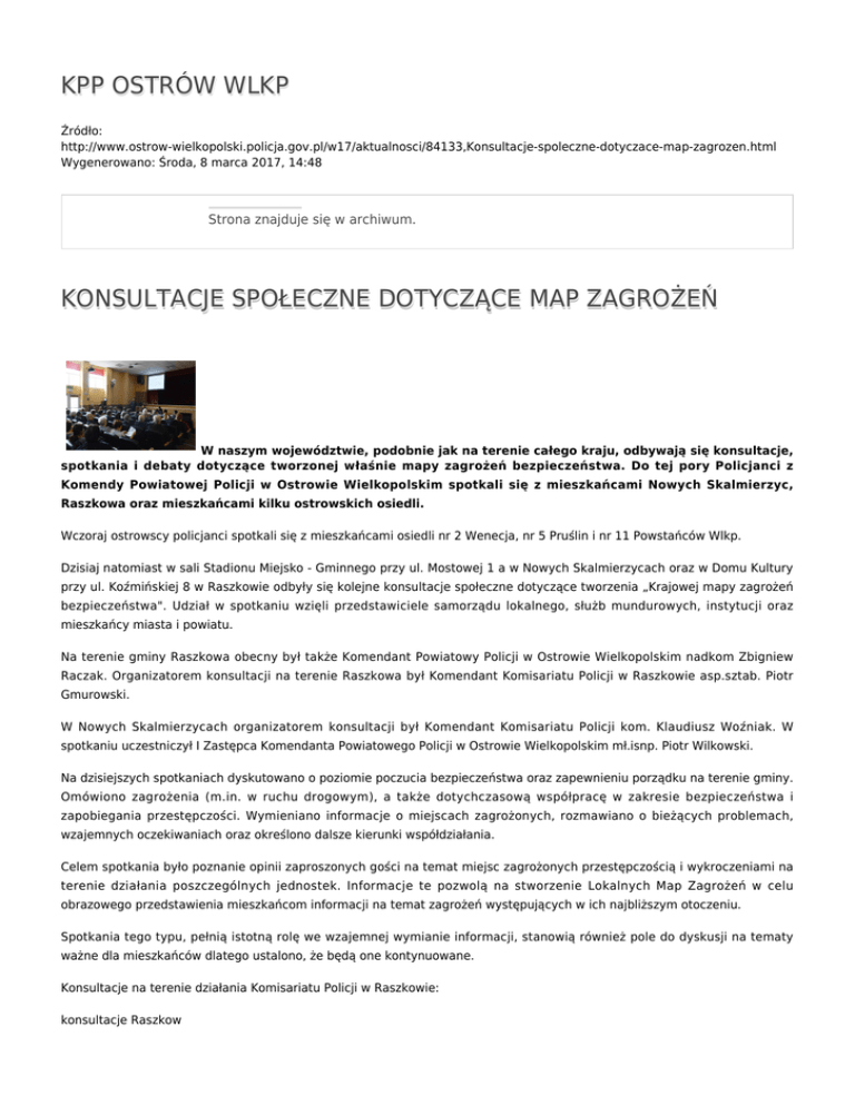 KPP OSTRÓW WLKP Źródło: http://www.ostrow-wielkopolski.policja.gov.pl/w17/aktualnosci/84133,Konsultacje-spoleczne-dotyczace-map-zagrozen.html Wygenerowano: Środa, 8 marca 2017, 14:48 Strona znajduje się w archiwum. KONSULTACJE SPOŁECZNE DOTYCZĄCE MAP ZAGROŻEŃ W naszym województwie, podobnie jak na terenie całego kraju, odbywają się konsultacje, spotkania i debaty dotyczące tworzonej właśnie mapy zagrożeń bezpieczeństwa. Do tej pory Policjanci z Komendy Powiatowej Policji w Ostrowie Wielkopolskim spotkali się z mieszkańcami Nowych Skalmierzyc, Raszkowa oraz mieszkańcami kilku ostrowskich osiedli. Wczoraj ostrowscy policjanci spotkali się z mieszkańcami osiedli nr 2 Wenecja, nr 5 Pruślin i nr 11 Powstańców Wlkp. Dzisiaj natomiast w sali Stadionu Miejsko - Gminnego przy ul. Mostowej 1 a w Nowych Skalmierzycach oraz w Domu Kultury przy ul. Koźmińskiej 8 w Raszkowie odbyły się kolejne konsultacje społeczne dotyczące tworzenia „Krajowej mapy zagrożeń bezpieczeństwa". Udział w spotkaniu wzięli przedstawiciele samorządu lokalnego, służb mundurowych, instytucji oraz mieszkańcy miasta i powiatu. Na terenie gminy Raszkowa obecny był także Komendant Powiatowy Policji w Ostrowie Wielkopolskim nadkom Zbigniew Raczak. Organizatorem konsultacji na terenie Raszkowa był Komendant Komisariatu Policji w Raszkowie asp.sztab. Piotr Gmurowski. W Nowych Skalmierzycach organizatorem konsultacji był Komendant Komisariatu Policji kom. Klaudiusz Woźniak. W spotkaniu uczestniczył I Zastępca Komendanta Powiatowego Policji w Ostrowie Wielkopolskim mł.isnp. Piotr Wilkowski. Na dzisiejszych spotkaniach dyskutowano o poziomie poczucia bezpieczeństwa oraz zapewnieniu porządku na terenie gminy. Omówiono zagrożenia (m.in. w ruchu drogowym), a także dotychczasową współpracę w zakresie bezpieczeństwa i zapobiegania przestępczości. Wymieniano informacje o miejscach zagrożonych, rozmawiano o bieżących problemach, wzajemnych oczekiwaniach oraz określono dalsze kierunki współdziałania. Celem spotkania było poznanie opinii zaproszonych gości na temat miejsc zagrożonych przestępczością i wykroczeniami na terenie działania poszczególnych jednostek. Informacje te pozwolą na stworzenie Lokalnych Map Zagrożeń w celu obrazowego przedstawienia mieszkańcom informacji na temat zagrożeń występujących w ich najbliższym otoczeniu. Spotkania tego typu, pełnią istotną rolę we wzajemnej wymianie informacji, stanowią również pole do dyskusji na tematy ważne dla mieszkańców dlatego ustalono, że będą one kontynuowane. Konsultacje na terenie działania Komisariatu Policji w Raszkowie: konsultacje Raszkow Konsultacje na terenie działania Komisariatu Policji w Nowych Skalmierzycach: konsultacje Nowe Skalmierzyce Konsultacje na terenie kilku ostrowskich osiedli: konsultacje osiedla Ostrow Ocena: 0/5 (0) Tweetnij