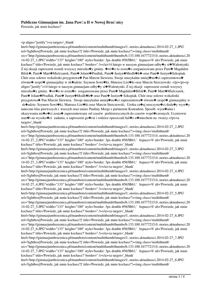 Publiczne Gimnazjum im. Jana Paw�a II w Nowej Brze�nicy Powiedz, jak mnie kochasz? <p align="justify"><a target='_blank' href='http://gimnazjumbrzeznica.pl/mambots/content/multithumb/images/1..stories.aktualnosci.2014-02-27_1.JPG' rel='lightbox[Powiedz, jak mnie kochasz?]' title='Powiedz, jak mnie kochasz?'><img class='multithumb' src="http://gimnazjumbrzeznica.pl/mambots/content/multithumb/thumbs/b.133.100.16777215.0..stories.aktualnosci.20 14-02-27_1.JPG"width="133" height="100" style='border: 3px double #565B61;' hspace='6' alt='Powiedz, jak mnie kochasz?' title='Powiedz, jak mnie kochasz?' border='' /></a>14 lutego w naszym gimnazjum odby�y si�Walentynki. Z tej okazji zaproszeni zostali wszyscy mieszka�y gminy. �wi�o to zosta�o zorganizowane przez Pani� Magdalen Bilsk�, Pani� Mari�Mielczarek, Pani� Jolant�Prudlak, Pani� Justyn�Modli�k� oraz Pani� Justyn�Szkopiak. Chór oraz solowe wokalistki przygotowa� Pan Marcin Siewiera. Swoje muzykalne umiej�no�ci zaprezentowa� równie� zespó� gimnazjalny w sk�adzie: Szymon Sowi�ki, Mateusz Lisi�ki oraz Marcin Sterczewski. </p><p><p align="justify">14 lutego w naszym gimnazjum odby�y si�Walentynki. Z tej okazji zaproszeni zostali wszyscy mieszka�y gminy. �wi�o to zosta�o zorganizowane przez Pani� Magdalen�Bilsk�, Pani� Mari�Mielczarek, Pani� Jolant�Prudlak, Pani� Justyn�Modli�k� oraz Pani� Justyn� Szkopiak. Chór oraz solowe wokalistki przygotowa� Pan Marcin Siewiera. Swoje muzykalne umiej�no�ci zaprezentowa� równie� zespó� gimnazjalny w sk�adzie: Szymon Sowi�ki, Mateusz Lisi�ki oraz Marcin Sterczewski. Uroku ca�ej uroczysto�ci doda�y wyst�y taneczne klas pierwszych i trzecich oraz taniec Pauliny Morgi z partnerem Konradem. Sposób wyra�ania i okazywania mi�o�ci zosta� zaprezentowany od czasów prehistorycznych do czasów wspó�czesnych. Uczniowie stan�i na wysoko�ci zadania, a zaproszeni go�cie i rodzice opuszczali hal�z u�miechem na twarzy.</p><a target='_blank' href='http://gimnazjumbrzeznica.pl/mambots/content/multithumb/images/1..stories.aktualnosci.2014-02-27_2.JPG' rel='lightbox[Powiedz, jak mnie kochasz?]' title='Powiedz, jak mnie kochasz?'><img class='multithumb' src="http://gimnazjumbrzeznica.pl/mambots/content/multithumb/thumbs/b.133.100.16777215.0..stories.aktualnosci.20 14-02-27_2.JPG"width="133" height="100" style='border: 3px double #565B61;' hspace='6' alt='Powiedz, jak mnie kochasz?' title='Powiedz, jak mnie kochasz?' border='' /></a><a target='_blank' href='http://gimnazjumbrzeznica.pl/mambots/content/multithumb/images/1..stories.aktualnosci.2014-02-27_3.JPG' rel='lightbox[Powiedz, jak mnie kochasz?]' title='Powiedz, jak mnie kochasz?'><img class='multithumb' src="http://gimnazjumbrzeznica.pl/mambots/content/multithumb/thumbs/b.133.100.16777215.0..stories.aktualnosci.20 14-02-27_3.JPG"width="133" height="100" style='border: 3px double #565B61;' hspace='6' alt='Powiedz, jak mnie kochasz?' title='Powiedz, jak mnie kochasz?' border='' /></a><a target='_blank' href='http://gimnazjumbrzeznica.pl/mambots/content/multithumb/images/1..stories.aktualnosci.2014-02-27_4.JPG' rel='lightbox[Powiedz, jak mnie kochasz?]' title='Powiedz, jak mnie kochasz?'><img class='multithumb' src="http://gimnazjumbrzeznica.pl/mambots/content/multithumb/thumbs/b.133.100.16777215.0..stories.aktualnosci.20 14-02-27_4.JPG"width="133" height="100" style='border: 3px double #565B61;' hspace='6' alt='Powiedz, jak mnie kochasz?' title='Powiedz, jak mnie kochasz?' border='' /></a><a target='_blank' href='http://gimnazjumbrzeznica.pl/mambots/content/multithumb/images/1..stories.aktualnosci.2014-02-27_5.JPG' rel='lightbox[Powiedz, jak mnie kochasz?]' title='Powiedz, jak mnie kochasz?'><img class='multithumb' src="http://gimnazjumbrzeznica.pl/mambots/content/multithumb/thumbs/b.133.100.16777215.0..stories.aktualnosci.20 14-02-27_5.JPG"width="133" height="100" style='border: 3px double #565B61;' hspace='6' alt='Powiedz, jak mnie kochasz?' title='Powiedz, jak mnie kochasz?' border='' /></a><a target='_blank' href='http://gimnazjumbrzeznica.pl/mambots/content/multithumb/images/1..stories.aktualnosci.2014-02-27_6.JPG' rel='lightbox[Powiedz, jak mnie kochasz?]' title='Powiedz, jak mnie kochasz?'><img class='multithumb' src="http://gimnazjumbrzeznica.pl/mambots/content/multithumb/thumbs/b.133.100.16777215.0..stories.aktualnosci.20 14-02-27_6.JPG"width="133" height="100" style='border: 3px double #565B61;' hspace='6' alt='Powiedz, jak mnie kochasz?' title='Powiedz, jak mnie kochasz?' border='' /></a><a target='_blank' href='http://gimnazjumbrzeznica.pl/mambots/content/multithumb/images/1..stories.aktualnosci.2014-02-27_7.JPG' rel='lightbox[Powiedz, jak mnie kochasz?]' title='Powiedz, jak mnie kochasz?'><img class='multithumb' src="http://gimnazjumbrzeznica.pl/mambots/content/multithumb/thumbs/b.133.100.16777215.0..stories.aktualnosci.20 14-02-27_7.JPG"width="133" height="100" style='border: 3px double #565B61;' hspace='6' alt='Powiedz, jak mnie kochasz?' title='Powiedz, jak mnie kochasz?' border='' /></a><a target='_blank' href='http://gimnazjumbrzeznica.pl/mambots/content/multithumb/images/1..stories.aktualnosci.2014-02-27_8.JPG' rel='lightbox[Powiedz, jak mnie kochasz?]' title='Powiedz, jak mnie kochasz?'><img class='multithumb' strona 1 / 4 Publiczne Gimnazjum im. Jana Paw�a II w Nowej Brze�nicy Powiedz, jak mnie kochasz? src="http://gimnazjumbrzeznica.pl/mambots/content/multithumb/thumbs/b.133.100.16777215.0..stories.aktualnosci.20 14-02-27_8.JPG"width="133" height="100" style='border: 3px double #565B61;' hspace='6' alt='Powiedz, jak mnie kochasz?' title='Powiedz, jak mnie kochasz?' border='' /></a><a target='_blank' href='http://gimnazjumbrzeznica.pl/mambots/content/multithumb/images/1..stories.aktualnosci.2014-02-27_9.JPG' rel='lightbox[Powiedz, jak mnie kochasz?]' title='Powiedz, jak mnie kochasz?'><img class='multithumb'