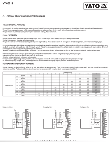 YT-06019 PL PRZYRZĄD DO KONTROLI NACIĄGU PASKA ROZRZĄDU CHARAKTERYSTYKA PRZYRZĄDU Przyrząd służy do pomiaru stopnia naciągu paska rozrządu. Produkt jest przyrządem uniwersalnym, dostosowanym do pasków o różnych szerokościach i wysokościach. Uwaga! Przed rozpoczęciem pracy należy zapoznać się z dokumentacją techniczną silnika i ustalić jaki naciąg paska przewidział producent. Uwaga! Produkt nie jest narzędziem pomiarowym w rozumieniu ustawy „Prawo o miarach”. PRACA PRZYRZĄDEM Uwaga! Pomiary wolno wykonywać tylko przy wyłączonym silniku i schłodzonym silniku. Należy odłączyć przewody akumulatora. Uwaga! Podczas pracy stosować rękawice ochronne. Uwaga! Nie wykręcać pokrętła poza ostatnią podziałkę skali na prowadnicy. Może doprowadzić to do zmniejszenia dokładności pomiaru, a nawet zniszczenia przyrządu. Przyrząd posiada dwie skale. Skala na prowadnicy pokrętła odpowiada całkowitej nastawionej wartości, a skala na pokrętle informuje o częściach dziesiętnych nastawionej wartości. Skala na pokrętle jest wyrażona w dużych i małych cyfrach. Duże cyfry wskazują części dziesiętne, odczyt należy prowadzić na przecięciu ze skalą na prowadnicy. Cyfry małe oznaczają skalę pomocniczą, pozwalającą na szybsze ustawienie. Wewnątrz prowadnicy porusza się końcówka pomiarowa z przymocowanym trzpieniem, który podczas pomiaru na skali prowadnicy pokazuje stopień naciągu paska. Przyrząd założyć na pasek w miejscu przewidzianym przez producenta silnika lub w połowie odległości pomiędzy kołami pasowymi. Pokrętłem nastawić wartość obciążenia zalecaną przez producenta. Odczytać wskazania trzpienia pokazujące ugięcie paska. Wyregulować naciąg paska zgodnie z procedurą przewidzianą przez producenta silnika, aż do osiągnięcia zalecanego stopnia naciągu. Po dokonaniu regulacji naciągu paska, zaleca się powtórzyć pomiar. Pozwoli to osiągnąć większą pewność i dokładność pomiaru. PRZYKŁAD POMIARU ZA POMOCĄ PRZYRZĄDU Uwaga! Fragment przykładowej tabeli, która ma na celu tylko pokazanie zasady pomiaru. Przed rozpoczęciem regulacji naciągu pasa należy odczytać wartości w dokumentacji dołączonej do silnika. Producent nie bierze odpowiedzialności za szkody powstałe w wyniku użycia nastaw z poniższej tabeli. 1,0 Ugięcie paska [mm] 1,5 2,0 2,5 3,0 15 19,8 15,5 19,3 15,0 18,8 14,5 18,3 14,0 17,8 13,5 N S T R U K C J A 40 45 50 19,9 16,0 19,4 15,5 18,9 15,0 18,4 14,5 17,9 14,0 17,4 13,5 19,5 16,0 19,0 15,5 18,5 15,0 18,0 14,5 17,5 14,0 17,0 13,5 19,0 16,0 18,5 15,5 18,0 15,0 17,5 14,5 17,0 14,0 16,5 13,5 18,6 16,0 18,1 15,5 17,6 15,0 17,1 14,5 16,6 14,0 16,1 13,5 - 17 OBCIĄŻENIE 8 UGIĘCIE- OBCIĄŻENIE 14 OBCIĄŻENIE UGIĘCIE- I 35 Naciąg zbyt silny - 17 Naciąg zbyt luźny - 17 Naciąg prawidłowy 19,8 15,0 19,3 14,5 18,8 14,0 18,3 13,5 19,7 14,5 19,2 14,0 18,7 13,5 19,7 14,0 19,2 13,5 19,6 13,5 Obciążenie paska [N] 25 30 20 O B S Ł U G I 15 0,5 Obciążenie Ugięcie Obciążenie Ugięcie Obciążenie Ugięcie Obciążenie Ugięcie Obciążenie Ugięcie Obciążenie Ugięcie Obciążenie Ugięcie 10 UGIĘCIE- 0,0 0 23,5 16,5