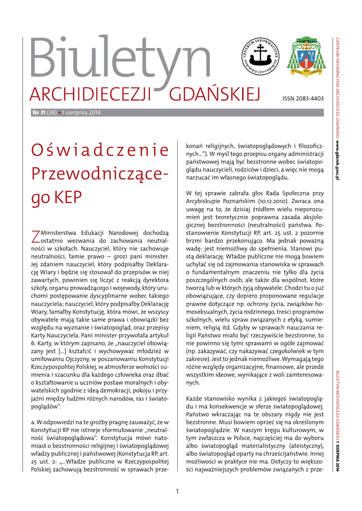 Nr 31 (38) • 1 sierpnia 2014 Oświadczenie Przewodniczącego KEP konań religijnych, światopoglądowych i filozoficznych...”). W myśl tego przepisu organy administracji państwowej mają być bezstronne wobec światopoglądu nauczycieli, rodziców i dzieci, a więc nie mogą narzucać im własnego światopoglądu. Z Ministerstwa Edukacji Narodowej dochodzą ostatnio wezwania do zachowania neutralności w szkołach. Nauczyciel, który nie zachowuje neutralności, łamie prawo – grozi pani minister. Jej zdaniem nauczyciel, który podpisałby Deklarację Wiary i będzie się stosował do przepisów w niej zawartych, powinien się liczyć z reakcją dyrektora szkoły, organu prowadzącego i wojewody, który uruchomi postępowanie dyscyplinarne wobec takiego nauczyciela; nauczyciel, który podpisałby Deklarację Wiary, łamałby Konstytucję, która mówi, że wszyscy obywatele mają takie same prawa i obowiązki bez względu na wyznanie i światopogląd, oraz przepisy Karty Nauczyciela. Pani minister przywołała artykuł 6. Karty, w którym zapisano, że „nauczyciel obowiązany jest […] kształcić i wychowywać młodzież w umiłowaniu Ojczyzny, w poszanowaniu Konstytucji Rzeczypospolitej Polskiej, w atmosferze wolności sumienia i szacunku dla każdego człowieka oraz dbać o kształtowanie u uczniów postaw moralnych i obywatelskich zgodnie z ideą demokracji, pokoju i przyjaźni między ludźmi różnych narodów, ras i światopoglądów”. Każde stanowisko wynika z jakiegoś światopoglądu i ma konsekwencje w sferze światopoglądowej. Państwo wkraczając na te obszary nigdy nie jest bezstronne. Musi bowiem oprzeć się na określonym światopoglądzie. W naszym kręgu kulturowym, w tym zwłaszcza w Polsce, najczęściej ma do wyboru albo światopogląd materialistyczny (ateistyczny), albo światopogląd oparty na chrześcijaństwie. Innej możliwości w praktyce nie ma. Dotyczy to większości najważniejszych problemów związanych z prze- a. W odpowiedzi na te groźby pragnę zauważyć, że w Konstytucji RP nie istnieje sformułowanie „neutralność światopoglądowa”. Konstytucja mówi natomiast o bezstronności religijnej i światopoglądowej władzy publicznej i państwowej (Konstytucja RP, art. 25 ust. 2: „...Władze publiczne w Rzeczypospolitej Polskiej zachowują bezstronność w sprawach prze- 1 Biuletyn Archidiecezji Gdańskiej 1 sierpnia 2014 W tej sprawie zabrała głos Rada Społeczna przy Arcybiskupie Poznańskim (10.12.2010). Zwraca ona uwagę na to, że dzisiaj źródłem wielu nieporozumień jest teoretycznie poprawna zasada aksjologicznej bezstronności (neutralności) państwa. Postanowienie Konstytucji RP, art. 25 ust. 2 pozornie brzmi bardzo przekonująco. Ma jednak poważną wadę: jest niemożliwy do spełnienia. Stanowi pustą deklarację. Władze publiczne nie mogą bowiem uchylać się od zajmowania stanowiska w sprawach o fundamentalnym znaczeniu nie tylko dla życia poszczególnych osób, ale także dla wspólnot, które tworzą lub w których żyją obywatele. Chodzi tu o już obowiązujące, czy dopiero proponowane regulacje prawne dotyczące np. ochrony życia, związków homoseksualnych, życia rodzinnego, treści programów szkolnych, wielu spraw związanych z etyką, sumieniem, religią itd. Gdyby w sprawach nauczania religii Państwo miało być rzeczywiście bezstronne, to nie powinno się tymi sprawami w ogóle zajmować (np. zakazywać, czy nakazywać czegokolwiek w tym zakresie). Jest to jednak niemożliwe. Wymagają tego różne względy organizacyjne, finansowe, ale przede wszystkim ideowe, wynikające z woli zainteresowanych. Centrum Informacyjne Archidiecezji Gdańskiej www.gdansk.gosc.pl ISSN 2083-4403 Biuletyn Archidiecezji Gdańskiej 1 sierpnia 2014 Centrum Informacyjne Archidiecezji Gdańskiej www.gdansk.gosc.pl nr 31 (288) się wraz z religią i moralnością do sfery tego, co subiektywne – na kryzys Zachodu nie ma lekarstwa, a Europa skazana jest na regres. Jeśli jednak sumienie odkrywa się na nowo jako miejsce słuchania prawdy i dobra, odpowiedzialności przed Bogiem i braćmi w człowieczeństwie, która jest siłą przeciw wszelkiej dyktaturze, to wówczas jest nadzieja na przyszłość” (Benedykt XVI, Zgrzeb, 5.06.2011). konaniami religijnymi, światopoglądowymi i filozoficznymi obywateli, które każde państwo zmuszone jest jakoś regulować prawnie. Jeżeli np. państwo obejmuje ochroną prawną cały proces ludzkiego życia, albo legalizuje przerywanie tego życia w arbitralnie określanym przez siebie momencie, sytuacji ekonomicznej, czy zdrowotnej lub pozostawia osobom trzecim decyzję o życiu innych, to nie można nazywać tego bezstronnością prawodawcy. Prawodawca może jedynie zastępować rozwiązania oparte na jednym światopoglądzie regulacjami zgodnymi z innym światopoglądem. Musi jednak zawsze stanąć po stronie określonych poglądów. Gdy dochodzi do konfliktu między dobrze uformowanym sumieniem a prawem stanowionym, obywatel ma zawsze prawo do sprzeciwu sumienia. „Obywatel nie jest zobowiązany w sumieniu do przestrzegania zarządzeń władz cywilnych, jeżeli są one sprzeczne z wymogami porządku moralnego, z podstawowymi prawami osób lub wskazaniami Ewangelii (Katechizm Kościoła Katolickiego, 2242). b. To właśnie jest źródłem konfliktów sumienia u ludzi prawych. Bo chociaż większość zgadza się co do świeckiego charakteru państwa, co do tego, że państwo powinno mieć charakter świecki, to jednak niektórzy utożsamiają świeckość z laicyzmem, który postuluje zamknięcie religii w sferze życia prywatnego jednostki, co w praktyce oznacza czynną ateizację. Zasada świeckości państwa powinna być rozumiana jedynie w ten sposób, że władze publiczne nie będą narzucały obywatelom wyznawania określonej religii lub ideologii. Świeckość państwa nie polega zatem na usuwaniu krzyży z przestrzeni publicznej lub religii ze szkół, ale raczej na d