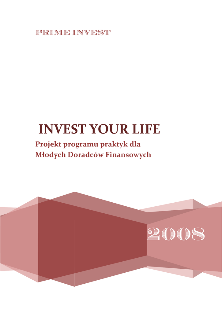INVEST YOUR LIFE Projekt programu praktyk dla Młodych Doradców Finansowych INVEST YOUR LIFE Strona 2 INVEST YOUR LIFE Cele: Zwiększyć wiedzę uczestników programu nt. doradztwa finansowego Przygotować uczestników do zawodu doradcy finansowego Korzyści dla Ciebie: Jeśli jesteś osobą zainteresowaną dziedziną doradztwa finansowego praktyki pomogą Ci zrozumieć: Czym jest nowoczesne doradztwo finansowe, Na czym polega zawód doradcy finansowego, Jaki jest charakter jego pracy, Jak zarządzać finansami Klienta, Jak skutecznie budować portfel Klientów. Oferujemy Ci: możliwość usamodzielnienia się już podczas studiów w renomowanej firmie i branży zdobycie cennego doświadczenia alternatywę – jeśli nie wiążesz swojej przyszłości z wielkimi korporacjami, cenne szkolenia: po każdym uczestnicy otrzymują certyfikaty. Bądź PRIME wśród wszystkich! Na kogo czekamy? Oczekujemy na zgłoszenia osób zainteresowanych finansami, które aktualnie są studentami IV i V roku lub absolwentami (szkół wyższych i policealnych), w przypadku których od momentu ukończenia nauki nie upłynęło 1,5 roku. Od uczestników programu wymagamy przede wszystkim konsekwencji i zaangażowania. Nasi praktykanci to osoby o wysokiej kulturze osobistej. Pamiętaj: nie ważne co studiujesz – ważne kim jesteś. Strona 3 INVEST YOUR LIFE Rekrutacja Na zgłoszenia czekamy do 29 lutego 2008. Swoje CV wraz z listem motywacyjnym uzasadniającym udział w programie prześlij na adres: odpowiedzialność@primeinvest.pl PRIME INVEST jest nową jakością na rynku usług finansowych. Nie trzymamy się przetartych szlaków. Ty też się nie trzymaj. Nie staraj się wpisać w formularze – wyjdź poza nie. Po analizie zgłoszeń zaprosimy wybrane osoby na pierwszą rozmowę kwalifikacyjną. Kolejnym etapem będzie napisanie testu, który jest przepustką do Assesment Centre. Jeśli przekonasz nas, że jesteś tym kogo szukamy, zaprosimy Cię na rozmowę końcową, podczas której podejmiemy decyzję. Strona 4 INVEST YOUR LIFE Program praktyk 1. Okres przygotowawczy Celem okresu wstępnego jest wprowadzenie Cię w świat doradztwa finansowego i szeroko pojętych finansów. Jest to także okres sprawdzający Twoją aktywność. W tym czasie Twoim zadaniem będzie realizacja mini projektów w grupie z innymi uczestnikami. 2. Okres właściwy Głównymi elementami tego okresu są szkolenia miękkie, twarde oraz realizacja samodzielnego projektu. 3. Kontynuacja Dla osób, które wyróżniły się w trakcie praktyk oferujemy stałą współpracę, a tym samym samodzielność, niezależność i duże możliwości rozwoju. PRIME jest pierwszą firmą oferującą tak kompleksowe praktyki z zakresu doradztwa finansowego i pierwszą firmą udostępniającą mentorski program praktyk doradztwa finansowego. Strona 5