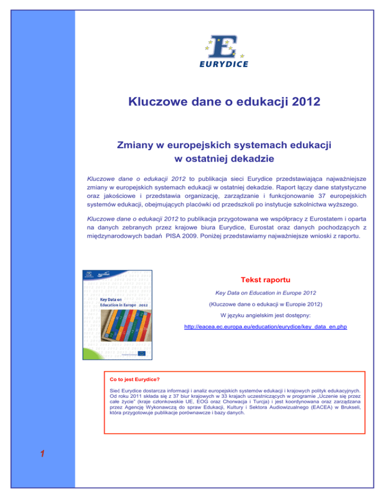Kluczowe dane o edukacji 2012 Zmiany w europejskich systemach edukacji w ostatniej dekadzie Kluczowe dane o edukacji 2012 to publikacja sieci Eurydice przedstawiająca najważniejsze zmiany w europejskich systemach edukacji w ostatniej dekadzie. Raport łączy dane statystyczne oraz jakościowe i przedstawia organizację, zarządzanie i funkcjonowanie 37 europejskich systemów edukacji, obejmujących placówki od przedszkoli po instytucje szkolnictwa wyższego. Kluczowe dane o edukacji 2012 to publikacja przygotowana we współpracy z Eurostatem i oparta na danych zebranych przez krajowe biura Eurydice, Eurostat oraz danych pochodzących z międzynarodowych badań PISA 2009. Poniżej przedstawiamy najważniejsze wnioski z raportu. Tekst raportu Key Data on Education in Europe 2012 (Kluczowe dane o edukacji w Europie 2012) W języku angielskim jest dostępny: http://eacea.ec.europa.eu/education/eurydice/key_data_en.php Co to jest Eurydice? Sieć Eurydice dostarcza informacji i analiz europejskich systemów edukacji i krajowych polityk edukacyjnych. Od roku 2011 składa się z 37 biur krajowych w 33 krajach uczestniczących w programie „Uczenie się przez całe życie” (kraje członkowskie UE, EOG oraz Chorwacja i Turcja) i jest koordynowana oraz zarządzana przez Agencję Wykonawczą do spraw Edukacji, Kultury i Sektora Audiowizualnego (EACEA) w Brukseli, która przygotowuje publikacje porównawcze i bazy danych. 1 WYDŁUŻENIE CZASU TRWANIA OBOWIĄZKOWEJ NAUKI Czas trwania kształcenia obowiązkowego w Europie, 1980/81-2010/11 W niepełnym wymiarze (kształcenie kursowe) Żródło: Eurydice. Kształcenie obowiązkowe w niektórych krajach rozpoczyna się już w przedszkolu (tak jak w Polsce, gdzie dzieci obowiązkowo realizują roczne przygotowanie do edukacji szkolnej), a następnie obejmuje obowiązek szkolny. Ponadto w niektórych krajach legislacja nakazuje uczniom, którzy zrealizowali obowiązek szkolny kontynuować naukę do określonego wieku (jak w Polsce, gdzie obowiązek nauki wg. Konstytucji RP trwa do 18 lat). We wszystkich europejskich systemach edukacji obserwuje się wyraźną tendencję do wydłużania czasu trwania kształcenia obowiązkowego. W trzynastu krajach (m.in. w Polsce), na przełomie ponad 20 lat w wyniku reform wiek zakończenia obowiązkowego kształcenia podniesiono o rok lub dwa lata, a w Portugalii – o trzy lata. 2 Odsetek dzieci w wieku 3- 7 lat uczęszczających do przedszkoli i szkół, 2009 W latach 2000-2009 wzrosła w Europie liczba dzieci w wieku 3-5 lat uczęszczających do przedszkoli bądź szkół. W grupie 3-latków wzrost ten wyniósł przeciętnie 15,3 procent, co oznacza że około 77 % najmłodszych Europejczyków chodzi do przedszkola. 3 WIĘCEJ AUTONOMII DLA SZKÓŁ I UCZELNI Zakres autonomii szkoły w zarządzaniu kadrą szkolnictwo podstawowe i średnie I i II stopnia (ISCED 1-3), 2010/11 W odniesieniu do dyrektora szkoły Wybór dyrektora szkoły Określanie zadań i zakresu odpowiedzialności dyrektora szkoły W odniesieniu do nauczycieli Rekrutacja nowych nauczycieli Rekrutacja nauczycieli na zastępstwo Zwalnianie nauczycieli z pracy Określanie zadań i zakresu odpowiedzialności nauczycieli Lewa strona ISCED 1 Prawa strona ISCED 2-3 Pełna Ograniczona Brak Nie autonomia autonomia autonomii dotyczy Prawo podejmowania decyzji może zostać przekazane szkole przez władze lokalne Źródło: Eurydice. Autonomia szkoły wyraźnie wzrosła w ostatniej dekadzie w niektórych obszarach. Szkoły mają znacznie więcej swobody w podejmowaniu decyzji takich jak wybór metod dydaktycznych i podręczników, podział uczniów na grupy czy organizowanie wewnętrznego oceniania uczniów. Sami nauczyciele mają większą autonomię w odniesieniu do wyboru metod nauczania, wyznaczania wewnętrznych reguł oceniania oraz wyboru podręczników niż w kwestii podziału uczniów na grupy. 4 POMIMO ROSNĄCEGO WSPARCIA DLA NAUCZYCIELI ZAWÓD NADAL NIE JEST ATRAKCYJNY Wyraźnie spada w Europie liczba absolwentów kończących studia na kierunkach pedagogicznych. Spadek ten może w najbliższej przyszłości prowadzić do niedoborów kadry nauczycielskiej, szczególnie w tych krajach, w których większość nauczycieli jest w wieku przedemerytalnym. W Niemczech, Włoszech i Szwecji niemal połowa nauczycieli w szkołach podstawowych znajduje się w grupie wiekowej 50 +, czyli zbliża się do wieku emerytalnego. W Polsce największą grupę stanowią nauczyciele w wieku 40-49 lat. W rzeczywistości już w roku 2009 odnotowano niedobór nauczycieli najważniejszych przedmiotów. Niedobory wykwalifikowanych nauczycieli podstawowych przedmiotów, 2009 (na podstawie badań 15 - latków, PISA) Nauczyciele matematyki Nauczyciele przedmiotów ścisłych i przyrodniczych Nauczyciele języka ojczystego Kraj nie brał udziału w badaniach Źródło: OECD, PISA 2009. 5 ABSOLWENCI STUDIÓW WYŻSZYCH ZNAJDUJĄ ZATRUDNIENIE DWA RAZY SZYBCIEJ NIŻ OSOBY Z NIŻSZYMI KWALIFIKACJAMI Przeciętny okres poszukiwania pierwszej pracy według poziomu wykształcenia, 2009 Miesiące Miesiące Wykształcenie na poziomie szkoły gimnazjalnej i poniżej Wykształcenie na poziomie szkoły ponadgimnazjalnej Wykształcenie wyższe Źródło: Eurostat, Labour Force Survey-ad-hoc module (Badanie Aktywności Ekonomicznej Ludności) (dane z czerwca 2011 r.) Absolwenci szkół wyższych wchodzą na rynek pracy dwa razy szybciej niż osoby z niższymi kwalifikacjami. Absolwent uczelni poszukuje pracy przeciętnie ok. 5 miesięcy, natomiast niemal 10 (9,8) miesięcy poświęca na to osoba o niższych kwalifikacjach. W 2009 r. przeciętny czas poszukiwania pierwszej pracy wynosił w Unii Europejskiej około 6,5 miesiąca, niezależnie od kwalifikacji. 6
