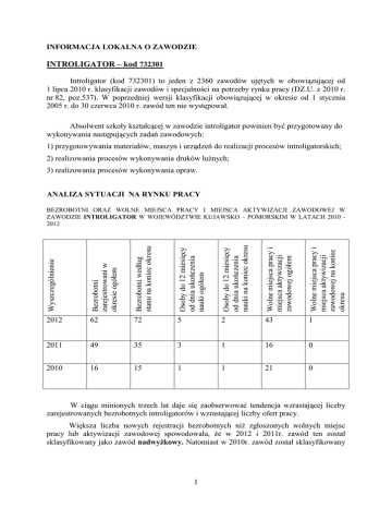 INFORMACJA LOKALNA O ZAWODZIE INTROLIGATOR – kod 732301 Introligator (kod 732301) to jeden z 2360 zawodów ujętych w obowiązującej od 1 lipca 2010 r. klasyfikacji zawodów i specjalności na potrzeby rynku pracy (DZ.U. z 2010 r. nr 82, poz.537). W poprzedniej wersji klasyfikacji obowiązującej w okresie od 1 stycznia 2005 r. do 30 czerwca 2010 r. zawód ten nie występował. Absolwent szkoły kształcącej w zawodzie introligator powinien być przygotowany do wykonywania następujących zadań zawodowych: 1) przygotowywania materiałów, maszyn i urządzeń do realizacji procesów introligatorskich; 2) realizowania procesów wykonywania druków luźnych; 3) realizowania procesów wykonywania opraw. ANALIZA SYTUACJI NA RYNKU PRACY Wyszczególnienie Bezrobotni zarejestrowani w okresie ogółem Bezrobotni według stanu na koniec okresu Osoby do 12 miesięcy od dnia ukończenia nauki ogółem Osoby do 12 miesięcy od dnia ukończenia nauki na koniec okresu Wolne miejsca pracy i miejsca aktywizacji zawodowej ogółem Wolne miejsca pracy i miejsca aktywizacji zawodowej na koniec okresu BEZROBOTNI ORAZ WOLNE MIEJSCA PRACY I MIEJSCA AKTYWIZACJI ZAWODOWEJ W ZAWODZIE INTROLIGATOR W WOJEWÓDZTWIE KUJAWSKO – POMORSKIM W LATACH 2010 2012 2012 62 72 5 2 43 1 2011 49 35 3 1 16 0 2010 16 15 1 1 21 0 W ciągu minionych trzech lat daje się zaobserwować tendencja wzrastającej liczby zarejestrowanych bezrobotnych introligatorów i wzrastającej liczby ofert pracy. Większa liczba nowych rejestracji bezrobotnych niŜ zgłoszonych wolnych miejsc pracy lub aktywizacji zawodowej spowodowała, Ŝe w 2012 i 2011r. zawód ten został sklasyfikowany jako zawód nadwyŜkowy. Natomiast w 2010r. zawód został sklasyfikowany 1 jako deficytowy, czyli odnotowano w zawodzie introligator większą liczbę zgłoszonych wolnych miejsc pracy lub aktywizacji zawodowej od liczby nowych rejestracji bezrobotnych.1 WYNIKI BADAŃ PRACODAWCÓW 2 W badaniach ankietowych pracodawców w 2012r., pracodawcy nie zgłaszali planów zatrudnienia lub zwolnienia osób w zawodzie introligator. Z badań przeprowadzonych wśród pracodawców w 2012r., wynika, iŜ zawód introligator nie pojawił się w pięcioletniej perspektywie zapotrzebowania na zawody tj. do 2017r. W badaniu zrealizowanym w 2011r. pracodawcy planowali zatrudnić 3 osoby w zawodzie introligator oraz 7 osób w zawodzie introligator poligraficzny. Pracodawca z powiatu inowrocławskiego planował zatrudnić 3 osoby w zawodzie introligator, powodem zatrudnienia było uzupełnienie braków kadrowych. Oferty dotyczące zawodu introligator poligraficzny pochodziły z Torunia, powodem zatrudnienia był rozwój firmy. Pracodawcy w badaniu w 2011 roku planowali zwolnienie 39 osób w zawodzie introligator. Plany zwolnień dotyczyły Bydgoszczy. W badaniu ankietowym pracodawców, zrealizowanym w 2010r., plany zatrudnienia pracowników obejmowały 2 osoby w zawodzie introligator poligraficzny. Plany te dotyczyły Torunia, powodem zatrudnienia był wzrost popytu na produkty i usługi. ANALIZA KSZTAŁCENIA W ZAWODZIE, OFERTA KSZTAŁCENIA – SYSTEM OŚWIATY SZKOLNEJ I POZASZKOLNEJ 3 Rozporządzenie Ministra Edukacji Narodowej z dnia 23 grudnia 2011 roku w sprawie klasyfikacji zawodów szkolnictwa zawodowego określa, Ŝe zawód introligator od 1 września 2012 roku moŜna zdobyć w zasadniczej szkole zawodowej oraz na kwalifikacyjnych kursach zawodowych. Dla zawodu introligator wyodrębniono jedną kwalifikację – realizacja procesów introligatorskich. Kwalifikacyjny kurs zawodowy to kurs prowadzony według programu nauczania uwzględniającego podstawę programową kształcenia w zawodach w zakresie jednej 1 Podziału na zawody deficytowe, zrównowaŜone i nadwyŜkowe dokonuje się na podstawie wskaźnika intensywności nadwyŜki (deficytu) wyraŜonego jako iloraz liczby zgłoszonych wolnych miejsc pracy i miejsc aktywizacji zawodowej w badanym okresie, w danym zawodzie i liczby zarejestrowanych bezrobotnych w badanym okresie, w danym zawodzie. Zawody deficytowe to takie, dla których wskaźnik przekracza wartość 1,1; zawody zrównowaŜone to te, dla których wartość wskaźnika mieści się w przedziale od 0,9 do 1,1; natomiast zawody nadwyŜkowe to te, w których przypadku wskaźnik wynosi poniŜej 0,9. W 2011 r. 77,9% wszystkich zawodów, którymi legitymowali się bezrobotni lub zgłoszono w nich wolne miejsca pracy i miejsca aktywizacji zawodowej zostały sklasyfikowane jako nadwyŜkowe. Zawody deficytowe stanowiły 17,9% zawodów a zrównowaŜone 4,2%. 2 Badanie 2000 pracodawców jest realizowane w ramach projektu WUP Rynek Pracy pod Lupą. Raport z badania pracodawców w 2010 r. znajduje się na stronie internetowej WUP, a za 2011 i 2012r. dodatkowo na stronie: www.podlupa.wup.torun.pl. 3 Źródło informacji: rozporządzenie Ministra Edukacji Narodowej z dnia 23 grudnia 2011 r. w sprawie klasyfikacji zawodów szkolnictwa zawodowego, serwis internetowy Ministerstwa Edukacji Narodowej www.men.gov.pl oraz System Informacji Oświatowej www.cie.men.gov.pl 2 kwalifikacji. Minimalna liczba godzin kształcenia na tym kursie jest równa minimalnej liczbie godzin kształcenia zawodowego określonej w podstawie programowej kształcenia w zawodach dla danej kwalifikacji. W ramach róŜnych zawodów wyodrębniono poszczególne kwalifikacje, z których kaŜda obejmuje określony zasób wiedzy, umiejętności zawodowych oraz kompetencji personalnych i społecznych, opisanych w podstawie programowej kształcenia w zawodach. Podmiot prowadzący kwalifikacyjny kurs zawodowy jest obowiązany uwzględnić w realizowanym na kursie programie nauczania wszystkie wskazane w podstawie programowej kształcenia w zawodach komponenty właściwe dla danej kwalifikacji. Ukończenie tego kursu umoŜliwia przystąpienie do egzaminu potwierdzającego kwalifikacje w zawodzie, w zakresie danej kwalifikacji, przeprowadzanego przez okręgową komisję egzaminacyjną. Osoba, która ukończy kwalifikac