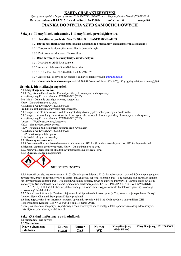 KARTA CHARAKTERYSTYKI Sporządzona zgodnie z Rozporządzeniem WE Nr 1907/2006 (REACH) oraz z Rozporządzeniem Komisji (UE) 453/2010 Data sporządzenia:10.03.2012 Data aktualizacji: 16.06.2014 Ilość stron: 1/6 wersja:3.0 PIANKA DO MYCIA SZYB SAMOCHODOWYCH Sekcja 1. Identyfikacja mieszaniny i identyfikacja przedsiębiorstwa. 1.1 Identyfikator produktu: SZYBY GLASS CLEANER MOJE AUTO 1.2 Istotne zidentyfikowane zastosowania substancji lub mieszaniny oraz zastosowania odradzane: 1.2.1 Zastosowania zidentyfikowane: Pianka do mycia szyb 1.2.2 Zastosowania odradzane: Nie określono 1.3 Dane dotyczące dostawcy karty charakterystyki: 1.3.1Dystrybutor: AMTRA Sp. z o. o. 1.3.2 Adres: ul. Schonów 3, 41-200 Sosnowiec 1.3.3 Telefon/Fax: +48 32 2944100 / + 48 32 2944139 1.3.4 Adres email osoby odpowiedzialnej za kartę charakterystyki: [email protected] 1.4 Numer telefonu alarmowego: +48 32 294 41 00 (w godzinach 800- 1600), 112 ( ogólny telefon alarmowy),998 Sekcja 2. Identyfikacja zagrożeń. 2.1 Klasyfikacja mieszaniny: 2.1.1. Zagrożenia dla człowieka: Produkt jest klasyfikowany jako niebezpieczny. Klasyfikacja wg Rozporządzenia 1272/2008/WE (CLP) Eye Irrit.2 – Działanie drażniące na oczy, kategoria 2 H319 – Działa drażniąco na oczy Klasyfikacja wg Dyrektywy 1272/2008/WE Produkt nie jest klasyfikowany jako niebezpieczny. 2.1.2 Zagrożenie dla środowiska: Produkt nie jest klasyfikowany jako niebezpieczny dla środowiska 2.1.3 Zagrożenia wynikające z właściwości fizycznych i chemicznych: Produkt jest klasyfikowany jako niebezpieczny. Klasyfikacja wg Rozporządzenia 1272/2008/WE (CLP) Aerosol1 – Wyrób aerozolowy, kategoria 1 H222 – Skrajnie łatwopalny aerozol H229 – Pojemnik pod ciśnieniem: ogrzanie grozi wybuchem Klasyfikacja wg Dyrektywy 1272/2008/WE F+- Produkt skrajnie łatwopalny R12- Produkt skrajnie łatwopalny 2.2. Elementy oznakowania: 2.2.1 Oznaczenie literowe i określenie niebezpieczeństwa: H222 – Skrajnie łatwopalny aerozol, H229 – Pojemnik pod ciśnieniem: ogrzanie grozi wybuchem, H319 – Działa drażniąco na oczy 2.2.2 Nazwy niebezpiecznych składników umieszczone na etykiecie: Brak 2.2.3 Określenie rodzaju zagrożenia: NIEBEZPIECZEŃSTWO 2.2.4 Warunki bezpiecznego stosowania: P102-Chronić przez dziećmi. P210- Przechowywać z dala od źródeł ciepła, gorących powierzchni, źródeł iskrzenia, otwartego ognia i innych źródeł zapłonu. Nie palić. P211- Nie rozpylać nad otwartym ogniem lub innym źródłem zapłonu. P251- Nie przekłuwać ani nie spalać, nawet po zużyciu. P410+P412- Chronić przed światłem słonecznym. Nie wystawiać na działanie temperatury przekraczającej 50C/ 122F. P305+P351+P338- W PRZYPADKU DOSTANIA SIĘ DO OCZU: Ostrożnie płukać wodą przez kilka minut. Wyjąć soczewki kontaktowe, jeżeli są i można je łatwo usunąć. Nadal płukać. 2.2.5 Dodatkowe informacje: Zawiera: niejonowe środki powierzchniowo czynne (< 5%), kompozycja zapachowa: Benzyl Alcohol, Hexyl Cinnamal, Butylphenyl Methylpropional 2.3 Inne zagrożenia: Brak informacji na temat spełniania kryteriów PBT lub vPvB zgodnie z załącznikiem XIII Rozporządzenia Komisji (UE) Nr 253/2011 z dnia 15 marca 2011r. Z uwagi na obecność kompozycji zapachowej u osób wrażliwych może wystąpić lekkie podrażnienie dróg oddechowych. Duże stężenie par może wywołać kaszel. Sekcja3.Skład i informacje o składnikach 3.1 Substancje: Nie dotyczy 3.2 Mieszaniny: Nazwa chemiczna składnika Zakres stężeń Numer CAS Numer WE Klasyfikacja wg 67/548/EWG Klasyfikacja wg 1272/2008/WE KARTA CHARAKTERYSTYKI Sporządzona zgodnie z Rozporządzeniem WE Nr 1907/2006 (REACH) oraz z Rozporządzeniem Komisji (UE) 453/2010 Data sporządzenia:10.03.2012 Data aktualizacji: 16.06.2014 Ilość stron: 2/6 wersja:3.0 PIANKA DO MYCIA SZYB SAMOCHODOWYCH Alkohol etylowy Nr rejestracji: 012119457610-43-xxxx Gaz ziemny Nr rejestracji: nie podlega rejestracji 2-metylopropan-2-ol Nr rejestracji: podlega przepisom okresu przejściowego 10%-15% 64-17-5 200-578-6 F, R11 Flam. Liq.2, H225 Eye Irrit.2, H319 10%-15% 68476-86-8 270-705-8 F+, R12 Noty H, K, S <1% 75-65-0 200-889-7 F, R11 Xn, R20 Xi, R36/37 Flam. Gas. 1, H220 Press. Gas, H280 Noty H, K, S, U Flam. Liq.2, H225 Acute Tox.4, H332 Eye Irrit.2, H319 STOT SE 3, H335 SEKCJA 4. ŚRODKI PIERWSZEJ POMOCY 4.1 Opis środków pierwszej pomocy: 4.1.1 Połknięcie: Jeżeli nastąpi połknięcie, nie powodować wymiotów. Jeżeli poszkodowany jest przytomny podać do wypicia dużą ilość wody. Zapewnić natychmiast pomoc lekarza. 4.1.2. Zatrucie inhalacyjne: Wynieść poszkodowanego z miejsca narażenia, ułożyć w wygodnej pozycji półleżącej lub siedzącej, zapewnić spokój, chronić przed utratą ciepła. Jeżeli wystąpią zaburzenia oddychania, zastosować sztuczne oddychanie. Jeżeli objawy nie ustępują, wezwać lekarza. 4.1.3. Skażenie skóry: Zmyć dużą ilością wody z mydłem. W przypadku wystąpienia podrażnienia skontaktować się z lekarzem. 4.1.4.Skażenie oczu: Jeżeli poszkodowany nosi szkła kontaktowe niezwłocznie je wyjąć. Dokładnie przemyć oczy dużą ilością wody, wywijając powieki. Zapewnić pomoc okulisty. Uwaga: osoby narażone na skażenie oczu powinny być pouczone o konieczności i sposobie natychmiastowego płukania oczu 4.2 Najważniejsze ostre i opóźnione objawy oraz skutki narażenia: W kontakcie z oczami może nastąpić łzawienie, zaczerwienienie, pieczenie. W kontakcie ze skórą przejściowe podrażnienie, wysuszenie, w długotrwałym kontakcie pękanie skóry. Po inhalacji par: nudności zawroty głowy, uczucie senności. Połknięcie preparatu może wywoływać mdłości lub biegunkę. 4.3 Wskazania dotyczące wszelkiej natychmiastowej pomocy lekarskiej i szczególnego postępowania z poszkodowanym: Podjąć leczenie objawowe. W przypadku wystąpienia niepokojących objawów wezwać lekarza. SEKCJA 5. POSTĘPOWANIE W PRZYPADKU POŻARU 5.1 Środki gaśnicze: 5.1.1 Odpowied