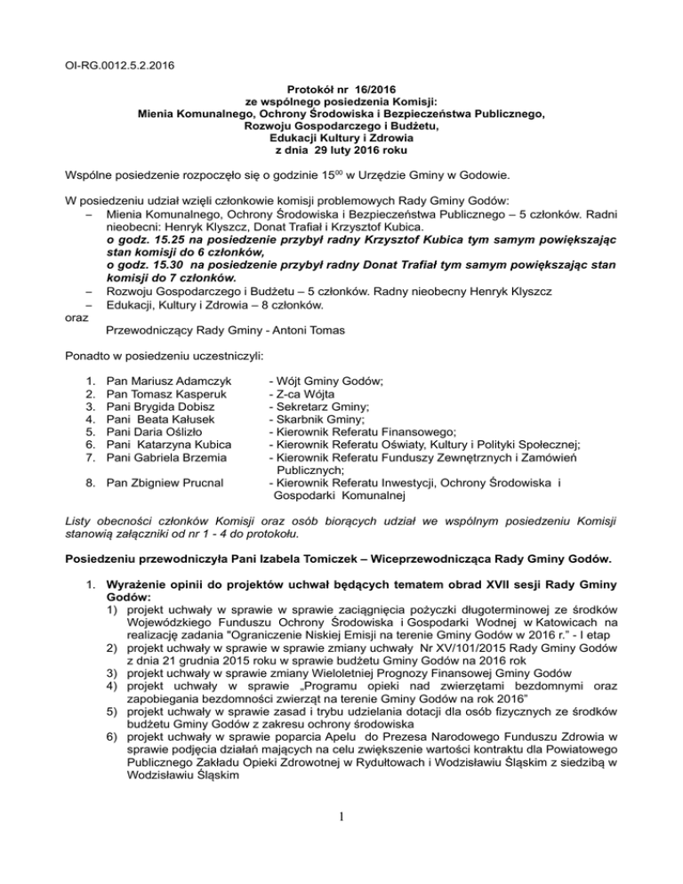 OI-RG.0012.5.2.2016 Protokół nr 16/2016 ze wspólnego posiedzenia Komisji: Mienia Komunalnego, Ochrony Środowiska i Bezpieczeństwa Publicznego, Rozwoju Gospodarczego i Budżetu, Edukacji Kultury i Zdrowia z dnia 29 luty 2016 roku Wspólne posiedzenie rozpoczęło się o godzinie 1500 w Urzędzie Gminy w Godowie. W posiedzeniu udział wzięli członkowie komisji problemowych Rady Gminy Godów: – Mienia Komunalnego, Ochrony Środowiska i Bezpieczeństwa Publicznego – 5 członków. Radni nieobecni: Henryk Klyszcz, Donat Trafiał i Krzysztof Kubica. o godz. 15.25 na posiedzenie przybył radny Krzysztof Kubica tym samym powiększając stan komisji do 6 członków, o godz. 15.30 na posiedzenie przybył radny Donat Trafiał tym samym powiększając stan komisji do 7 członków. – Rozwoju Gospodarczego i Budżetu – 5 członków. Radny nieobecny Henryk Klyszcz – Edukacji, Kultury i Zdrowia – 8 członków. oraz Przewodniczący Rady Gminy - Antoni Tomas Ponadto w posiedzeniu uczestniczyli: 1. 2. 3. 4. 5. 6. 7. Pan Mariusz Adamczyk Pan Tomasz Kasperuk Pani Brygida Dobisz Pani Beata Kałusek Pani Daria Oślizło Pani Katarzyna Kubica Pani Gabriela Brzemia 8. Pan Zbigniew Prucnal - Wójt Gminy Godów; - Z-ca Wójta - Sekretarz Gminy; - Skarbnik Gminy; - Kierownik Referatu Finansowego; - Kierownik Referatu Oświaty, Kultury i Polityki Społecznej; - Kierownik Referatu Funduszy Zewnętrznych i Zamówień Publicznych; - Kierownik Referatu Inwestycji, Ochrony Środowiska i Gospodarki Komunalnej Listy obecności członków Komisji oraz osób biorących udział we wspólnym posiedzeniu Komisji stanowią załączniki od nr 1 - 4 do protokołu. Posiedzeniu przewodniczyła Pani Izabela Tomiczek – Wiceprzewodnicząca Rady Gminy Godów. 1. Wyrażenie opinii do projektów uchwał będących tematem obrad XVII sesji Rady Gminy Godów: 1) projekt uchwały w sprawie w sprawie zaciągnięcia pożyczki długoterminowej ze środków Wojewódzkiego Funduszu Ochrony Środowiska i Gospodarki Wodnej w Katowicach na realizację zadania "Ograniczenie Niskiej Emisji na terenie Gminy Godów w 2016 r.” - I etap 2) projekt uchwały w sprawie w sprawie zmiany uchwały Nr XV/101/2015 Rady Gminy Godów z dnia 21 grudnia 2015 roku w sprawie budżetu Gminy Godów na 2016 rok 3) projekt uchwały w sprawie zmiany Wieloletniej Prognozy Finansowej Gminy Godów 4) projekt uchwały w sprawie „Programu opieki nad zwierzętami bezdomnymi oraz zapobiegania bezdomności zwierząt na terenie Gminy Godów na rok 2016” 5) projekt uchwały w sprawie zasad i trybu udzielania dotacji dla osób fizycznych ze środków budżetu Gminy Godów z zakresu ochrony środowiska 6) projekt uchwały w sprawie poparcia Apelu do Prezesa Narodowego Funduszu Zdrowia w sprawie podjęcia działań mających na celu zwiększenie wartości kontraktu dla Powiatowego Publicznego Zakładu Opieki Zdrowotnej w Rydułtowach i Wodzisławiu Śląskim z siedzibą w Wodzisławiu Śląskim 1 2. Temat z planu pracy Komisji Rozwoju Gospodarczego i Budżetu: 1) Finansowanie remontu ul. Wyzwolenia i ul. 1 Maja w Skrzyszowie. 3. Temat z planu pracy Komisji Mienia Komunalnego (...) 1) Informacja na temat wykorzystania środków finansowych z Wojewódzkiego Funduszu Ochrony Środowiska i Gospodarki Wodnej w Katowicach. 4. Sprawy bieżące. W związku z nieobecnością Przewodniczącego i Wiceprzewodniczącego Komisji Mienia Komunalnego, Ochrony Środowiska i Bezpieczeństwa Publicznego, głosowanie w komisji przeprowadził Przewodniczący Rady Gminy Antoni Tomas. Ad.1 1) projekt uchwały w sprawie w sprawie zaciągnięcia pożyczki długoterminowej ze środków Wojewódzkiego Funduszu Ochrony Środowiska i Gospodarki Wodnej w Katowicach na realizację zadania "Ograniczenie Niskiej Emisji na terenie Gminy Godów w 2016 r.” - I etap Druk projektu nr 120. Pani Skarbnik poinformowała, że na dofinansowanie zadania pn. "Ograniczenie niskiej emisji na terenie Gminy Godów w 2016r." - I etap, zostanie złożony wniosek do WFOŚiGW w Katowicach. WFOŚiGW na sfinansowanie zadania w zakresie ograniczenia emisji udziela pożyczek o preferencyjnym oprocentowaniu, które mogą być częściowo umarzane. Oprocentowanie pożyczek wynosi 0,95 stopy redyskonta weksli, lecz nie mniej niż 3% w stosunku rocznym. W roku 2016 stopa redyskonta weksli wynosi 1,75%. Częściowe umorzenie pożyczki może być udzielone do 20% wykorzystanej pożyczki bez warunku przeznaczenia umorzonej kwoty na nowe zadanie ekologiczne lub do 40% wykorzystanej pożyczki pod warunkiem przeznaczenia umorzonej kwoty na nowe zadanie ekologiczne. Pożyczka została zaplanowana w przychodach budżetu gminy w roku 2016 oraz w WPF w roku 2017. Po podjęciu uchwały, zostanie sporządzony wniosek do Regionalnej Izby Obrachunkowej w Katowicach o wydanie opinii o możliwości spłaty pożyczki przez gminę. Komisje nie wniosły uwag do projektu uchwały. Prowadząca wspólne posiedzenie komisji poddała powyższy projekt uchwały pod głosowanie: – – – Komisja Mienia Komunalnego, Ochrony Środowiska i Bezpieczeństwa Publicznego – 5 głosów „za”, Komisja Rozwoju Gospodarczego i Budżetu – 5 głosów „za”, Komisja Edukacji, Kultury i Zdrowia - 7 głosów „za” Komisje p o z y t y w n i e zaopiniowały projekt uchwały. 2) projekt uchwały w sprawie w sprawie zmiany uchwały Nr XV/101/2015 Rady Gminy Godów z dnia 21 grudnia 2015 roku w sprawie budżetu Gminy Godów na 2016 rok - Druk projektu nr 121. Pani Skarbnik - zmiany wprowadzone Zarządzeniem Wójta Gminy: – kwota 1.600,00 zł - dotacja - rządowy program wspierania osób uprawnionych do świadczenia pielęgnacyjnego. 2 Zmiany wprowadzone w projekcie uchwały: DOCHODY: zwiększenie dochodów bieżących o kwotę 79.358,00 zł., z tego: – 75.000,00 zł - zwrot podatku VAT z lat ubiegłych do korekt złożonych w listopadzie 2015 roku, – 1.600,00 zł - opłata eksploatacyjna, – 600,00 zł- zwrot kosztów egzekucyjnych, – 200,00 