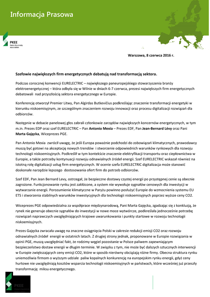 Informacja Prasowa Warszawa, 8 czerwca 2016 r. Szefowie największych firm energetycznych debatują nad transformacją sektora. Podczas corocznej konwencji EURELECTRIC – największego paneuropejskiego stowarzyszenia branży elektroenergetycznej – która odbyła się w Wilnie w dniach 6-7 czerwca, prezesi największych firm energetycznych debatowali nad przyszłością sektora energetycznego w Europie. Konferencję otworzył Premier Litwy, Pan Algirdas Butkevičius podkreślając znaczenie transformacji energetyki w kierunku niskoemisyjnym, ze szczególnym znaczeniem rozwoju innowacji oraz procesu digitalizacji rozwiązań dla odbiorców. Następnie w debacie panelowej głos zabrali członkowie zarządów największych koncernów energetycznych, w tym m.in. Prezes EDP oraz szef EURELECTRIC – Pan Antonio Mexia – Prezes EDF, Pan Jean-Bernard Lévy oraz Pani Marta Gajęcka, Wiceprezes PGE. Pan Antonio Mexia zwrócił uwagę, że jeśli Europa poważnie podchodzi do zobowiązań klimatycznych, prawodawcy muszą być gotowi na akceptację nowych trendów i stworzenie odpowiednich warunków rynkowych dla rozwoju technologii niskoemisyjnych. Podkreślił w tym kontekście znaczenie elektryfikacji transportu oraz ciepłownictwa w Europie, a także potrzeby kontynuacji rozwoju odnawialnych źródeł energii. Szef EURELECTRIC wskazał również na istotną rolę digitalizacji usług firm energetycznych. W ocenie szefa EURELECTRIC digitalizacja może stanowić doskonałe narzędzie lepszego dostosowania ofert firm do potrzeb odbiorców. Szef EDF, Pan Jean Bernard Levy, ostrzegał, że bezpieczne dostawy czystej energii po przystępnej cenie są obecnie zagrożone. Funkcjonowanie rynku jest zakłócone, a system nie wywołuje sygnałów cenowych dla inwestycji w wytwarzanie energii. Porozumienie klimatyczne w Paryżu powinno posłużyć Europie do wzmocnienia systemu EU ETS i stworzenia stabilnych warunków inwestycyjnych dla technologii niskoemisyjnych poprzez wyższe ceny CO2. Wiceprezes PGE odpowiedzialna za współprace międzynarodową, Pani Marta Gajęcka, zgadzając się z konkluzją, że rynek nie generuje obecnie sygnałów do inwestycji w nowe moce wytwórcze, podkreślała jednocześnie potrzebę rozwiązań naprawczych uwzględniających krajowe uwarunkowania i punkty startowe w rozwoju technologii niskoemisyjnych. Prezes Gajęcka zwracała uwagę na znaczne osiągnięcia Polski w zakresie redukcji emisji CO2 oraz rozwoju odnawialnych źródeł energii w ostatnich latach. Z drugiej strony jednak, proponowane w Europie rozwiązania w opinii PGE, muszą uwzględniać fakt, że rodzimy węgiel pozostanie w Polsce paliwem zapewniającym bezpieczeństwo dostaw energii w długim terminie. W związku z tym, nie może być dalszych sztucznych interwencji w Europie zwiększających ceny emisji CO2, które w sposób nierówny obciążają różne firmy. Obecna struktura rynku uniemożliwia firmom o wyższym udziale paliw kopalnych konkurencję na europejskim rynku energii, gdyż ceny hurtowe nie uwzględniają kosztów wsparcia technologii niskoemisyjnych w państwach, które wcześniej już przeszły transformację miksu energetycznego.