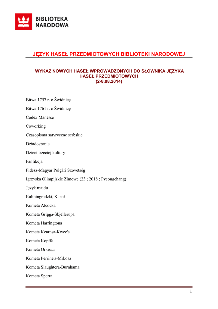 JĘZYK HASEŁ PRZEDMIOTOWYCH BIBLIOTEKI NARODOWEJ WYKAZ NOWYCH HASEŁ WPROWADZONYCH DO SŁOWNIKA JĘZYKA HASEŁ PRZEDMIOTOWYCH (2-8.08.2014) Bitwa 1757 r. o Świdnicę Bitwa 1761 r. o Świdnicę Codex Manesse Coworking Czasopisma satyryczne serbskie Dziadoszanie Dzieci trzeciej kultury Fanfikcja Fidesz-Magyar Polgári Szövetség Igrzyska Olimpijskie Zimowe (23 ; 2018 ; Pyeongchang) Język maidu Kaliningradzki, Kanał Kometa Alcocka Kometa Grigga-Skjellerupa Kometa Harringtona Kometa Kearnsa-Kwee'a Kometa Kopffa Kometa Orkisza Kometa Perrine'a-Mrkosa Kometa Slaughtera-Burnhama Kometa Sperra 1 Kometa Tsuchinshan 1 Kometa Tsuchinshan 2 Kometa Wilka-Peltiera Kometa Wolfa Magyar Megújulás Pártja Matka Boska z Rajskiego (obraz) Mowy argentyńskie Muzycy nigeryjscy Nadzabezpieczenie Nigeryjczycy za granicą Operacja 1944 r. Sturmwind I Operacja 1944 r. Sturmwind II Piosenkarze meksykańscy Powieść historyczna węgierska Psycholodzy szkolni Quartet (film) Serial filmowy argentyński Skróty greckie Słowniki maidu Słowniki niemiecko-albańskie Stany Zjednoczone część południowa Tablice autorskie Cuttera Ustasze Vseukraïns'ke ob''ednannâ "Svoboda" Wizerunek miasta 2