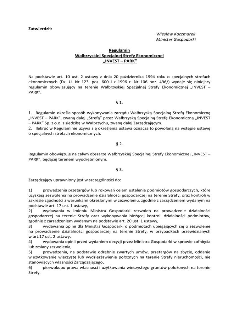 Zatwierdził: Wiesław Kaczmarek Minister Gospodarki Regulamin Wałbrzyskiej Specjalnej Strefy Ekonomicznej „INVEST – PARK” Na podstawie art. 10 ust. 2 ustawy z dnia 20 października 1994 roku o specjalnych strefach ekonomicznych (Dz. U. Nr 123, poz. 600 i z 1996 r. Nr 106 poz. 496/) wydaje się niniejszy regulamin obowiązujący na terenie Wałbrzyskiej Specjalnej Strefy Ekonomicznej „INVEST – PARK”. § 1. 1. Regulamin określa sposób wykonywania zarządu Wałbrzyską Specjalną Strefą Ekonomiczną „INVEST – PARK”, zwaną dalej „Strefą” przez Wałbrzyską Specjalną Strefę Ekonomiczną „INVEST – PARK” Sp. z o.o. z siedzibą w Wałbrzychu, zwaną dalej Zarządzającym. 2. Ilekroć w Regulaminie używa się określenia ustawa oznacza to powołaną na wstępie ustawę o specjalnych strefach ekonomicznych. § 2. Regulamin obowiązuje na całym obszarze Wałbrzyskiej Specjalnej Strefy Ekonomicznej „INVEST – PARK”, będącej terenem wyodrębnionym. § 3. Zarządzający uprawniony jest w szczególności do: 1) prowadzenia przetargów lub rokowań celem ustalenia podmiotów gospodarczych, które uzyskają zezwolenia na prowadzenie działalności gospodarczej na terenie Strefy, oraz kontroli w zakresie zgodności z warunkami określonymi w zezwoleniu, zgodnie z zarządzeniem wydanym na podstawie art. 17 ust. 1 ustawy, 2) wydawania w imieniu Ministra Gospodarki zezwoleń na prowadzenie działalności gospodarczej na terenie Strefy oraz wykonywania bieżącej kontroli działalności podmiotów, zgodnie z zarządzeniem wydanym na podstawie art. 20 ust. 1 ustawy, 3) wydawania opinii dla Ministra Gospodarki o podmiotach ubiegających się o zezwolenie na prowadzenie działalności gospodarczej na terenie Strefy, w przypadkach przewidzianych w art.17 ust. 2 ustawy, 4) wydawania opinii przed wydaniem decyzji przez Ministra Gospodarki w sprawie cofnięcia lub zmiany zezwolenia, 5) prowadzenia, na podstawie odrębnie zwartych umów, przetargów na zbycie, oddanie w użytkowanie wieczyste lub wydzierżawienie położnych na terenie Strefy nieruchomości, nie stanowiących własności Zarządzającego, 6) pierwokupu prawa własności i użytkowania wieczystego gruntów położonych na terenie Strefy. § 4. Zarządzający utrzymuje we właściwym stanie drogi, place, ciągi piesze i zieleńce, których jest właścicielem. Podmioty prowadzące działalność gospodarczą na terenie Strefy utrzymują we właściwym stanie drogi, place, ciągi piesze i zieleńce, których są właścicielem, użytkownikiem wieczystym lub posiadaczem zależnym. § 5. Podmioty gospodarcze działające w Strefie uzyskują dostęp do mediów energetycznych takich jak energia elektryczna, gaz ziemny, woda, energia cieplna, urządzenia do odbioru: ścieków, odpadów przemysłowych i komunalnych lub innych elementów istniejącej infrastruktury po podpisaniu stosownych umów z ich dostawcami. § 6. Wykonanie przyłączy do istniejącej infrastruktury odbywa się na koszt zainteresowanego podmiotu gospodarczego. § 7. Odbiór odpadów komunalnych i przemysłowych, jak też odprowadzenie ścieków odbywa się na warunkach umowy zawartej z wykonawcą usług. Umowy na odprowadzenie ścieków przemysłowych mogą być uwarunkowane koniecznością budowy odpowiedniej oczyszczalni (neutralizatora) tych ścieków lub innych urządzeń wynikających z pozwoleń wodno-prawnych. § 8. Umowy na świadczenie usług telekomunikacyjnych podmioty gospodarcze zawierają we własnym imieniu z firmami telekomunikacyjnymi. § 9. Zarządzający, po uzyskaniu zgody na prowadzenie działalności określonej art.15 ust.1 i 2 ustawy ustala warunki zabudowy oraz wydaje decyzje administracyjne w pierwszej instancji w sprawach z zakresu prawa budowlanego i zagospodarowania przestrzennego to jest: decyzje o pozwoleniu na budowę, przenoszenie pozwolenia na budowę na inną osobę, orzekanie o utracie ważności pozwolenia na budowę, przyjmowanie zawiadomień na użytkowanie obiektu budowlanego, udzielanie pozwolenia na zmianę sposobu użytkowania obiektu budowlanego lub jego części, nakazywanie przeprowadzenia kontroli obiektu budowlanego i żądanie przedstawienia ekspertyzy stanu technicznego obiektu budowlanego. § 10. W celu sprawnego prowadzenia na terenie Strefy prac budowlanych Zarządzający: 1) koordynuje proces wydawania technicznych warunków zasilania, 2) kontroluje cykl uzgadniania dokumentacji technicznej, 3) gromadzi informacje geodezyjne o usytuowaniu budynków i budowli oraz elementów uzbrojenia technicznego naziemnego, co łącznie z bieżącą ewidencją stanu własności gruntów składa się na rozwinięty system informacji o terenie Strefy, 4) wytycza kierunki rozwoju gospodarki elektroenergetycznej i pozostałej infrastruktury technicznej. § 11. Zarządzający w decyzji ustalającej warunki zabudowy i zagospodarowania terenów położonych w Strefie, określa specyficzne dla Strefy wymagania z zakresu ochrony środowiska. § 12. Zarządzający opiniuje wnioski podmiotu gospodarczego do organu administracji państwowej w sprawie wydania decyzji o dopuszczalnej emisji zanieczyszczeń do atmosfery. § 13. Podmiot gospodarczy działający w Strefie uzyskujący od organu administracji państwowej decyzję o dopuszczalnej emisji zanieczyszczeń do atmosfery jest zobowiązany do przedstawienia tej decyzji Zarządzającemu. § 14. Adresat zezwolenia wodno-prawnego wydawanego dla całego obszaru Strefy przez właściwy organ administracji terenowej posiada, na mocy tego zezwolenia prawo do kontroli odprowadzanych przez podmioty gospodarcze ścieków. Formy i częstotliwość kontroli wykonywanych na koszt odprowadzającego ścieki są określone w umowach zawartych pomiędzy podmiotem gospodarczym a odbiorcą ścieków. § 15. Podmiot gospodarczy kończący działalność gospodarczą na terenie Strefy zobowiązany jest do likwidacji szkód powstałych w wyniku działalności i do rekultywacji terenu. 