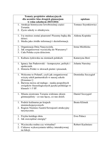 Tematy projektów edukacyjnych dla uczniów klas drugich gimnazjum w roku szkolnym 2015/2016 1. Atrakcje historyczne lewobrzeżnej części Torunia. 2. Życie szkoły w obiektywie. opiekun Tomasz Szymkiewicz 1. I ty możesz zostać pisarzem! Piszemy bajkę dla dzieci. 2. Media jako źródło informacji i dezinformacji. Aldona Kopinke 1. Organizacja Dnia Nauczyciela. 2. Jak zorganizować wycieczkę do Warszawy? 3. Cała Polska czyta dzieciom. Irena Michlicka 1. Kultura żydowska na ziemiach polskich Katarzyna Berć 1. Ignacy Jan Paderewski – kompozytor, polityk i społecznik. 2. Historia Polski w słowach pieśni i piosenek. Jolanta Narożny 1. Welcome to Poland!, czyli jak zorganizować wizytę szkół partnerskich w naszej szkole [Erasmus+] 2. Barwna mowa od małego - nauka pospolitych związków frazeologicznych języka polskiego w klasach 1-3 SP. Dominika Szczygieł 1. Miasta siostrzane Torunia widziane okiem gimnazjalisty - co nas łączy, co nas dzieli. Daniel Szczygieł 1. Podróż kulinarna po krajach niemieckojęzycznych. 2. Region Niemiec/Austrii/Szwajcarii atrakcyjny turystycznie. Beata Klimek 1. Fizyka każdego dnia. 2. Jak oszczędzać energię? Ewa Palacz 1. Wycieczka realna czy wirtualna? 2. Ciekawe wykorzystanie tablicy interaktywnej na lekcji. Robert Kachniarz 1. Przyprawy w życiu człowieka. 2. Przyroda mojej okolicy w obiektywie. Marzenna Sobczak 1. Czy Polska jest krajem atrakcyjnym turystycznie? 2. Przewodnik po stolicach Unii Europejskiej. Wiktor Chlebowski 1. Aktywność ruchowa – przymus czy konieczność? 2. Co można zrobić, aby przywrócić modę na uprawianie sportu? Joanna Maciejewska 1. Jak się bawić bez używek? 2. W jaki sposób zachęcić nowych uczniów do czynnego uprawiania sportu? Izabela JaszczakWochna 1. Twierdza Toruń dawniej i dziś. 2. Budownictwo pasywne i energooszczędne. Marcin Kowalski 1. Wpływ chrześcijaństwa na rozwój Polski. 2. Korzyści przyjęcia sakramentu chrztu przez księcia Mieszka I. 3. 1050 rocznica chrztu Polski. Teresa Węglikowska -Chachuła Uczniowie mogą zaproponować własny temat projektu, który przedstawiają do akceptacji wybranemu nauczycielowi. Aldona Kopinke koordynator szkolnych projektów edukacyjnych