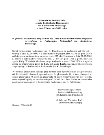 Uchwała Nr 000-6/4/2006 senatu Politechniki Radomskiej im. Kazimierza Pułaskiego z dnia 29 czerwca 2006 roku w sprawie: mianowania prof. dr hab. inż. Jana Łacha na stanowisko profesora zwyczajnego w Politechnice Radomskiej im. Kazimierza Pułaskiego. Senat Politechniki Radomskiej im. K. Pułaskiego na podstawie art. 86 ust. 1 ustawy z dnia 12.09.1990 r. o szkolnictwie wyższym (Dz. U. Nr 65 poz. 385 z późniejszymi zmianami) w związku z art. 277 pkt. 2) ustawy z dnia 27.07.2005 r. prawo o szkolnictwie wyższym /Dz. U. Nr 164 poz. 1365 z późn. zm./, za zgodą Rady Wydziału Mechanicznego (uchwała z dnia 22.06.2006 r.) wyraża zgodę na mianowanie prof. dr hab. inż. Jana Łacha na stanowisko profesora zwyczajnego w Politechnice Radomskiej im. K. Pułaskiego. W wyniku głosowania tajnego przy liczbie osób uprawnionych do głosowania 60, liczbie osób obecnych uprawnionych do głosowania 46, w tym obecnych w czasie głosowania 46 osób, za głosowało 45 osób, wstrzymujących się 1 osoba, senat wyraził zgodę na mianowanie prof. dr hab. inż. Jana Łacha na stanowisko profesora zwyczajnego w Politechnice Radomskiej im. K. Pułaskiego. Przewodniczący senatu Politechniki Radomskiej im. Kazimierza Pułaskiego dr hab. inż. Mirosław Luft profesor nadzwyczajny Radom, 2006-06-30