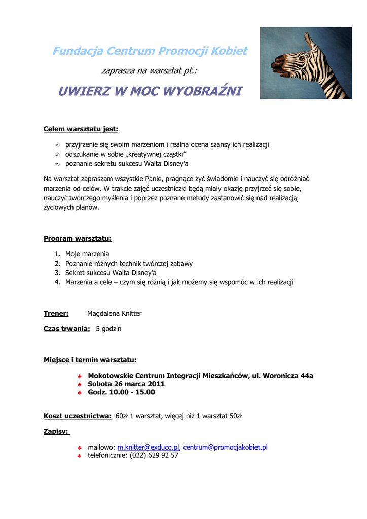 Fundacja Centrum Promocji Kobiet zaprasza na warsztat pt.: UWIERZ W MOC WYOBRAŹNI Celem warsztatu jest: • • • przyjrzenie się swoim marzeniom i realna ocena szansy ich realizacji odszukanie w sobie „kreatywnej cząstki” poznanie sekretu sukcesu Walta Disney’a Na warsztat zapraszam wszystkie Panie, pragnące żyć świadomie i nauczyć się odróżniać marzenia od celów. W trakcie zajęć uczestniczki będą miały okazję przyjrzeć się sobie, nauczyć twórczego myślenia i poprzez poznane metody zastanowić się nad realizacją życiowych planów. Program warsztatu: 1. 2. 3. 4. Moje marzenia Poznanie różnych technik twórczej zabawy Sekret sukcesu Walta Disney’a Marzenia a cele – czym się różnią i jak możemy się wspomóc w ich realizacji Trener: Magdalena Knitter Czas trwania: 5 godzin Miejsce i termin warsztatu: ♣ Mokotowskie Centrum Integracji Mieszkańców, ul. Woronicza 44a ♣ Sobota 26 marca 2011 ♣ Godz. 10.00 - 15.00 Koszt uczestnictwa: 60zł 1 warsztat, więcej niż 1 warsztat 50zł Zapisy: ♣ mailowo: [email protected], [email protected] ♣ telefonicznie: (022) 629 92 57