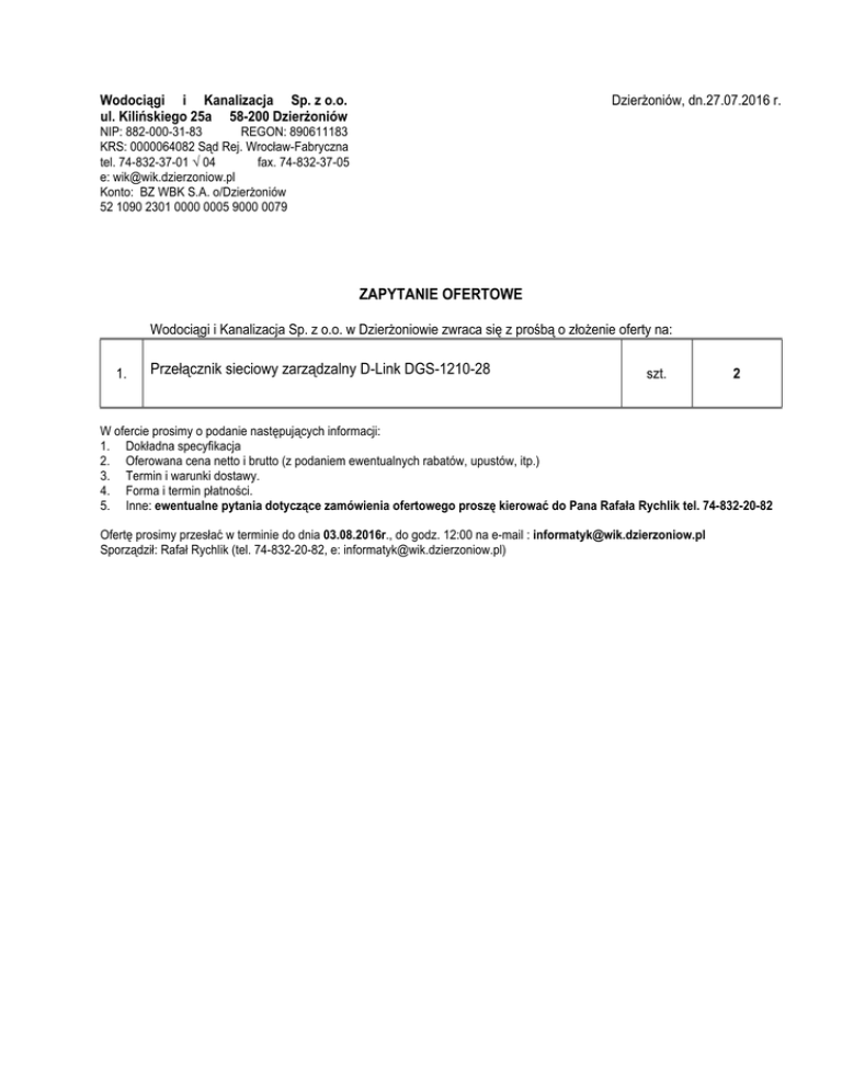 Dzierżoniów, dn.27.07.2016 r. Wodociągi i Kanalizacja Sp. z o.o. ul. Kilińskiego 25a 58-200 Dzierżoniów NIP: 882-000-31-83 REGON: 890611183 KRS: 0000064082 Sąd Rej. Wrocław-Fabryczna tel. 74-832-37-01 ÷ 04 fax. 74-832-37-05 e: [email protected] Konto: BZ WBK S.A. o/Dzierżoniów 52 1090 2301 0000 0005 9000 0079 ZAPYTANIE OFERTOWE Wodociągi i Kanalizacja Sp. z o.o. w Dzierżoniowie zwraca się z prośbą o złożenie oferty na: 1. Przełącznik sieciowy zarządzalny D-Link DGS-1210-28 szt. 2 W ofercie prosimy o podanie następujących informacji: 1. Dokładna specyfikacja 2. Oferowana cena netto i brutto (z podaniem ewentualnych rabatów, upustów, itp.) 3. Termin i warunki dostawy. 4. Forma i termin płatności. 5. Inne: ewentualne pytania dotyczące zamówienia ofertowego proszę kierować do Pana Rafała Rychlik tel. 74-832-20-82 Ofertę prosimy przesłać w terminie do dnia 03.08.2016r., do godz. 12:00 na e-mail : [email protected] Sporządził: Rafał Rychlik (tel. 74-832-20-82, e: [email protected])