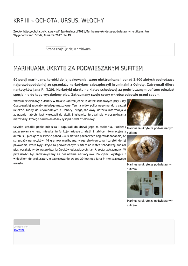 KRP III – OCHOTA, URSUS, WŁOCHY Źródło: http://ochota.policja.waw.pl/r3/aktualnosci/4091,Marihuana-ukryte-za-podwieszanym-sufitem.html Wygenerowano: Środa, 8 marca 2017, 14:49 Strona znajduje się w archiwum. MARIHUANA UKRYTE ZA PODWIESZANYM SUFITEM 90 porcji marihuany, torebki do jej pakowania, wagę elektroniczną i ponad 2.400 złotych pochodzące najprawdopodobniej ze sprzedaży narkotyków zabezpieczyli kryminalni z Ochoty. Zatrzymali dilera narkotyków Jana P. (l.20). Narkotyki ukryte na klatce schodowej za podwieszanym sufitem odnalazł specjalnie do tego wyszkolony pies. Zatrzymany swoje czyny wkrótce odpowie przed sądem. Wczoraj dzielnicowy z Ochoty w trakcie kontroli jednej z klatek schodowych przy ulicy Opaczewskiej zauważył młodego mężczyznę. Ten na widok policyjnego munduru zaczął uciekać. Kiedy do kryminalnych z Ochoty, drogą radiową, dotarła informacja o zdarzeniu natychmiast wkroczyli do akcji. Błyskawicznie udali się w poszukiwania mężczyzny, którego bardzo dokładny rysopis podał dzielnicowy. Szybko ustalili gdzie mieszka i zapukali do drzwi jego mieszkania. Podczas Marihuana ukryte za podwieszanym przeszukania w jego mieszkaniu funkcjonariusze znaleźli 2 tablice informacyjne z sufitem autobusu, pieniądze w kwocie ponad 2.400 złotych pochodzące najprawdopodobniej ze sprzedaży narkotyków. 46 gramów marihuany, wagę elektroniczną i torebki do jej pakowania, które były ukryte za podwieszanym sufitem na klatce schodowej, znalazł pies wyszkolony do wyszukiwania środków odurzających. Jan P. został zatrzymany. W przeszłości był zatrzymywany za posiadanie narkotyków. Policjanci wystąpili z wnioskiem do prokuratury o zastosowanie wobec 20-letniego Jana P. tymczasowego aresztu. Marihuana ukryte za podwieszanym sufitem Marihuana ukryte za podwieszanym sufitem Ocena: 0/5 (0) Tweetnij