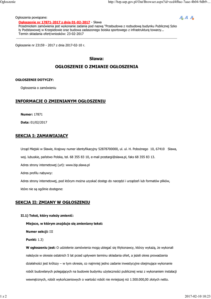 Ogłoszenie 1z2 http://bzp.uzp.gov.pl/Out/Browser.aspx?id=ecd4f0ac-7aae-4b04-9db9-... Ogłoszenia powiązane: Ogłoszenie nr 17871-2017 z dnia 01-02-2017 - Sława Przedmiotem zamówienia jest wykonanie zadania pod nazwą "Przebudowa z rozbudową budynku Publicznej Szko ły Podstawowej w Krzepielowie oraz budowa zadaszonego boiska sportowego z infrastrukturą towarzy... Termin składania ofert/wniosków: 23-02-2017 Ogłoszenie nr 23159 - 2017 z dnia 2017-02-10 r. Sława: OGŁOSZENIE O ZMIANIE OGŁOSZENIA OGŁOSZENIE DOTYCZY: Ogłoszenia o zamówieniu INFORMACJE O ZMIENIANYM OGŁOSZENIU Numer: 17871 Data: 01/02/2017 SEKCJA I: ZAMAWIAJĄCY Urząd Miejski w Sławie, Krajowy numer identyfikacyjny 52878700000, ul. ul. H. Pobożnego 10, 67410 Sława, woj. lubuskie, państwo Polska, tel. 68 355 83 10, e-mail [email protected], faks 68 355 83 13. Adres strony internetowej (url): www.bip.slawa.pl Adres profilu nabywcy: Adres strony internetowej, pod którym można uzyskać dostęp do narzędzi i urządzeń lub formatów plików, które nie są ogólnie dostępne: SEKCJA II: ZMIANY W OGŁOSZENIU II.1) Tekst, który należy zmienić: Miejsce, w którym znajduje się zmieniany tekst: Numer sekcji: III Punkt: 1.3) W ogłoszeniu jest: O udzielenie zamówienia mogą ubiegać się Wykonawcy, którzy wykażą, że wykonali należycie w okresie ostatnich 5 lat przed upływem terminu składania ofert, a jeżeli okres prowadzenia działalności jest krótszy – w tym okresie, co najmniej jedno zadanie inwestycyjne obejmujące wykonanie robót budowlanych polegających na budowie budynku użyteczności publicznej wraz z wykonaniem instalacji wewnętrznych, robót wykończeniowych o wartości robót nie mniejszej niż 1.500.000,00 złotych netto. 2017-02-10 10:23 Ogłoszenie 2z2 http://bzp.uzp.gov.pl/Out/Browser.aspx?id=ecd4f0ac-7aae-4b04-9db9-... W ogłoszeniu powinno być: O udzielenie zamówienia mogą ubiegać się Wykonawcy, którzy wykażą, że wykonali należycie w okresie ostatnich 5 lat przed upływem terminu składania ofert, a jeżeli okres prowadzenia działalności jest krótszy – w tym okresie, co najmniej jedno zadanie inwestycyjne obejmujące wykonanie robót budowlanych polegających na budowie budynku użyteczności publicznej lub budynku mieszkalnego wielorodzinnego wraz z wykonaniem instalacji wewnętrznych, robót wykończeniowych o wartości robót nie mniejszej niż 1.500.000,00 złotych netto. Dalsza część punktu 3a pozostaje be zmian. 2017-02-10 10:23