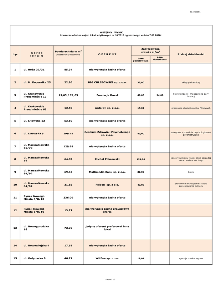 1 ul. Hoża 29/31 85,34 nie wpłynęła żadna oferta 2 ul. M