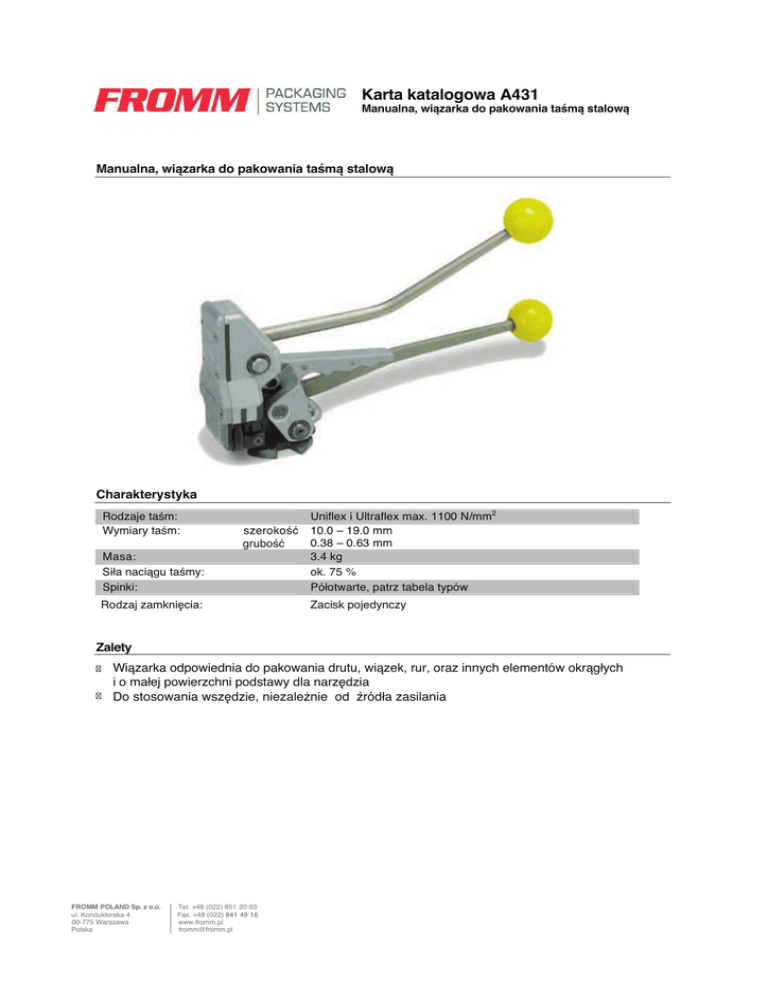 Karta katalogowa A431 Manualna, wiązarka do pakowania taśmą stalową Manualna, wiązarka do pakowania taśmą stalową Charakterystyka Masa: Siła naciągu taśmy: Spinki: Uniflex i Ultraflex max. 1100 N/mm2 10.0 – 19.0 mm 0.38 – 0.63 mm 3.4 kg ok. 75 % Półotwarte, patrz tabela typów Rodzaj zamknięcia: Zacisk pojedynczy Rodzaje taśm: Wymiary taśm: szerokość grubość Zalety Wiązarka odpowiednia do pakowania drutu, wiązek, rur, oraz innych elementów okrągłych i o małej powierzchni podstawy dla narzędzia Do stosowania wszędzie, niezależnie od źródła zasilania FROMM POLAND Sp. z o.o. ul. Konduktorska 4 00-775 Warszawa Polska Tel. +48 (022) 851 20 03 Fax. +48 (022) 841 49 16 www.fromm.pl [email protected] Karta katalogowa A431 Manualna, wiązarka do pakowania taśmą stalową Tabela typów modeli A431 Nr katalog. Uniflex i Ultraflex 2 max. 1100 N/mm Model Szerokość mm Grubość mm 13.3050 A431/10/0.38-0.63/UNI 10 0.38-0.63 13.3070 A431/13/0.38-0.63/UNI 13 0.38-0.63 13.3090 A431/16/0.38-0.63/UNI 16 0.38-0.63 13.3110 A431/19/0.38-0.63/UNI 19 0.38-0.63 13.3051 A431/10/0.38-0.63/ULT 10 0.38-0.63 13.3071 A431/13/0.38-0.63/ULT 13 0.38-0.63 13.3091 A431/16/0.38-0.63/ULT 16 0.38-0.63 13.3111 A431/19/0.38-0.63/ULT 19 0.38-0.63 2 Uniflex (UNI) = Taśma standardowa o wytrzymałości max . 850 N/mm 2 Ultraflex (ULT) = Taśma o podwyższonych parametrach wytrzymałościowych do max. 1100 N/mm Zalecane spinki Szerokość Wymiary (szerokość, długość, grubość) mm mm 10 10 x 22 x 0.6 13 13 x 22 x 0.6 16 16 x 22 x 0.6 19 19 x 22 x 0.6 Wytrzymałość materiału spinki: 600 N/mm² FROMM POLAND Sp. z o.o. ul. Konduktorska 4 00-775 Warszawa Polska Tel. +48 (022) 851 20 03 Fax. +48 (022) 841 49 16 www.fromm.pl [email protected]