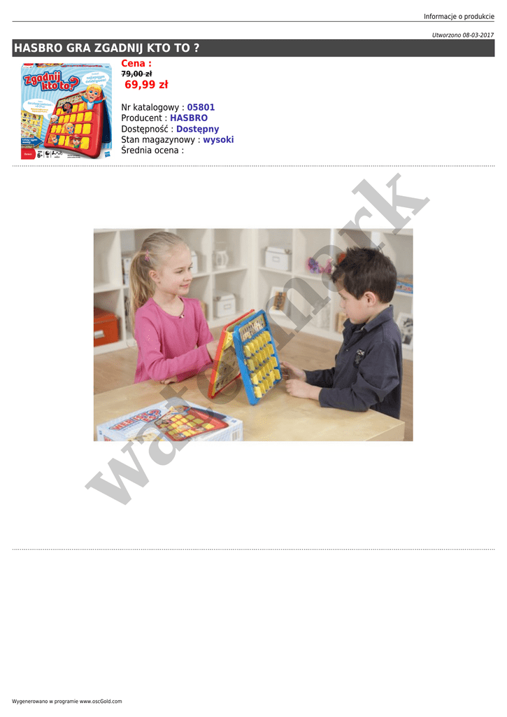 Informacje o produkcie Utworzono 08-03-2017 HASBRO GRA ZGADNIJ KTO TO ? Cena : 79,00 zł 69,99 zł w at er m ar k Nr katalogowy : 05801 Producent : HASBRO Dostępność : Dostępny Stan magazynowy : wysoki Średnia ocena : Wygenerowano w programie www.oscGold.com
