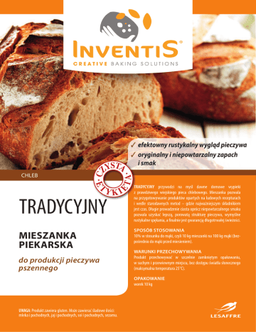 YKI E ·E T TA· CZ CHLEB YSTA efektowny rustykalny wygląd pieczywa oryginalny i niepowtarzalny zapach i smak TRADYCYJNY MIESZANKA PIEKARSKA do produkcji pieczywa pszennego TRADYCYJNY przywodzi na myśl dawne domowe wypieki z prawdziwego wiejskiego pieca chlebowego. Mieszanka pozwala na przygotowywanie produktów opartych na ludowych recepturach i wedle starodawnych metod – gdzie najważniejszym składnikiem jest czas. Długie prowadzenie ciasta oprócz niepowtarzalnego smaku pozwala uzyskać lepszą, porowatą strukturę pieczywa, wymyślne rustykalne spękania, a finalnie jest gwarancją długotrwałej świeżości. SPOSÓB STOSOWANIA 10% w stosunku do mąki, czyli 10 kg mieszanki na 100 kg mąki (bezpośrednio do mąki przed miesieniem). WARUNKI PRZECHOWYWANIA Produkt przechowywać w szczelnie zamkniętym opakowaniu, w suchym i przewiewnym miejscu, bez dostępu światła słonecznego (maksymalna temperatura 25°C). OPAKOWANIE worek 10 kg UWAGA: Produkt zawiera gluten. Może zawierać śladowe ilości: mleka i pochodnych, jaj i pochodnych, soi i pochodnych, sezamu. TRADYCYJNY ZALETY YKI oryginalny smak i aromat pieczywa, dzięki zastosowaniu naturalnego zakwasu pszennego efektowny rustykalny wygląd pieczywa długotrwała świeżość wypiekanych produktów dobra wydajność mieszanki CHLEB RECEPTURY Bagietka tradycyjna Bułka tradycyjna Chleb tradycyjny Mąka pszenna typ 500 900 g 1000 g 700 g Mąka żytnia typ 720 100 g – 300 g Mieszanka Tradycyjny 100 g 100 g 100 g Drożdże 20 g 20 g 20 g Woda 750 g 650 g 800 g RAZEM 1870 g 1770 g 1920 g S P O S Ó B Miesienie Temperatura ciasta 1 fermentacja (na stole) Dzielenie 2 fermentacja Wypiek (piec trzonowy) W Y T W A R Z A N I A 3+5 3+5 3+5 25-27˚C 25-27˚C 25-27˚C 60' 10' 45' 350 g 95 g 500 g 20' formowanie 40' 30' 15' 230˚C / 18' 220˚C / 10' 230˚C / 30' Inventis to kompletna gama produktów do wypieku chleba. Pozwala piekarzom tworzyć zróżnicowane i smaczne przepisy kulinarne ograniczone jedynie ich wyobraźnią. Inventis jest doskonałym narzędziem na drodze do zadowolenia kelinta. Lesaffre Polska S.A. 46-250 Wołczyn, ul. Dworcowa 36, Polska tel. +48 (77) 418 82 80, fax +48 (77) 418 82 99 www.lesaffre.pl TA· T YSTA E ·E do produkcji pieczywa pszennego CZ MIESZANKA PIEKARSKA