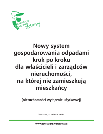 Nowy system gospodarowania odpadami krok po kroku dla właścicieli i zarządców nieruchomości, na której nie zamieszkują mieszkańcy (nieruchomości wyłącznie użytkowej) Warszawa, 11 kwietnia 2013 r. www.czysta.um.warszawa.pl Z dniem 1 lipca 2013 r. podmiotem odpowiedzialnym za odbiór odpadów od mieszkańców i przedsiębiorców staje się m.st. Warszawa. Zmiany dotyczą zarówno mieszkańców domów jednorodzinnych, bloków wielorodzinnych oraz nieruchomości, w których nie zamieszkują mieszkańcy (np. szkoły, restauracje, biurowce, centra handlowe czy dworce). Co w związku z powyższym powinni zrobić właściciele i zarządcy nieruchomości? KROK 1. Wypowiedzieć obecną umowę na odbiór odpadów Uprawnieni zarządcy i właściciele nieruchomości, na których nie zamieszkują mieszkańcy, przedsiębiorcy, zarządcy instytucji, szpitali, centrów handlowych, lokali użytkowych powinni pamiętać, by odpowiednio wcześnie wypowiedzieć obowiązujące dotychczas umowy z firmami odbierającymi śmieci. Ostatnim dniem obowiązywania tych umów powinien być dzień 30 czerwca 2013 r. Począwszy od 1 lipca tego roku, odpady odbierać będą firmy wyłonione w przetargu przez m.st. Warszawa. Aby wypowiedzieć umowę należy: a. Sprawdzić w umowie zapis dotyczący okresu wypowiedzenia umowy. W przypadku gdy okres wypowiedzenia wynosi jeden miesiąc, wypowiedzenie musi dotrzeć do siedziby firmy do 31 maja 2013 r. – ostatniego dnia okresu wypowiedzenia umowy. Do wypowiedzenia umowy uprawnia nas zmiana przepisów prawnych dotyczących odbioru odpadów. Ostatnim rachunkiem za odbiór śmieci, jaki powinniśmy uregulować prywatnemu przedsiębiorcy, będzie rachunek za czerwiec 2013 r. b. Sporządzić pismo zawierające oświadczenie o wypowiedzeniu umowy na odbiór odpadów ze skutkiem na dzień 30 czerwca 2013 r. Następnie, to pismo powinno być własnoręcznie podpisane tylko przez upoważnioną osobę lub osoby. Tak sporządzone wypowiedzenie należy dostarczyć osobiście bądź przesłać listem poleconym do firmy, z którą została zawarta umowa na odbiór odpadów z danej nieruchomości. c. Z adbać o potwierdzenie złożenia wypowiedzenia. Gdy wysyłamy wypowiedzenie listem poleconym dołączmy zwrotne potwierdzenie odbioru, gdy składamy je w siedzibie firmy poprośmy o potwierdzenie odbioru na kopii. Posiadanie osobnej umowy nie zwalnia z obowiązku uiszczania opłaty Miastu, a wcześniejsze umowy nie wygasną automatycznie w wyniku wprowadzenia nowych regulacji prawnych. KROK 2. Wypełnić i złożyć deklarację Deklaracja swoim wyglądem przypomina znany wszystkim PIT. W podobny sposób też ją wypełniamy, a następnie składamy w Urzędzie m.st. Warszawy dla dzielnicy właściwej ze względu na miejsce zamieszkania lub siedziby. W Warszawie możliwe są do zastosowania dwie drogi: elektroniczna e-deklaracja i tradycyjna deklaracja papierowa. Aby wypełnić i złożyć deklarację należy: a. Wybrać właściwy druk deklaracji. Jeśli nieruchomość nie jest przeznaczona dla celów mieszkaniowych – wybieramy druk D-N: Deklaracja o wysokości opłaty za gospodarowanie odpadami komunalnymi dla nieruchomości, na której nie zamieszkują mieszkańcy, a powstają odpady komunalne. Deklaracje są dostępne w Wydziałach Obsługi Mieszkańców każdej dzielnicy, a także w formie elektronicznej na stronie www.czysta.um.warszawa.pl oraz http://bip.warszawa.pl/NR/exeres/2EE51688-1804-4F4D-BA16-0E4CEC49B850,frameless.htm b. Podjąć decyzję o wyborze sposobu zbierania (segregowania) odpadów (selektywnie lub nieselektywnie). Od tej decyzji zależeć będzie wysokość późniejszych opłat. c. Czytelnie wypełnić jasne pola deklaracji. W wypełnianiu pomocny będzie kreator deklaracji, który zamieszczony jest na stronie internetowej: www.czysta.um.warszawa.pl. Wypełnienie w ten sposób deklaracji uprości i skróci czas niezbędny na jej złożenie. Deklaracja opatrzona zostanie kodem kreskowym co ułatwi jej późniejsze rozpoznanie przy okienku w Wydziale Obsługi Mieszkańców Urzędu Dzielnicy. Aby wypełnić deklarację należy przede wszystkim zebrać informacje dotyczące pojemności wykorzystywanych pojemników a także miesięcznej częstotliwości ich opróżniania. Na pierwszej stronie deklaracji podajemy podstawowe informacje, m.in.: urząd dzielnicy, do którego składamy deklarację, określamy czy deklaracja złożona będzie po raz pierwszy, czy też będzie to jej aktualizacja lub korekta, dane indentyfikacyjne składającego deklarację (PESEL, NIP, Regon). W dalszej części zaznaczamy ilu nieruchomości dotyczy deklaracja. Ważne aby podać dane do kontaktu takie jak adres e-mail, dzięki czemu łatwiej będzie wymieniać z urzędem ważne informacje. Na drugiej stronie uzupełniamy adres 2 nieruchomości, określamy sposób zbiórki odpadów (selektywna albo nieselektywna), następnie podajemy dane dotyczące pojemności stosowanych pojemników i wpisujemy wymaganą liczbę opróżnień tych pojemników w miesiącu. Biorąc pod uwagę stawki podane poniżej, obliczamy opłatę. Zgodnie z uchwałą Rady m.st. Warszawy w sprawie wyboru metody ustalenia opłaty za gospodarowanie odpadami komunalnymi, ustalenia stawki takiej opłaty oraz ustalenia stawki opłaty za pojemnik o określonej pojemności, właściciele, zarządcy nieruchomości naliczają opłatę wykorzystując następujące miesięczne stawki opłat za posegregowane odpady komunalne: • 19,00 zł za jednorazowe opróżnienie pojemnika o pojemności 120 litrów • 23,00 zł za jednorazowe opróżnienie pojemnika o pojemności 240 litrów • 46,00 zł za jednorazowe opróżnienie pojemnika o pojemności 660 litrów • 49,00 zł za jednorazowe opróżnienie pojemnika o pojemności 770 litrów • 55,00 zł za jednorazowe opróżnienie pojemnika o pojemności 1100 litrów • 190,00 zł za jednorazowe opróżnienie pojemnika o pojemności 3500 litrów, powiększone o 50,00 zł za ka