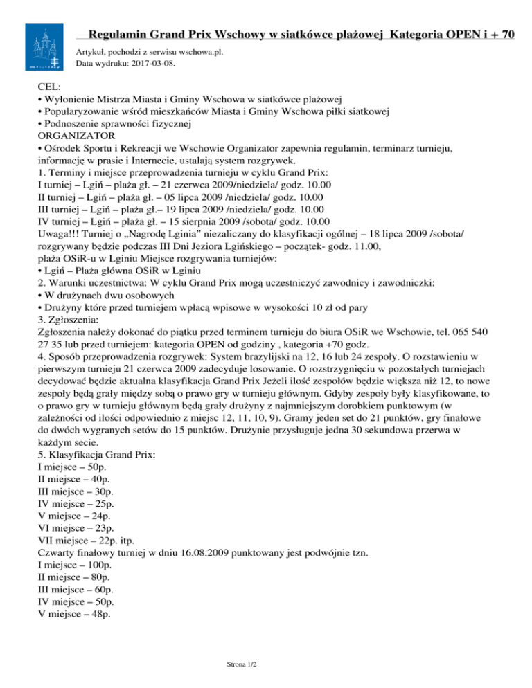 Regulamin Grand Prix Wschowy w siatkówce plażowej Kategoria OPEN i + 70 Artykuł‚ pochodzi z serwisu wschowa.pl. Data wydruku: 2017-03-08. CEL: • Wyłonienie Mistrza Miasta i Gminy Wschowa w siatkówce plażowej • Popularyzowanie wśród mieszkańców Miasta i Gminy Wschowa piłki siatkowej • Podnoszenie sprawności fizycznej ORGANIZATOR • Ośrodek Sportu i Rekreacji we Wschowie Organizator zapewnia regulamin, terminarz turnieju, informację w prasie i Internecie, ustalają system rozgrywek. 1. Terminy i miejsce przeprowadzenia turnieju w cyklu Grand Prix: I turniej – Lgiń – plaża gł. – 21 czerwca 2009/niedziela/ godz. 10.00 II turniej – Lgiń – plaża gł. – 05 lipca 2009 /niedziela/ godz. 10.00 III turniej – Lgiń – plaża gł.– 19 lipca 2009 /niedziela/ godz. 10.00 IV turniej – Lgiń – plaża gł. – 15 sierpnia 2009 /sobota/ godz. 10.00 Uwaga!!! Turniej o „Nagrodę Lginia” niezaliczany do klasyfikacji ogólnej – 18 lipca 2009 /sobota/ rozgrywany będzie podczas III Dni Jeziora Lgińskiego – początek- godz. 11.00, plaża OSiR-u w Lginiu Miejsce rozgrywania turniejów: • Lgiń – Plaża główna OSiR w Lginiu 2. Warunki uczestnictwa: W cyklu Grand Prix mogą uczestniczyć zawodnicy i zawodniczki: • W drużynach dwu osobowych • Drużyny które przed turniejem wpłacą wpisowe w wysokości 10 zł od pary 3. Zgłoszenia: Zgłoszenia należy dokonać do piątku przed terminem turnieju do biura OSiR we Wschowie, tel. 065 540 27 35 lub przed turniejem: kategoria OPEN od godziny , kategoria +70 godz. 4. Sposób przeprowadzenia rozgrywek: System brazylijski na 12, 16 lub 24 zespoły. O rozstawieniu w pierwszym turnieju 21 czerwca 2009 zadecyduje losowanie. O rozstrzygnięciu w pozostałych turniejach decydować będzie aktualna klasyfikacja Grand Prix Jeżeli ilość zespołów będzie większa niż 12, to nowe zespoły będą grały między sobą o prawo gry w turnieju głównym. Gdyby zespoły były klasyfikowane, to o prawo gry w turnieju głównym będą grały drużyny z najmniejszym dorobkiem punktowym (w zależności od ilości odpowiednio z miejsc 12, 11, 10, 9). Gramy jeden set do 21 punktów, gry finałowe do dwóch wygranych setów do 15 punktów. Drużynie przysługuje jedna 30 sekundowa przerwa w każdym secie. 5. Klasyfikacja Grand Prix: I miejsce – 50p. II miejsce – 40p. III miejsce – 30p. IV miejsce – 25p. V miejsce – 24p. VI miejsce – 23p. VII miejsce – 22p. itp. Czwarty finałowy turniej w dniu 16.08.2009 punktowany jest podwójnie tzn. I miejsce – 100p. II miejsce – 80p. III miejsce – 60p. IV miejsce – 50p. V miejsce – 48p. Strona 1/2 Regulamin Grand Prix Wschowy w siatkówce plażowej Kategoria OPEN i + 70 Artykuł‚ pochodzi z serwisu wschowa.pl. Data wydruku: 2017-03-08. VI miejsce – 46p. VII miejsce 44p. itp. Zawodnik może grać w różnych zespołach, ale należy uzgodnić z poprzednim partnerem, kto występuje pod nazwą z poprzedniego turnieju i przejmuje punkty tej drużyny. Wdanym turnieju można grać tylko w jednej drużynie. Do klasyfikacji wliczane są wszystkie turnieje. Przy równej ilości punktów o kolejności decyduje wynik ostatniego turnieju. 6. Nagrody: • Za zajęcie I miejsca w turnieju puchar, za II, III dyplomy • Za zajęcie miejsc I – III w klasyfikacji generalnej Grand Prix puchary 7. Kary dla zawodników: Niewłaściwe zachowanie członka zespołu w czasie spotkania, przerwach, przed lub po jego zakończeniu wobec sędziów, organizatorów, przeciwników, zawodników swojego zespołu lub publiczności karane jest: • Upomnienie słowne lub gestem ręką, bez kartek • Kara: żółta kartka • Kara: czerwona kartka • Następne upomnienie zespołu oznacza dyskwalifikację 8. Postanowienia końcowe: • Obowiązują przepisy Polskiego Związku Piłki Plażowej, zmodyfikowane przez organizatorów • O wszystkich sprawach niezawartych w regulaminie decyduje organizator Strona 2/2 Powered by TCPDF (www.tcpdf.org)