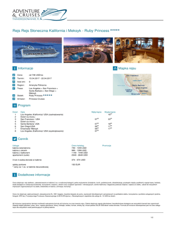 Rejs Rejs Słoneczna Kalifornia i Meksyk - Ruby Princess Informacje Cena: od 749 USD/os Termin: 15.04.2017 - 22.04.2017 Ilość dni: 8 Region: Ameryka Północna Trasa: Statek: Los Angeles > San Francisco > Santa Barbara > San Diego > Meksyk Ruby Princess Armator: Princess Cruises Mapka rejsu Program Dzień 1 2 3 4 5 6 7 8 Opis Los Angeles (Kalifornia)/ USA (zaokrętowanie) Dzień na morzu San Francisco / USA Dzień na morzu Santa Barbara/ USA San Diego/USA Ensenada/ Meksyk Los Angeles (Kalifornia)/ USA (wyokrętowanie) Wpłynięcie Wypłynięcie 1600 0700 2300 0700 0800 0800 0700 1800 1700 1700 Cennik Usługa kabina wewnętrzna kabina z oknem kabina z balkonem apartament (suite) Cena katalog. 749 - 1049 USD 999 - 1299 USD 1149 - 1449 USD 2349 - 2649 USD 3 lub 4 osoba dorosła w kabinie 374 - 674 USD opłaty portowe * ceny za 1 os. w kabinie dwuosobowej 155 EUR Promocja Dodatkowe informacje Cena obejmuje: rejs statkiem, zakwaterowanie w kabinie 2 os. w wybranej kategorii, pełne wyżywienie (śniadanie, lunch, podwieczorek, obiadokolację, przekąski między posiłkami) napoje kawa, herbata, woda dostępne w restauracji bufetowej, korzystanie z basenu, siłowni oraz urządzeń sportowo – rekreacyjnych, serwis kabinowy i bagażowy podczas wejścia i zejścia ze statku, udział we wszystkich imprezach organizowanych na statku (widowiska w teatrze, animacje, koncerty). Cena nie obejmuje: opłat portowych, ubezpieczenia KL, NW i bagażu, kosztów dojazdu do portu, wycieczek fakultatywnych zamawianych na pokładzie statku, korzystania z punktów usługowych (pralnia, fotograf, SPA itp.),Turystycznego Funduszu Gwarancyjnego (2,90 EUR/rejs/os.), Obowiązkowych napiwków dla załogi ok. 12 USD/os./dzień. All Inclusive (opcjonalnie) Istnieje możliwość wykupienia formuły all inclusive na czas trwania rejsu. Pakiet obejmuje napoje alkoholowe i bezalkoholowe dostępne we wszystkich barach bez ograniczeń (Napoje objęte pakietem: piwo, wino, napoje gazowane, likiery, koktajle, wódka, koniak, whisky itp.) Koszt pakietu 56,35 USD/dzień osoba dorosła. Formuła all inclusive obowiązkowa jest na czas całego rejsu dla wszystkich osób podróżujących w jednej kabinie. 1/2 UWAGA: podane ceny mają charakter orientacyjny, zmieniają się w zależności od obowiązujących taryf oraz dostępności poszczególnych kategorii kabin. Aby potwierdzić cenę należy skontaktować się z działem rezerwacji. 2/2 Powered by TCPDF (www.tcpdf.org)