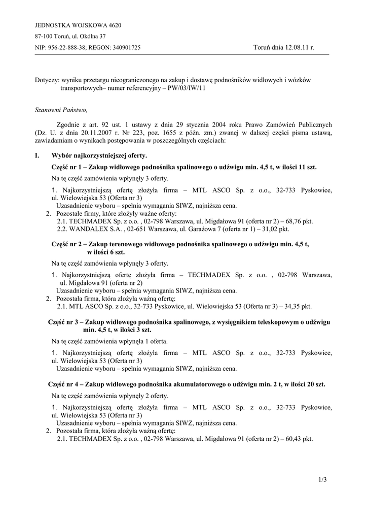JEDNOSTKA WOJSKOWA 4620 87-100 Toruń, ul. Okólna 37 NIP: 956-22-888-38; REGON: 340901725 Toruń dnia 12.08.11 r. Dotyczy: wyniku przetargu nieograniczonego na zakup i dostawę podnośników widłowych i wózków transportowych– numer referencyjny – PW/03/IW/11 Szanowni Państwo, Zgodnie z art. 92 ust. 1 ustawy z dnia 29 stycznia 2004 roku Prawo Zamówień Publicznych (Dz. U. z dnia 20.11.2007 r. Nr 223, poz. 1655 z późn. zm.) zwanej w dalszej części pisma ustawą, zawiadamiam o wynikach postępowania w poszczególnych częściach: I. Wybór najkorzystniejszej oferty. Część nr 1 – Zakup widłowego podnośnika spalinowego o udźwigu min. 4,5 t, w ilości 11 szt. Na tę część zamówienia wpłynęły 3 oferty. 1. Najkorzystniejszą ofertę złoŜyła firma – MTL ASCO Sp. z o.o., 32-733 Pyskowice, ul. Wielowiejska 53 (Oferta nr 3) Uzasadnienie wyboru – spełnia wymagania SIWZ, najniŜsza cena. 2. Pozostałe firmy, które złoŜyły waŜne oferty: 2.1. TECHMADEX Sp. z o.o. , 02-798 Warszawa, ul. Migdałowa 91 (oferta nr 2) – 68,76 pkt. 2.2. WANDALEX S.A. , 02-651 Warszawa, ul. GaraŜowa 7 (oferta nr 1) – 31,02 pkt. Część nr 2 – Zakup terenowego widłowego podnośnika spalinowego o udźwigu min. 4,5 t, w ilości 6 szt. Na tę część zamówienia wpłynęły 3 oferty. 1. Najkorzystniejszą ofertę złoŜyła firma – TECHMADEX Sp. z o.o. , 02-798 Warszawa, ul. Migdałowa 91 (oferta nr 2) Uzasadnienie wyboru – spełnia wymagania SIWZ, najniŜsza cena. 2. Pozostała firma, która złoŜyła waŜną ofertę: 2.1. MTL ASCO Sp. z o.o., 32-733 Pyskowice, ul. Wielowiejska 53 (Oferta nr 3) – 34,35 pkt. Część nr 3 – Zakup widłowego podnośnika spalinowego, z wysięgnikiem teleskopowym o udźwigu min. 4,5 t, w ilości 3 szt. Na tę część zamówienia wpłynęła 1 oferta. 1. Najkorzystniejszą ofertę złoŜyła firma – MTL ASCO Sp. z o.o., 32-733 Pyskowice, ul. Wielowiejska 53 (Oferta nr 3) Uzasadnienie wyboru – spełnia wymagania SIWZ, najniŜsza cena. Część nr 4 – Zakup widłowego podnośnika akumulatorowego o udźwigu min. 2 t, w ilości 20 szt. Na tę część zamówienia wpłynęły 2 oferty. 1. Najkorzystniejszą ofertę złoŜyła firma – MTL ASCO Sp. z o.o., 32-733 Pyskowice, ul. Wielowiejska 53 (Oferta nr 3) Uzasadnienie wyboru – spełnia wymagania SIWZ, najniŜsza cena. 2. Pozostała firma, która złoŜyła waŜną ofertę: 2.1. TECHMADEX Sp. z o.o. , 02-798 Warszawa, ul. Migdałowa 91 (oferta nr 2) – 60,43 pkt. 1/3 Część nr 5 – Zakup widłowego podnośnika akumulatorowego o udźwigu min. 2 t z wagą, w ilości 20 szt. Na tę część zamówienia wpłynęły 2 oferty. 1. Najkorzystniejszą ofertę złoŜyła firma – MTL ASCO Sp. z o.o., 32-733 Pyskowice, ul. Wielowiejska 53 (Oferta nr 3) Uzasadnienie wyboru – spełnia wymagania SIWZ, najniŜsza cena. 2. Pozostała firma, która złoŜyła waŜną ofertę: 2.1. TECHMADEX Sp. z o.o. , 02-798 Warszawa, ul. Migdałowa 91 (oferta nr 2) – 67,66 pkt. Część nr 7 – Zakup widłowego podnośnika spalinowego do przeładunku kontenerów z wagą, w ilości 7 szt. Na tę część zamówienia wpłynęła 1 oferta. 1. Najkorzystniejszą ofertę złoŜyła firma – MTL ASCO Sp. z o.o., 32-733 Pyskowice, ul. Wielowiejska 53 (Oferta nr 3) Uzasadnienie wyboru – spełnia wymagania SIWZ, najniŜsza cena. Część nr 8 – Zakup akumulatorowego wózka transportowego, w ilości 32 szt. Na tę część zamówienia wpłynęły 2 oferty. 1. Najkorzystniejszą ofertę złoŜyła firma – MTL ASCO Sp. z o.o., 32-733 Pyskowice, ul. Wielowiejska 53 (Oferta nr 3) Uzasadnienie wyboru – spełnia wymagania SIWZ, najniŜsza cena. 2. Pozostała firma, która złoŜyła waŜną ofertę: 2.1. TECHMADEX Sp. z o.o. , 02-798 Warszawa, ul. Migdałowa 91 (oferta nr 2) – 79,76 pkt. II. UniewaŜnienie postępowania. Dotyczy części nr 6 – Zakup widłowego podnośnika spalinowego do przeładunku kontenerów, w ilości 8 szt. Na podstawie art. 93 ust. 1 pkt 1 ustawy z dnia 29 stycznia 2004r „Prawo Zamówień Publicznych” (Dz. U. z dnia 20.11.2007 r. Nr 223, poz. 1655 z późn zm.) Zamawiający uniewaŜnił postępowanie w części nr 6, gdyŜ nie została złoŜona Ŝadna oferta. III. Wykonawca, którego oferta została odrzucona. WANDALEX S.A. , 02-651 Warszawa, ul. GaraŜowa 7 (oferta nr 1) Dotyczy część nr 2 – Zakup terenowego widłowego podnośnika spalinowego o udźwigu min. 4,5 t, w ilości 6 szt. Uzasadnienie faktyczne i prawne: Po dokonaniu oceny zgodności złoŜonych ofert z wymaganiami zawartymi w SIWZ, Zamawiający wezwał firmę WANDALEX S.A. z siedzibą w Warszawie pismem nr 333/KJ/2011 z dnia 05.08.2011 r. do wyjaśnienia czy oferowany wózek terenowy posiada mechanizm róŜnicowy. W odpowiedzi jakiej udzielił (pismo z dnia 08.08.2011 r.) Wykonawca nie wykazał spełnienia tego parametru. Wobec powyŜszego Zamawiający na podstawie art. 89 ust 1 pkt 2 Ustawy z dnia 29 stycznia 2004 r. Prawo Zamówień Publicznych (Dz. U. z dnia 20.11.2007 r. Nr 223, poz. 1655 z późn. zm.) odrzuca ofertę nr 2 dotyczącą części nr 2, poniewaŜ jej treść nie odpowiada treści specyfikacji istotnych warunków zamówienia 2/3 IV. Na podstawie art. 92 ust 1 pkt 4 ustawy Zamawiający informuję, Ŝe zgodnie z art. 94 ust. 1 pkt. 1 ustawy umowa w sprawie zamówienia publicznego w zakresie części 1,2,4,5,8 moŜe zostać zawarta w terminie nie krótszym niŜ 10 dni, od dnia przesłania zawiadomienia o wyborze najkorzystniejszej oferty z zastrzeŜeniem art. 183 ustawy natomiast w zakresie części nr 3 i 7 zgodnie z art. 94 ust. 2 pkt. 1 ustawy umowa w sprawie zamówienia publicznego moŜe zostać zawarta z pominięciem terminów, o których mowa w art. 94 ust. 1 pkt. 1 ustawy. Wobec czynności podjętych przez Zamawiającego w toku postępowania oraz w przypadku ich zaniechania, do których Zamawiający jest obowiązany na podstawie ustawy, uczestnikowi postępowania przysługuje prawo wniesienia o