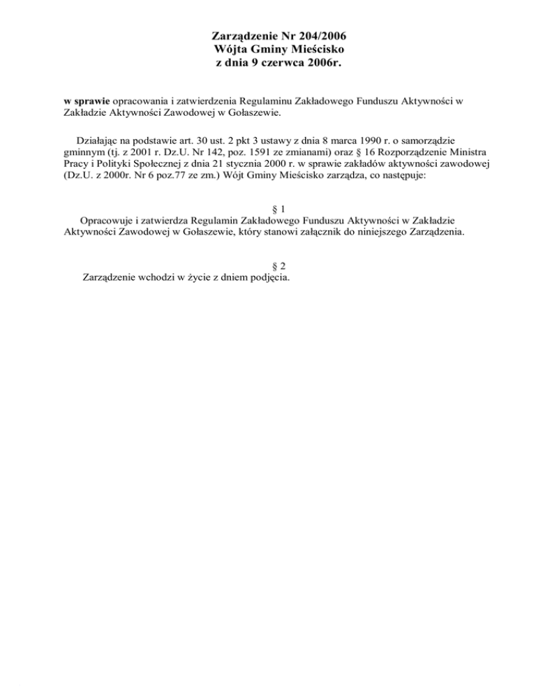 Zarządzenie Nr 204/2006 Wójta Gminy Mieścisko z dnia 9 czerwca 2006r. w sprawie opracowania i zatwierdzenia Regulaminu Zakładowego Funduszu Aktywności w Zakładzie Aktywności Zawodowej w Gołaszewie. Działając na podstawie art. 30 ust. 2 pkt 3 ustawy z dnia 8 marca 1990 r. o samorządzie gminnym (tj. z 2001 r. Dz.U. Nr 142, poz. 1591 ze zmianami) oraz § 16 Rozporządzenie Ministra Pracy i Polityki Społecznej z dnia 21 stycznia 2000 r. w sprawie zakładów aktywności zawodowej (Dz.U. z 2000r. Nr 6 poz.77 ze zm.) Wójt Gminy Mieścisko zarządza, co następuje: §1 Opracowuje i zatwierdza Regulamin Zakładowego Funduszu Aktywności w Zakładzie Aktywności Zawodowej w Gołaszewie, który stanowi załącznik do niniejszego Zarządzenia. §2 Zarządzenie wchodzi w życie z dniem podjęcia. Załącznik do Zarządzenie Nr 204/2006 Wójta Gminy Mieścisko z dnia 9 czerwca 2006r. REGULAMIN ZAKŁADOWEGO FUNDUSZU AKTYWNOŚCI Część I Postanowienia ogólne Podstawą prawną do opracowania Zakładowego Funduszu Aktywności jest: 1. Ustawa o rehabilitacji zawodowej i społecznej oraz zatrudnianiu osób niepełnosprawnych z dnia 27 sierpnia 1997r. ( Dz. U. z 1997r. Nr 123 poz.776 ze zm.) 2. Rozporządzenie Ministra Pracy i Polityki Społecznej z dnia 21 stycznia 2000 r. w sprawie zakładów aktywności zawodowej (Dz.U. z 2000r. Nr 6 poz.77 ze zm.) 3. Statut Zakładu Aktywności Zawodowej w Gołaszewie, zatwierdzonego Uchwałą Nr XXV/236/06 Rady Gminy Mieścisko z dnia 11 kwietnia 2006 r. §1 Niniejszy regulamin określa zasady wykorzystania środków Zakładowego Funduszu Aktywności zwanego dalej „Funduszem Aktywności” w Zakładzie Aktywności Zawodowej, którego organizatorem jest Gmina Mieścisko. §2 1. Fundusz Aktywności tworzony jest na bieżąco. 2. Dochodami Funduszu Aktywności są w szczególności: a) kwoty pochodzące ze zwolnień podatkowych, b) wpływy z dochodu związanego z prowadzeniem działalności gospodarczej przez Zakład Aktywności Zawodowej c) wpływy z zapisów i darowizn. 3. Niewykorzystane w danym roku środki funduszu przechodzą na rok następny. 4. Organizator Zakładu Aktywności Zawodowej prowadzi: a) ewidencję dochodów i wydatków funduszu aktywności, b) odrębny rachunek bankowy dla wyodrębnionych środków funduszu aktywności w wysokości 30 % rocznych wpływów z 2 aktywności przeznaczeniem na poprawę warunków pracy niepełnosprawnych pracowników oraz w wysokości 20 % z przeznaczeniem na pomoc indywidualną dla niepełnosprawnych pracowników, pozostałe 50% z przeznaczeniem na wydatki wymienione w §4 pkt 2,3,4,5. Część II Rodzaje wydatków Funduszu §3 Środki funduszu aktywności przeznaczone są na finansowanie rehabilitacji zawodowej i społecznej, przygotowanie do życia w otwartym środowisku oraz pomoc w realizacji pełnego, niezależnego, samodzielnego i aktywnego życia na miarę indywidualnych możliwości osób niepełnosprawnych zaliczonych do znacznego stopnia niepełnosprawności w Zakładzie Aktywności Zawodowej w ramach stosunku pracy lub umowy o pracę nakładczą. §4 Środki Funduszu Aktywności przeznaczone są na następujące rodzaje wydatków: 1. usprawnienie i dodatkowe oprzyrządowanie stanowisk pracy, wspomagające samodzielne funkcjonowanie osób niepełnosprawnych w Zakładzie Aktywności Zawodowej, 2. zakup sprzętu i wyposażenia pomagającego osobie niepełnosprawnej w samodzielnym życiu i uczestnictwie w życiu społecznym , 3. pomoc w przygotowaniu osób niepełnosprawnych do pracy poza Zakładem Aktywności Zawodowej i wyrównywaniu szans w nowym miejscu pracy, 4. pomoc w przygotowaniu, budowie, remoncie i wyposażeniu indywidualnych i zbiorowych form mieszkalnictwa chronionego dla osób niepełnosprawnych, które nie znajdują oparcia we własnej rodzinie lub podejmują świadome decyzje samodzielnego życia, 5. rekreację i uczestnictwo osób niepełnosprawnych w życiu kulturalnym, sportowym i turystycznym, 6. pomoc w zaspokajaniu innych indywidualnych potrzeb zatrudnionych osób niepełnosprawnych, których katalog ustala dokument zwany „Pomoc Indywidualna dla pracowników niepełnosprawnych w ZAZ” opracowany do 15 lutego każdego roku przez Zespół Programowy ZAZ i zatwierdzany przez Wójta Gminy. Część III Szczegółowe zasady wykorzystania środków Funduszu Aktywności 3 §5 1. Wydatki, o których mowa w § 4 pkt 1-5 finansowane są ze środków Funduszu Aktywności w całości zgodnie z regulaminem opracowanym przez Kierownika Zakładu. 2. Wydatki o których mowa w pkt.6 § 4 finansowane są ze środków Funduszu Aktywności opracowanych przez zespół programowy i zatwierdzony przez Wójta Gminy. §6 1. Na usprawnienie i dodatkowe oprzyrządowanie stanowisk pracy, wspomagające samodzielne funkcjonowanie osób niepełnosprawnych w Zakładzie Aktywności Zawodowej, o którym mowa w § 4 pkt 1 przeznacza się do 30 % rocznych wpływów do funduszu. 2. Na pomoc indywidualną, o której mowa w § 4 pkt 6 przeznacza się rocznie do 20 % środków funduszu aktywności. 3. Na pozostałe rodzaje wydatków, o których mowa w § 4 pkt 2,3,4,5 przeznacza się rocznie do 50 % środków funduszu aktywności. 4. Pomoc indywidualna, o której mowa w ust.2 udzielana być może jako pożyczka nieoprocentowana, lub jako pomoc bezzwrotna w postaci dofinansowania. 5. Pomoc w zakupie sprzętu i wyposażenia pomagającego osobie niepełnosprawnej w samodzielnym życiu i uczestnictwie w życiu społecznym udzielana może być jako pożyczka nieoprocentowana, lub jako pomoc bezzwrotna w postaci dofinansowania. 6. Pomoc w przygotowaniu, budowie, remoncie i wyposażeniu indywidualnych i zbiorowych form mieszkalnictwa chronionego dla osób niepełnosprawnych, które nie znajdują oparcia we własnej rodzinie lub podejmują świadome decyzje samodzielnego życia, udzielana może jako pożyczka nieoprocentowana, lub jako pomoc bezzwrotna w postaci dofinansowania §7 1. Pomoc na wydatki, o których mowa w §