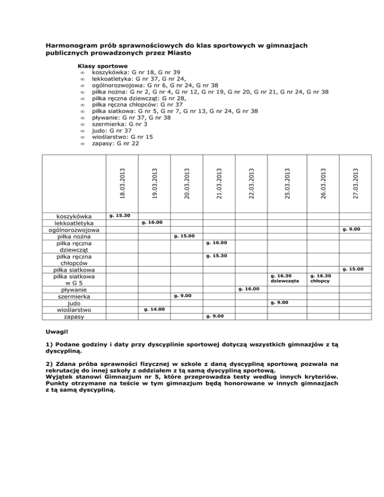 Harmonogram prób sprawnościowych do klas sportowych w gimnazjach publicznych prowadzonych przez Miasto koszykówka lekkoatletyka ogólnorozwojowa piłka noŜna piłka ręczna dziewcząt piłka ręczna chłopców piłka siatkowa piłka siatkowa wG5 pływanie szermierka judo wioślarstwo zapasy 27.03.2013 26.03.2013 25.03.2013 22.03.2013 21.03.2013 20.03.2013 19.03.2013 18.03.2013 Klasy sportowe • koszykówka: G nr 18, G nr 39 • lekkoatletyka: G nr 37, G nr 24, • ogólnorozwojowa: G nr 6, G nr 24, G nr 38 • piłka noŜna: G nr 2, G nr 4, G nr 12, G nr 19, G nr 20, G nr 21, G nr 24, G nr 38 • piłka ręczna dziewcząt: G nr 28, • piłka ręczna chłopców: G nr 37 • piłka siatkowa: G nr 5, G nr 7, G nr 13, G nr 24, G nr 38 • pływanie: G nr 37, G nr 38 • szermierka: G nr 3 • judo: G nr 37 • wioślarstwo: G nr 15 • zapasy: G nr 22 g. 15.30 g. 16.00 g. 9.00 g. 15.00 g. 16.00 g. 15.30 g. 15.00 g. 16.30 dziewczęta g. 16.30 chłopcy g. 16.00 g. 9.00 g. 9.00 g. 14.00 g. 9.00 Uwagi! 1) Podane godziny i daty przy dyscyplinie sportowej dotyczą wszystkich gimnazjów z tą dyscypliną. 2) Zdana próba sprawności fizycznej w szkole z daną dyscypliną sportową pozwala na rekrutację do innej szkoły z oddziałem z tą samą dyscypliną sportową. Wyjątek stanowi Gimnazjum nr 5, które przeprowadza testy według innych kryteriów. Punkty otrzymane na teście w tym gimnazjum będą honorowane w innych gimnazjach z tą samą dyscypliną.