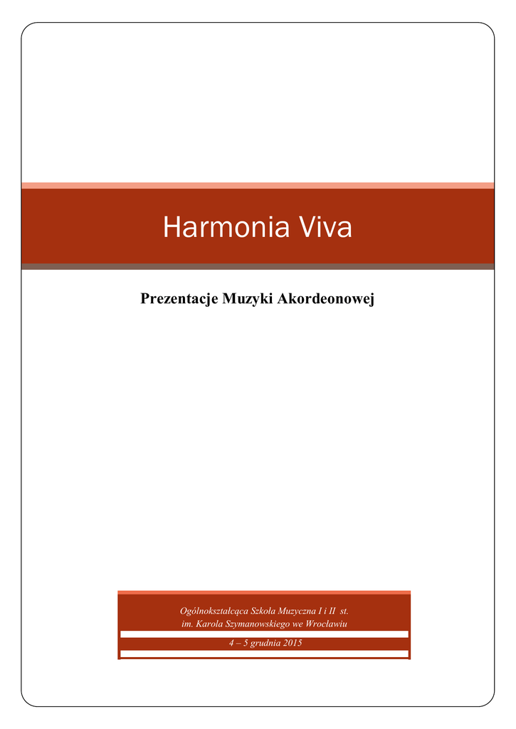 Harmonia Viva Prezentacje Muzyki Akordeonowej Ogólnokształcąca Szkoła Muzyczna I i II st. im. Karola Szymanowskiego we Wrocławiu 4 – 5 grudnia 2015 Harmonia Viva Prezentacje Muzyki Akordeonowej „XIII Harmonia Viva”, to wznowienie i kontynuacja, w nieco zmienionej formie, Wrocławskiego Konkursu Akordeonowego, odbywającego się cyklicznie i realizowanego przez Centrum Kultury „ZAMEK”, nieprzerwanie do 2009 roku. Po 5 letniej przerwie, nowym organizatorem Konkursu została Ogólnokształcąca Szkoła Muzyczna I i II st. im. Karola Szymanowskiego we Wrocławiu. Ideą konkursu Harmonia Viva jest upowszechnianie gry na akordeonie, prezentacja osiągnięć artystycznych i pedagogicznych, podniesienie poziomu artystycznego, promocja młodych, utalentowanych akordeonistów oraz konsultacje i poszerzenie wiedzy z zakresu gry na tym pięknym i wymagającym instrumencie. Konkurs: Organizatorem XIII edycji konkursu Harmonia Viva jest Ogólnokształcąca Szkoła Muzyczna I i II st. im. Karola Szymanowskiego we Wrocławiu. Celem konkursu jest: ocena poziomu nauczania gry na akordeonie, wymiana doświadczeń metodycznych pomiędzy jurorami a pedagogami szkół muzycznych, prezentacja i promocja uczniów oraz motywowanie ich do pracy poprzez współzawodnictwo, popularyzacja muzyki akordeonowej, integracja środowiska akordeonowego. Harmonia Viva 2015r. Konkurs Harmonia Viva odbędzie się w siedzibie OSM I i II st. im. Karola Szymanowskiego we Wrocławiu w dniach 4-5 grudnia 2015 r. Dokładnie wypełnioną Kartę zgłoszenia uczestnika wraz z dowodem wpłaty wpisowego należy wysłać w nieprzekraczalnym terminie do dnia 10.11.2015 r. na adres szkoły lub adres e-mail podany poniżej: 1 OSM I i II st. im. Karola Szymanowskiego we Wrocławiu. 50 – 044 Wrocław; ul. Piłsudskiego 25 Tel. 71 736 60 60; fax. 71 736 60 12 e-mail: [email protected] Nr konta: 75101016740023811391300000 Liczba uczestników jest ograniczona, decyduje data wpływu zgłoszenia. REGULAMIN Wszelkie koszty związane z dojazdem, ewentualnym zakwaterowaniem lub wyżywieniem pokrywają szkoły delegujące. Organizatorzy zapewniają jedynie poczęstunek dla uczestników Konkursu. Konkurs Harmoia Viva jest konkursem jednoetapowym i otwartym dla publiczności. Uczestnicy Konkursu zobowiązani są wykonać program zróżnicowany pod względem charakteru i stylu. Punktacja będzie przyznawana w skali 0 – 25 przez poszczególnych Członków Jury. Jury decyduje o podziale miejsc i nagród. Decyzje Jury są niepodważalne i ostateczne. Jury może przyznać Grand Prix za wybitną prezentację wyłonioną ze wszystkich siedmiu kategorii Skład Jury powołuje Dyrektor OSM I i II st. we Wrocławiu. Przesłuchania odbędą się w kolejności ustalonej przez organizatora. Dla wszystkich uczestników konkursu Harmonia Viva przewidziane Harmonia Viva 2015r. są pamiątkowe dyplomy uczestnictwa, a dla uczniów wyróżnionych dyplomy z określeniem zajętego miejsca oraz nagrody rzeczowe. Laureaci pierwszych miejsc wszystkich kategorii wezmą udział w Koncercie Laureatów. Utwory do Koncertu Laureatów wybierze Jury. Udział nagrodzonych uczestników 2 w Koncercie Laureatów jest obowiązkowy. Dyplomy i nagrody będą do odebrania wyłącznie w trakcie Koncertu Laureatów i nie będą przesyłane. Podział na kategorie: Kategoria I soliści PSM i OSM I st. (klasy I –III) (I i II cykl młodzieżowy) (12 lat) program 6 minut. Kategoria II soliści PSM i OSM I st. (klasy IV – VI) (III i IV cykl młodzieżowy) (15 lat) program 8 minut. Kategoria III soliści PSM II st. i OSM II st. (klasy I –III) (powyżej 15 lat) program 12 minut. Kategoria IV soliści PSM II st. i OSM II st. (klasy IV –VI) (powyżej 15 lat) program 15 minut. Kategoria V Studenci wyższych uczelni muzycznych zróżnicowany program 20 minut Kategoria A zespoły kam. PSM i OSM I st. program 10 min Kategoria B zespoły kam. PSM i OSM II st. program 12 min Wpisowe: kategorie I – IV 90 PLN kategoria V 100 PLN, Harmonia Viva 2015r. kategorie A, B, 30 PLN od osoby 3 XIII HARMONIA VIVA WROCŁAW 2015 KARTA ZGŁOSZENIA SOLISTY Imię i Nazwisko: Kategoria: Klasa: Nauczyciel: Szkoła delegująca: Program: 1) 2) Harmonia Viva 2015r. 3) 4) 4