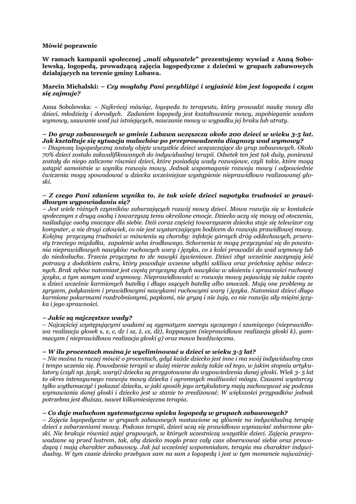 Mówić poprawnie W ramach kampanii społecznej „mali obywatele” prezentujemy wywiad z Anną Sobolewską, logopedą, prowadzącą zajęcia logopedyczne z dziećmi w grupach zabawowych działających na terenie gminy Lubawa. Marcin Michalski: – Czy mogłaby Pani przybliżyć i wyjaśnić kim jest logopeda i czym się zajmuje? Anna Sobolewska: – Najkrócej mówiąc, logopeda to terapeuta, który prowadzi naukę mowy dla dzieci, młodzieży i dorosłych. Zadaniem logopedy jest kształtowanie mowy, zapobieganie wadom wymowy, usuwanie wad już istniejących, nauczanie mowy w wypadku jej braku lub utraty. – Do grup zabawowych w gminie Lubawa uczęszcza około 200 dzieci w wieku 3-5 lat. Jak kształtuje się sytuacja maluchów po przeprowadzeniu diagnozy wad wymowy? – Diagnozą logopedyczną zostały objęte wszystkie dzieci uczęszczające do grup zabawowych. Około 70% dzieci zostało zakwalifikowanych do indywidualnej terapii. Odsetek ten jest tak duży, ponieważ zostały do niego zaliczone również dzieci, które posiadają wady rozwojowe, czyli takie, które mogą ustąpić samoistnie w wyniku rozwoju mowy. Jednak wspomaganie rozwoju mowy i odpowiednie ćwiczenia mogą spowodować u dziecka wcześniejsze wystąpienie nieprawidłowo realizowanej głoski. – Z czego Pani zdaniem wynika to, że tak wiele dzieci napotyka trudności w prawidłowym wypowiadaniu się? – Jest wiele różnych czynników zaburzających rozwój mowy dzieci. Mowa rozwija się w kontakcie społecznym z drugą osobą i towarzyszą temu określone emocje. Dziecko uczy się mowy od otoczenia, naśladując osoby znaczące dla siebie. Dziś coraz częściej towarzyszem dziecka staje się telewizor czy komputer, a nie drugi człowiek, co nie jest wystarczającym bodźcem do rozwoju prawidłowej mowy. Kolejną przyczyną trudności w mówieniu są choroby: infekcje górnych dróg oddechowych, przerosty trzeciego migdałka, zapalenie ucha środkowego. Schorzenia te mogą przyczyniać się do powstania nieprawidłowych nawyków ruchowych warg i języka, co z kolei prowadzi do wad wymowy lub do niedosłuchu. Trzecia przyczyna to złe nawyki żywieniowe. Dzieci zbyt wcześnie zaczynają jeść potrawy z dodatkiem cukru, który powoduje wczesne ubytki szkliwa oraz próchnicę zębów mlecznych. Brak zębów natomiast jest częstą przyczyną złych nawyków w ułożeniu i sprawności ruchowej języka, a tym samym wad wymowy. Nieprawidłowości w rozwoju mowy pojawiają się także często u dzieci wcześnie karmionych butelką i długo ssących butelkę albo smoczek. Mają one problemy ze zgryzem, połykaniem i prawidłowymi nawykami ruchowymi warg i języka. Natomiast dzieci długo karmione pokarmami rozdrobnionymi, papkami, nie gryzą i nie żują, co nie rozwija siły mięśni języka i jego sprawności. – Jakie są najczęstsze wady? – Najczęściej występującymi wadami są sygmatyzm szeregu syczącego i szumiącego (nieprawidłowa realizacja głosek s, z, c, dz i sz, ż, cz, dż), kappacyzm (nieprawidłowa realizacja głoski k), gammacyzm ( nieprawidłowa realizacja głoski g) oraz mowa bezdźwięczna. – W ilu procentach można je wyeliminować u dzieci w wieku 3-5 lat? – Nie można tu raczej mówić o procentach, gdyż każde dziecko jest inne i ma swój indywidualny czas i tempo uczenia się. Powodzenie terapii w dużej mierze zależy także od tego, w jakim stopniu artykulatory (czyli np. język, wargi) dziecka są przygotowane do wypowiedzenia danej głoski. Wiek 3- 5 lat to okres intensywnego rozwoju mowy dziecka i ogromnych możliwości mózgu. Czasami wystarczy tylko wytłumaczyć i pokazać dziecku, w jaki sposób jego artykulatory mają zachowywać się podczas wymawiania danej głoski i dziecko jest w stanie to zrealizować. W większości przypadków jednak potrzebna jest dłuższa, nawet kilkumiesięczna terapia. – Co daje maluchom systematyczna opieka logopedy w grupach zabawowych? – Zajęcia logopedyczne w grupach zabawowych nastawione są głównie na indywidualną terapię dzieci z zaburzeniami mowy. Podczas terapii, dzieci uczą się prawidłowo wymawiać zaburzone głoski. Nie brakuje również zajęć grupowych, w których uczestniczą wszystkie dzieci. Zajęcia przeprowadzane są przed lustrem, tak, aby dziecko mogło przez cały czas obserwować siebie oraz prowadzącą i mają charakter zabawowy. Jak już wcześniej wspomniałam, terapia ma charakter indywidualny. W tym czasie dziecko przebywa sam na sam z logopedą i jest w tym momencie najważniej- sze. Cała uwaga jest skupiona na dziecku, a ono czuje się docenione. Systematyczność zajęć pozwala na utrwalanie materiału. – Dziękuje za rozmowę. Anna Sobolewska, logopeda, prowadzącą zajęcia z dziećmi w grupach zabawowych działających na terenie gminy Lubawa. Absolwentka Uniwersytetu Warmińsko-Mazurskiego (specjalność pedagogika wczesnoszkolna) oraz podyplomowego studium logopedii w Olsztyńskiej Szkole Wyższej im. Józefa Rusieckiego. MALI OBYWATELE – KAMPANIA SPOŁECZNA GRUPY ZABAWOWE DLA DZIECI W WIEKU 3-5 LAT