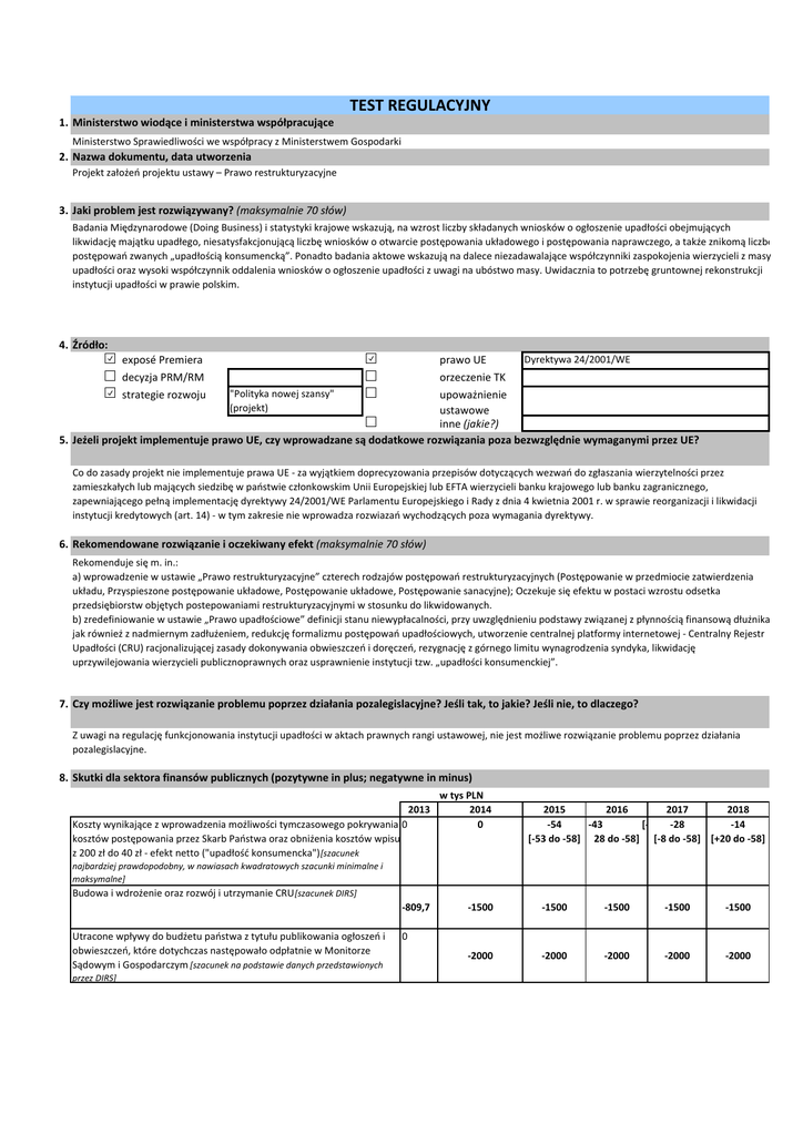 Kalkulacja/komentarz: zakłada się co prawda wprowadzenie nowych alternatywnych - rodzajów postępowań restrukturyzacyjnych, ale nie nie