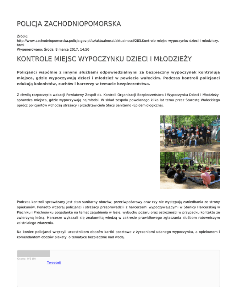 POLICJA ZACHODNIOPOMORSKA Źródło: http://www.zachodniopomorska.policja.gov.pl/sz/aktualnosci/aktualnosci/283,Kontrole-miejsc-wypoczynku-dzieci-i-mlodziezy. html Wygenerowano: Środa, 8 marca 2017, 14:50 KONTROLE MIEJSC WYPOCZYNKU DZIECI I MŁODZIEŻY Policjanci wspólnie z innymi służbami odpowiedzialnymi za bezpieczny wypoczynek kontrolują miejsca, gdzie wypoczywają dzieci i młodzież w powiecie wałeckim. Podczas kontroli policjanci edukują kolonistów, zuchów i harcerzy w temacie bezpieczeństwa. Z chwilą rozpoczęcia wakacji Powiatowy Zespół ds. Kontroli Organizacji Bezpieczeństwa i Wypoczynku Dzieci i Młodzieży sprawdza miejsca, gdzie wypoczywają najmłodsi. W skład zespołu powołanego kilka lat temu przez Starostę Wałeckiego oprócz policjantów wchodzą strażacy i przedstawiciele Stacji Sanitarno -Epidemiologicznej. Podczas kontroli sprawdzany jest stan sanitarny obozów, przeciwpożarowy oraz czy nie występują zaniedbania ze strony opiekunów. Ponadto wczoraj policjanci i strażacy przeprowadzili z harcerzami wypoczywającymi w Stanicy Harcerskiej w Piecniku i Próchnówku pogadankę na temat zagubienia w lesie, wybuchu pożaru oraz ostrożności w przypadku kontaktu ze zwierzyną leśną. Harcerze wykazali się znakomitą wiedzą w zakresie prawidłowego zgłaszania służbom ratowniczym zaistniałego zdarzenia. Na koniec policjanci wręczyli uczestnikom obozów kartki pocztowe z życzeniami udanego wypoczynku, a opiekunom i komendantom obozów plakaty o tematyce bezpiecznie nad wodą. Ocena: 0/5 (0) Tweetnij