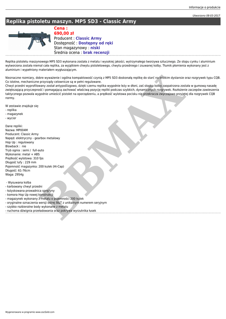 Informacje o produkcie Utworzono 08-03-2017 Replika pistoletu maszyn. MP5 SD3 - Classic Army Cena : 690,00 zł Producent : Classic Army Dostępność : Dostępny od ręki Stan magazynowy : niski Średnia ocena : brak recenzji Replika pistoletu maszynowego MP5 SD3 wykonana została z metalu i wysokiej jakości, wytrzymałego tworzywa sztucznego. Ze stopu cynku i aluminium wytworzona została niemal cała replika, za wyjątkiem chwytu pistoletowego, chwytu przedniego i zsuwanej kolby. Tłumik płomienia wykonany jest z aluminium i wypełniony materiałem wygłuszającym. W zestawie znajduje się: - replika - magazynek - wycior B Dane repliki: Nazwa: MP004M Producent: Classic Army Napęd: elektryczny - gearbox metalowy Hop Up : regulowany Blowback : nie Tryb ognia : semi / full-auto Wykonanie: metal + ABS Prędkość wylotowa: 310 fps Długość lufy : 229 mm Pojemność magazynka: 200 kulek (Hi-Cap) Długość: 61-76cm Waga: 2954g M AX Nieznaczne rozmiary, dobre wyważenie i ogólna kompaktowość czynią z MP5 SD3 doskonałą replikę do starć na krótkim dystansie oraz rozgrywek typu CQB. Co istotne, mechaniczne przyrządy celownicze są w pełni regulowane. Chwyt przedni wyprofilowany został antypoślizgowo, dzięki czemu replika wygodnie leży w dłoni, zaś stopka kolby zaopatrzona została w gumową nasadę zwiększającą przyczepność i pomagającą zachować właściwą pozycję repliki podczas szybkich, dynamicznych rozgrywek. Rozłożenie zaczepów zawieszenia taktycznego pozwala wygodnie umieścić pistolet na oporządzeniu, a prędkość wylotowa pocisku nie przekracza zwyczajowo przyjętej dla rozgrywek CQB normy. B - Wysuwana kolba - karbowany chwyt przedni - łożyskowana prowadnica sprężyny - komora Hop Up nowej konstrukcji - magazynek wykonany z metalu o pojemności 200 kulek - oryginalne oznaczenia wersji ostrej B&T z unikalnym numerem seryjnym - szybko rozbieralne body wykonane z metalu - ruchoma dźwignia przeładowania oraz pokrywa wyrzutnika łusek Wygenerowano w programie www.oscGold.com